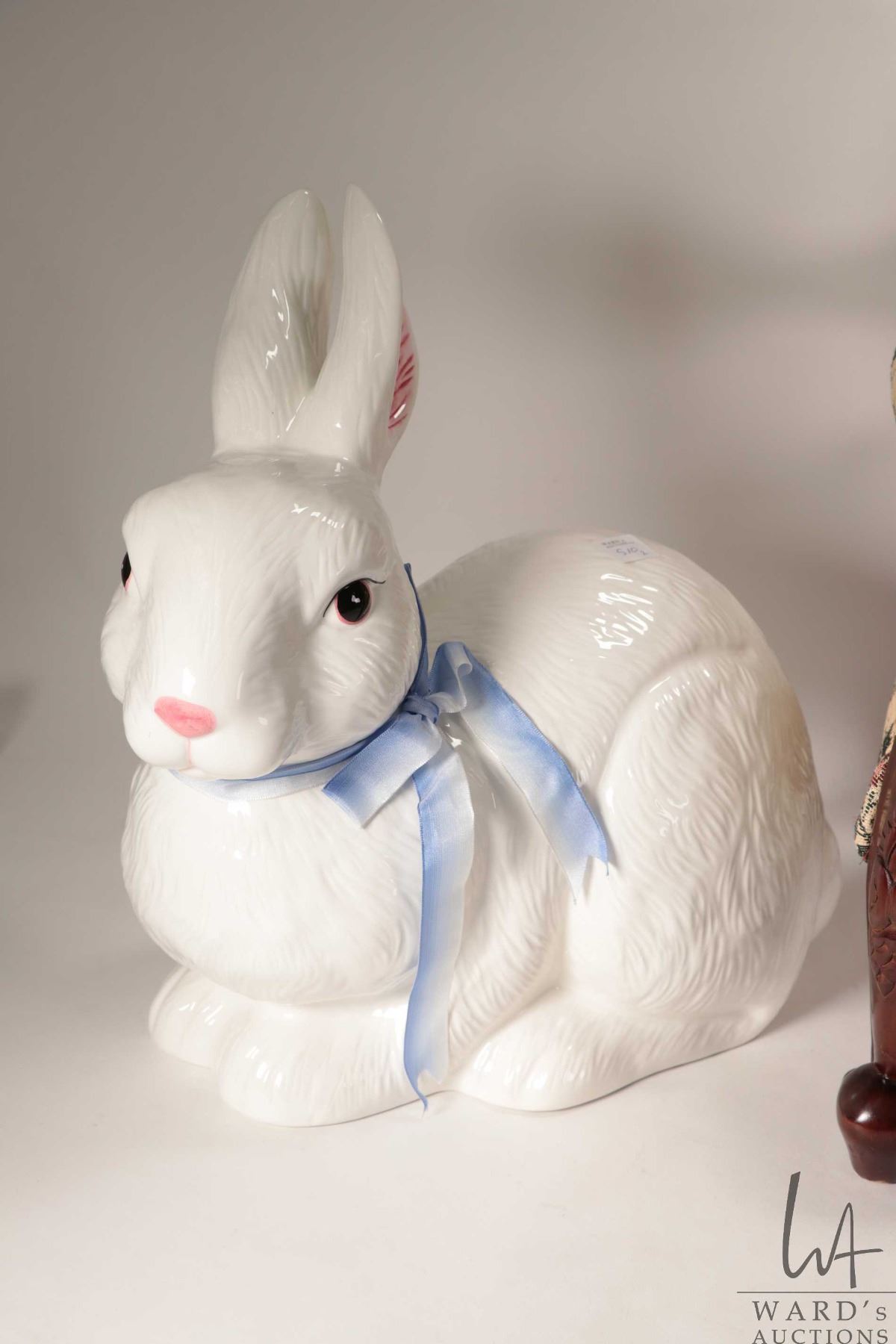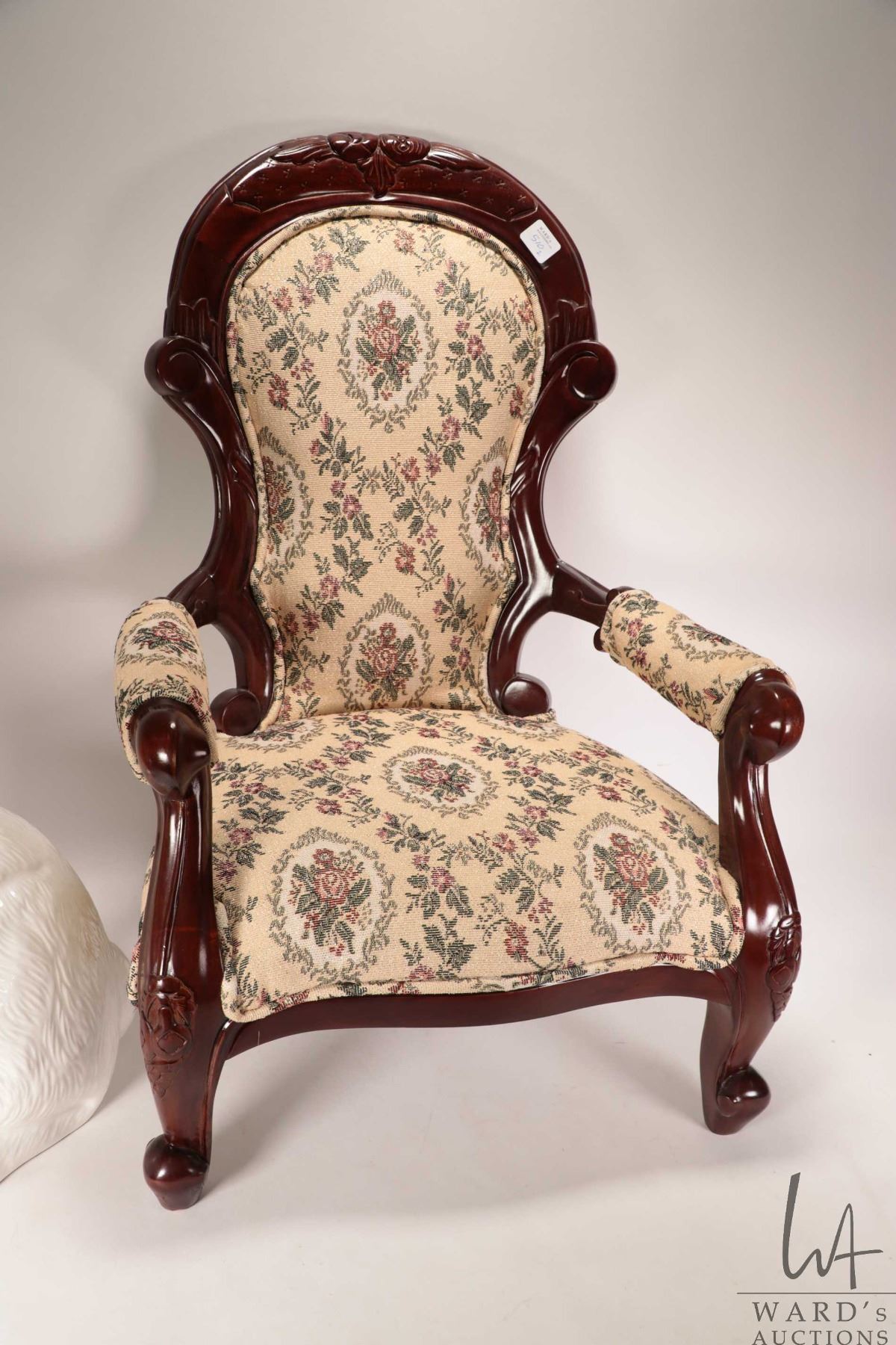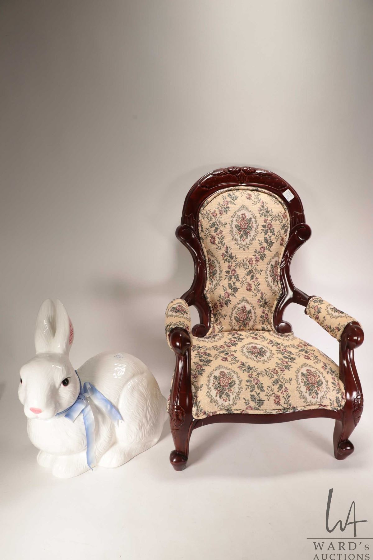 Lot 510 Child sized Victorian upholstered arm chair and a large glazed ceramic rabbit