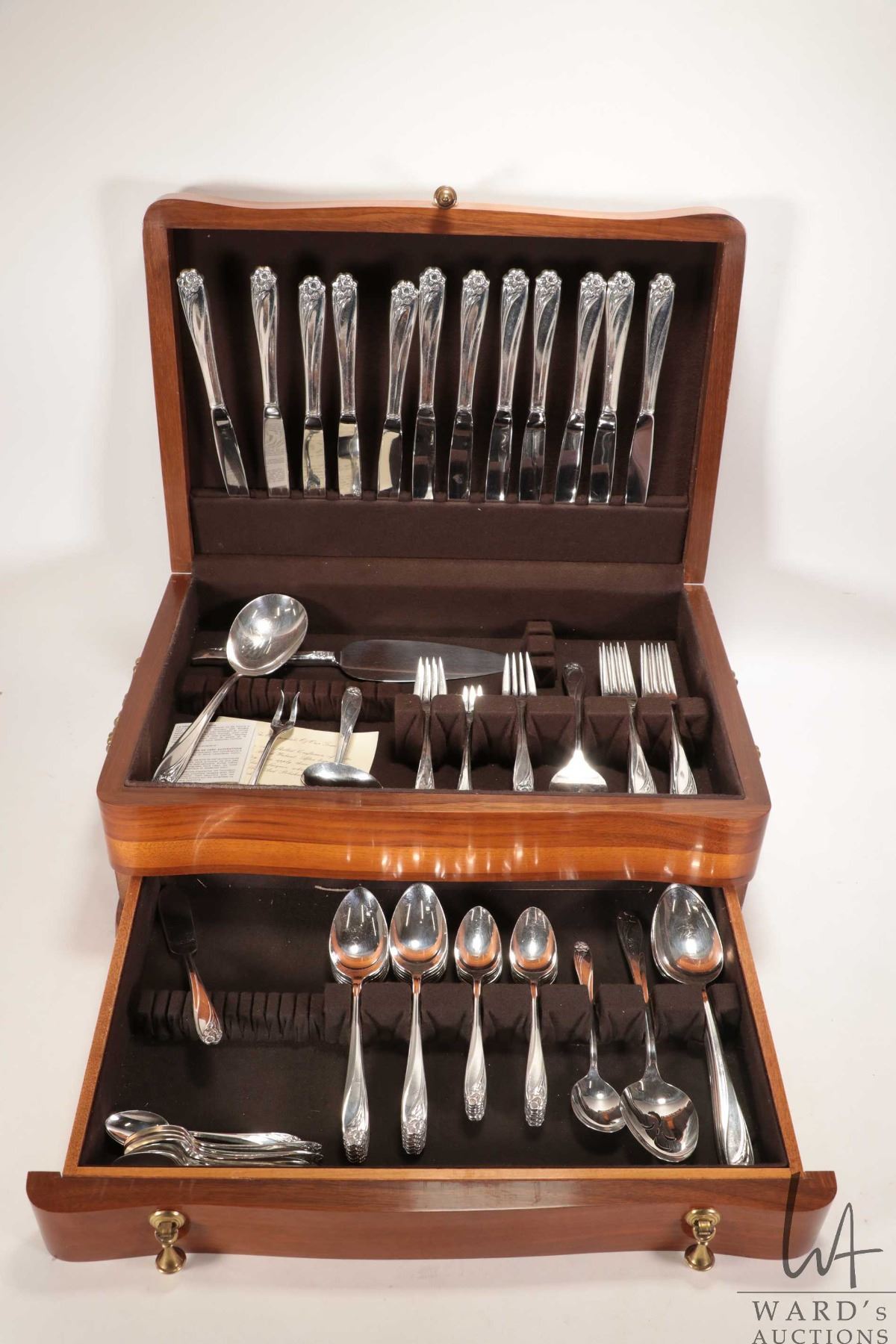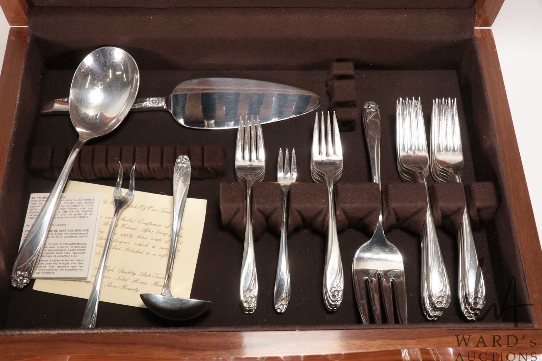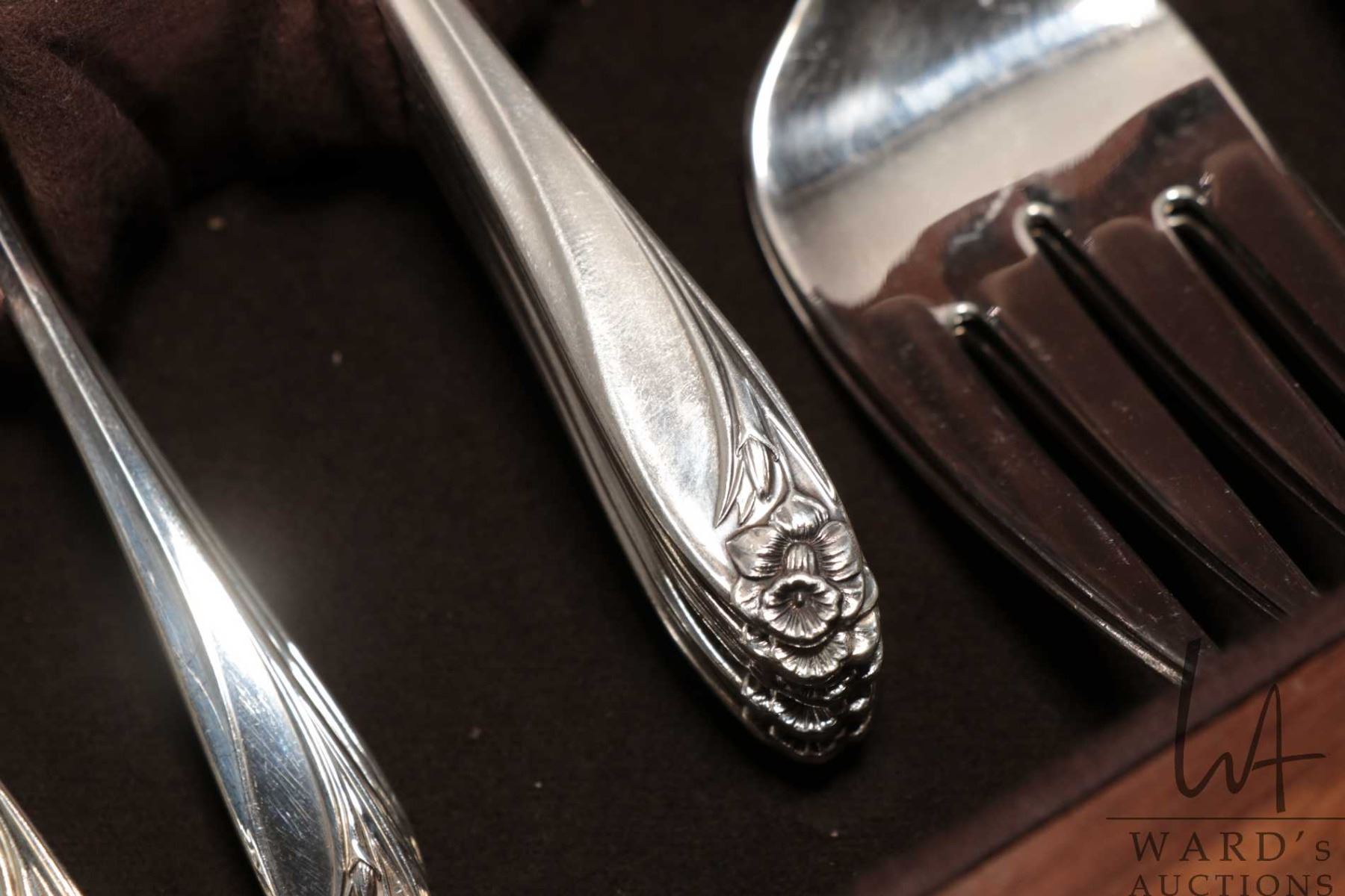Lot 518 Wooden canteen containing a selection of Rogers Bros. Daffodil silver plate flatware including setti