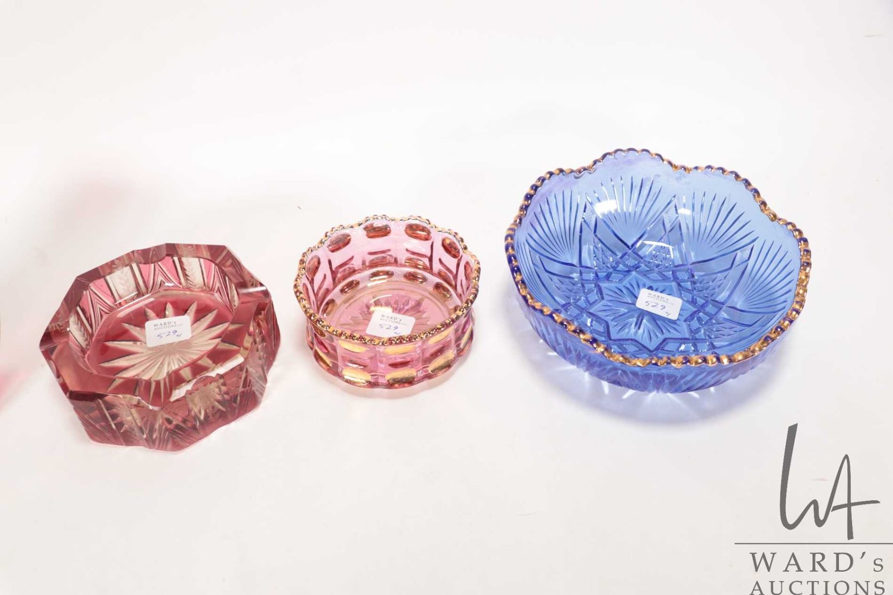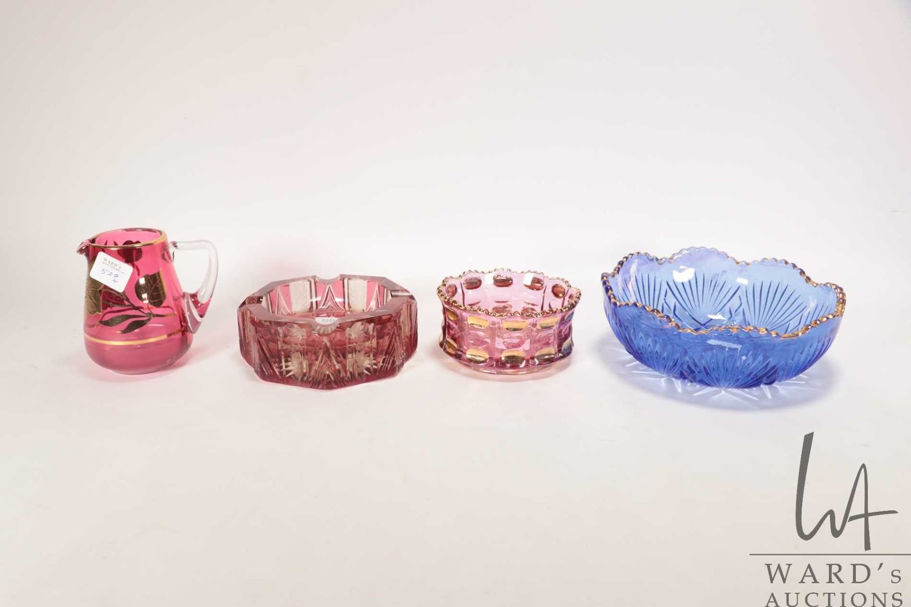 Four pieces of collectible vintage glass including 3 3/4" cranberry pitcher with applied gold flowers, cranberry cut to clear crystal ashtray, blue glass bowl with sculpted gilt etching, small cranberry bowl with dimpling and gilt edge