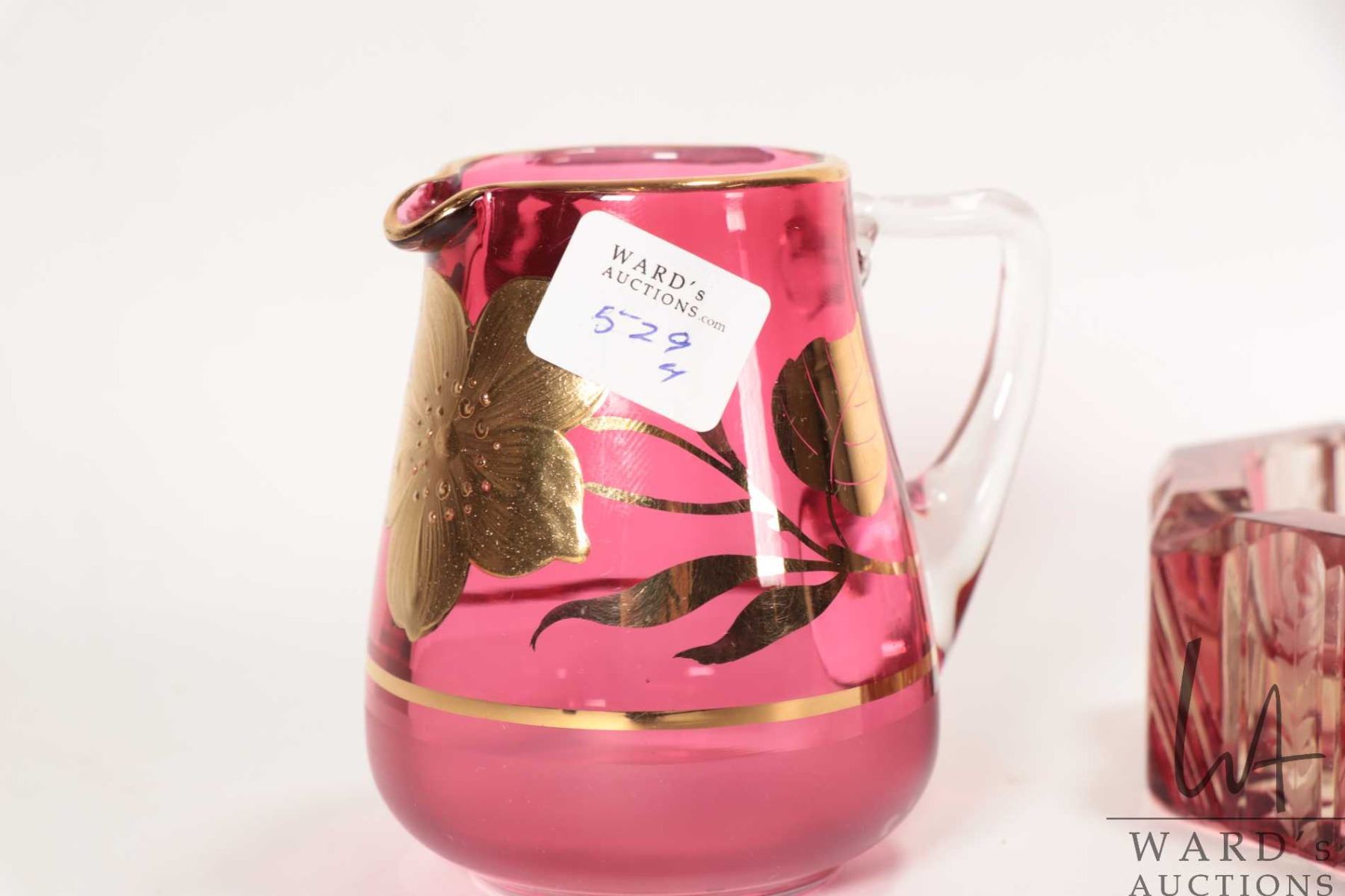 Lot 529 Four pieces of collectible vintage glass including 3 3/4" cranberry pitcher with applied gold flower