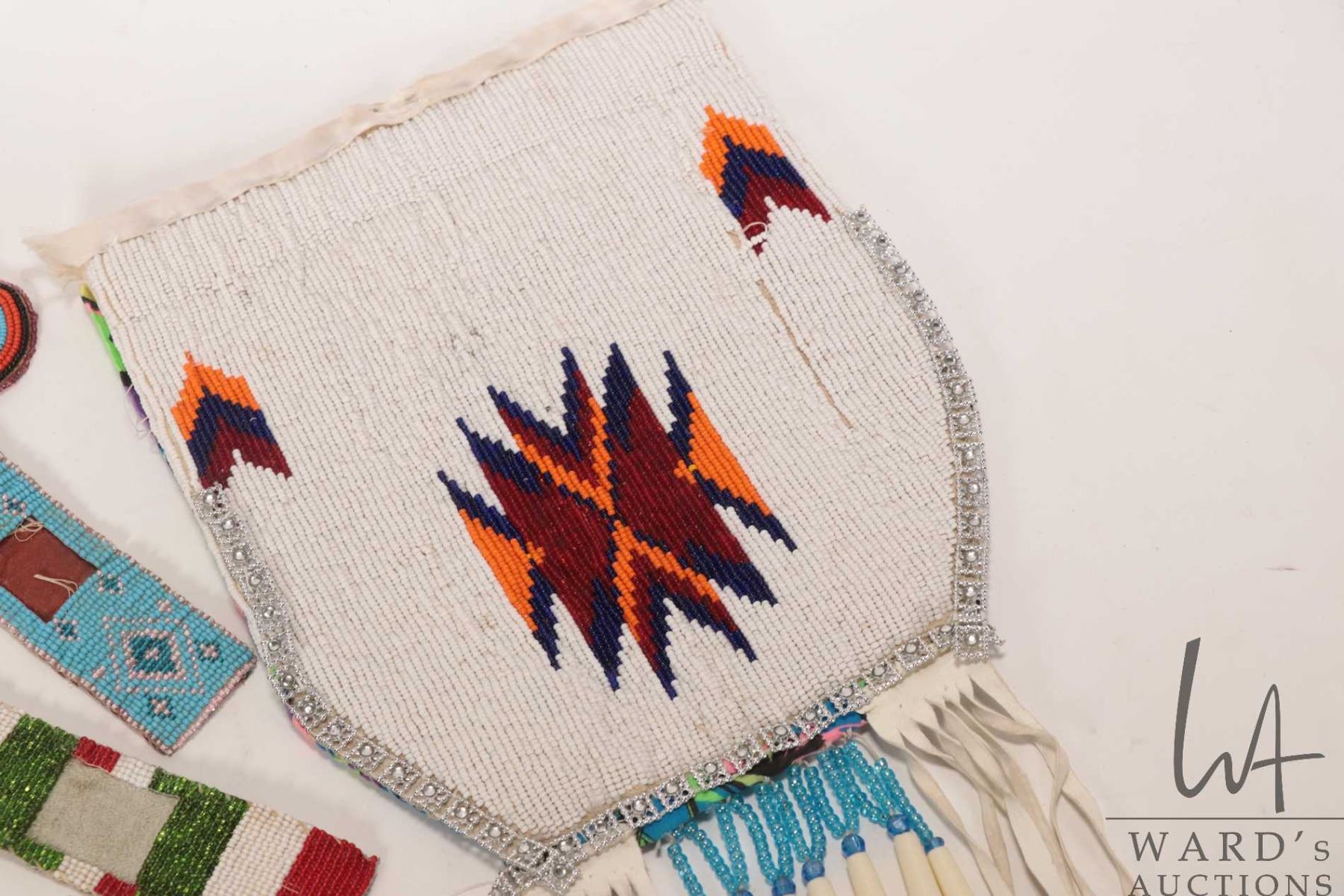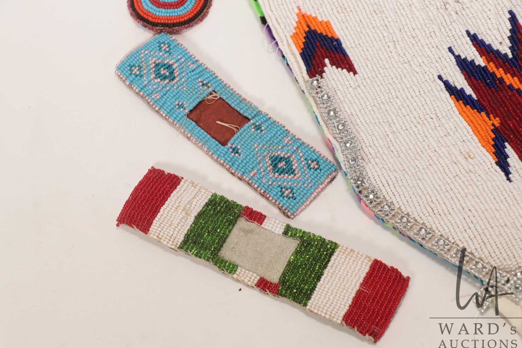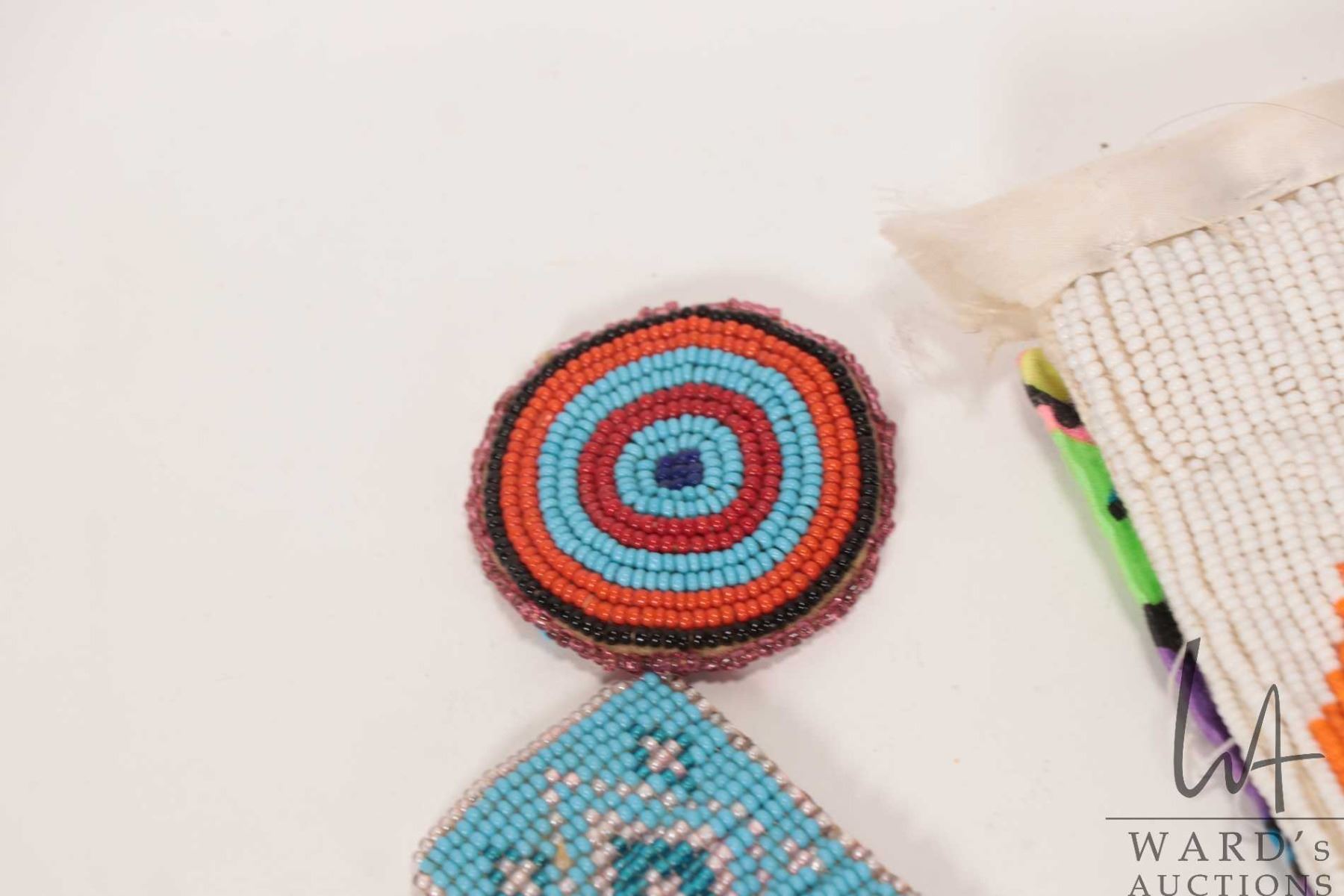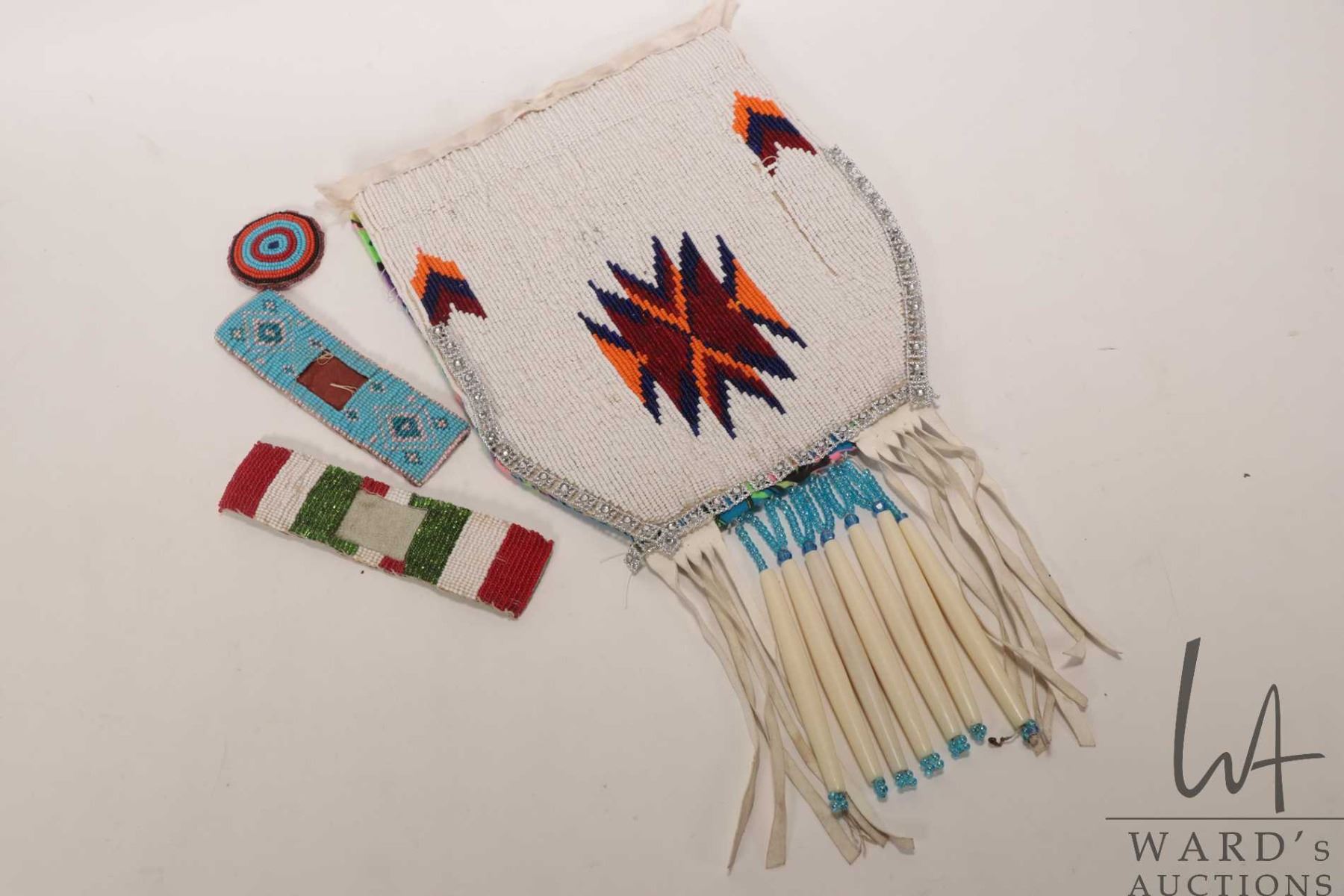 Lot 533 Vintage Indigenous beadwork panel/ pouch, two small straps and a 2" round beadwork patch