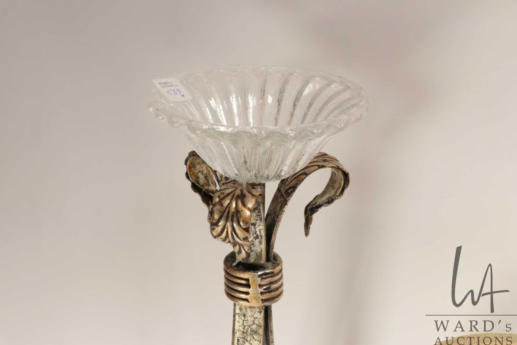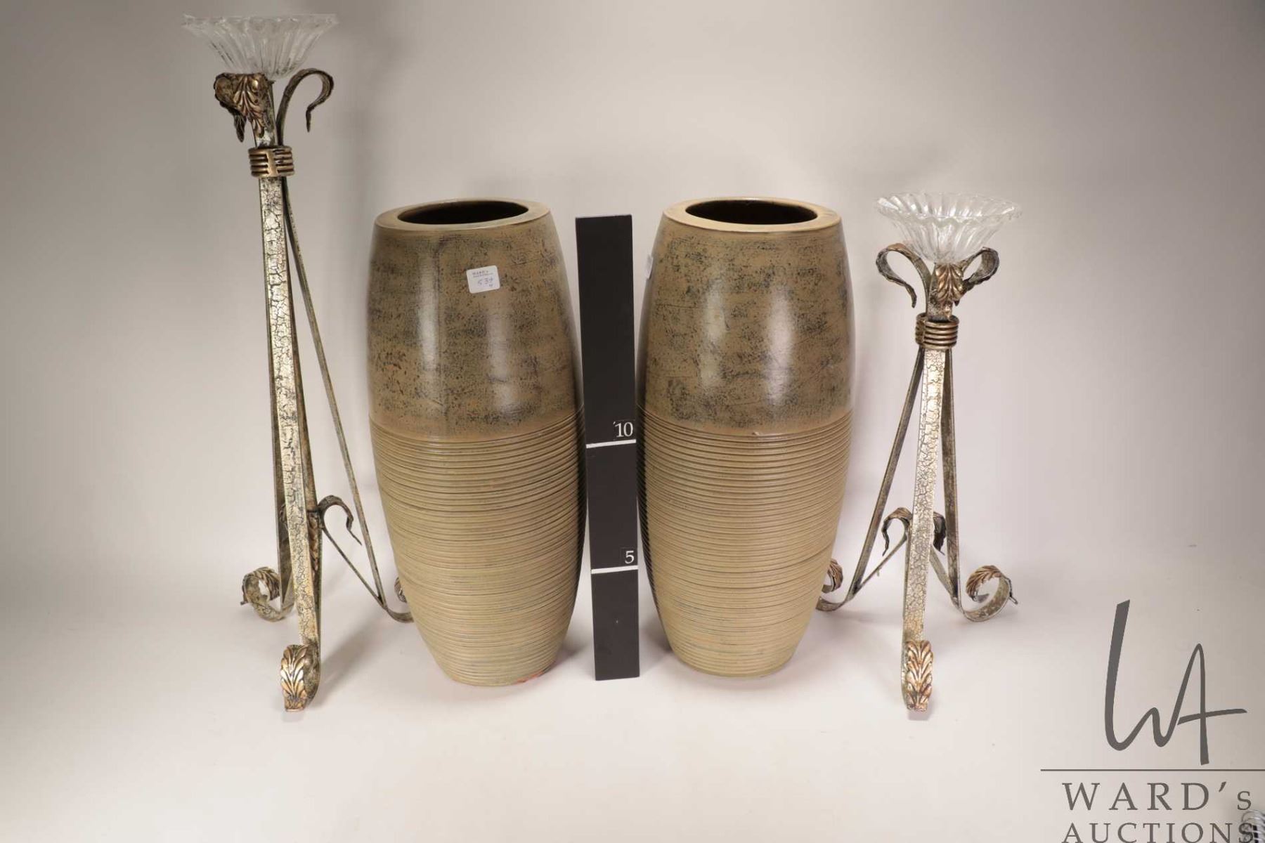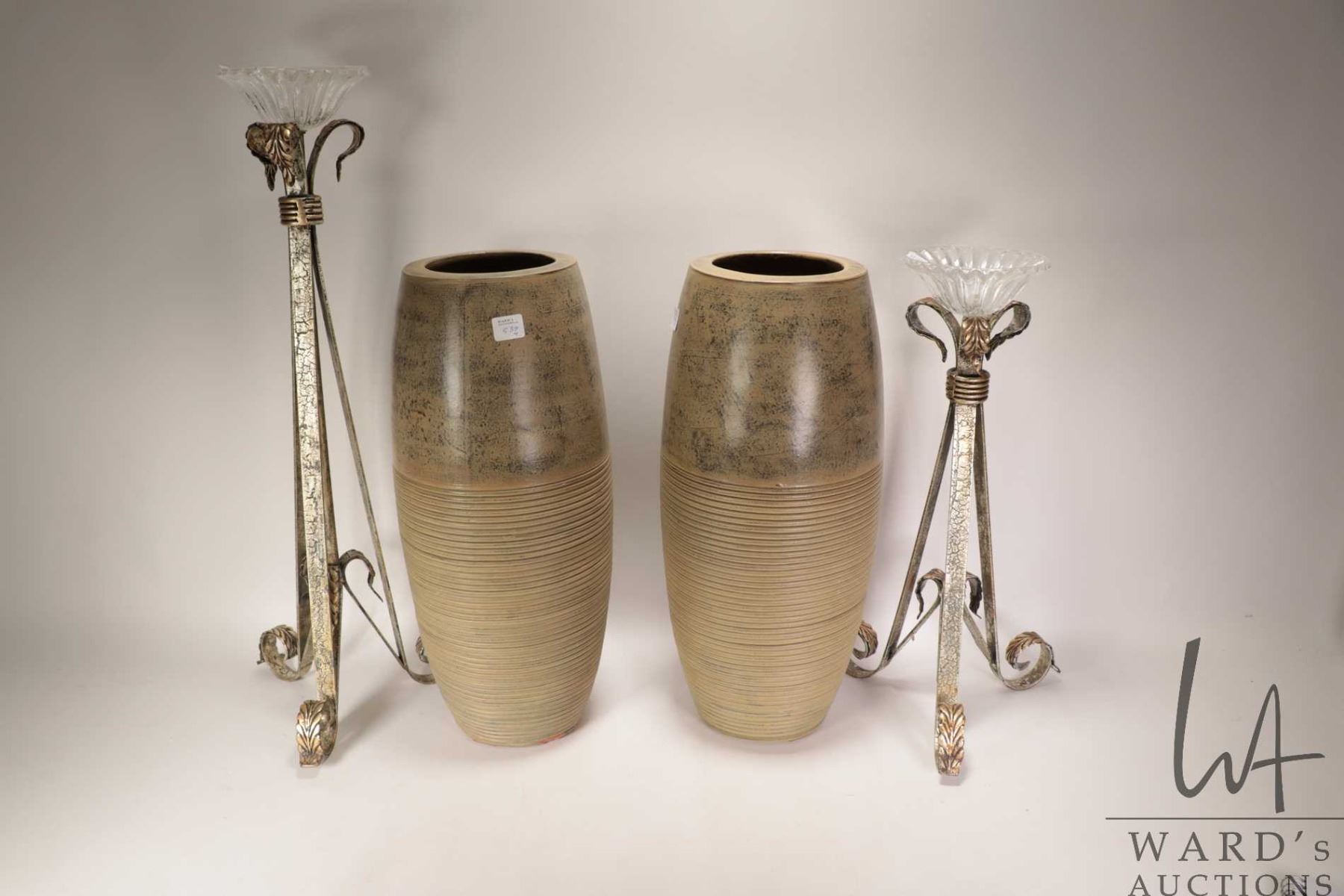 Lot 539 Two glazed pottery 18" vases and two metal and glass candleholders