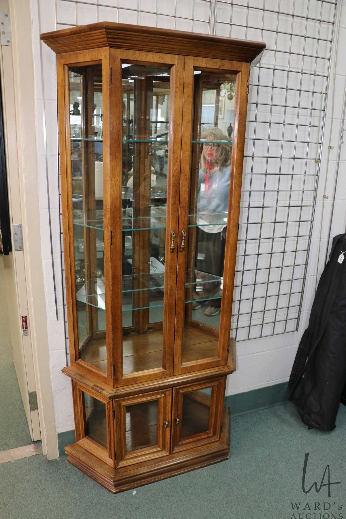 Trapezoid shaped illuminated display cabinet with mirrored back, three glass shelves on top section and room for glass shelf on bottom, 71" H X 34" W X 10 1/2" D