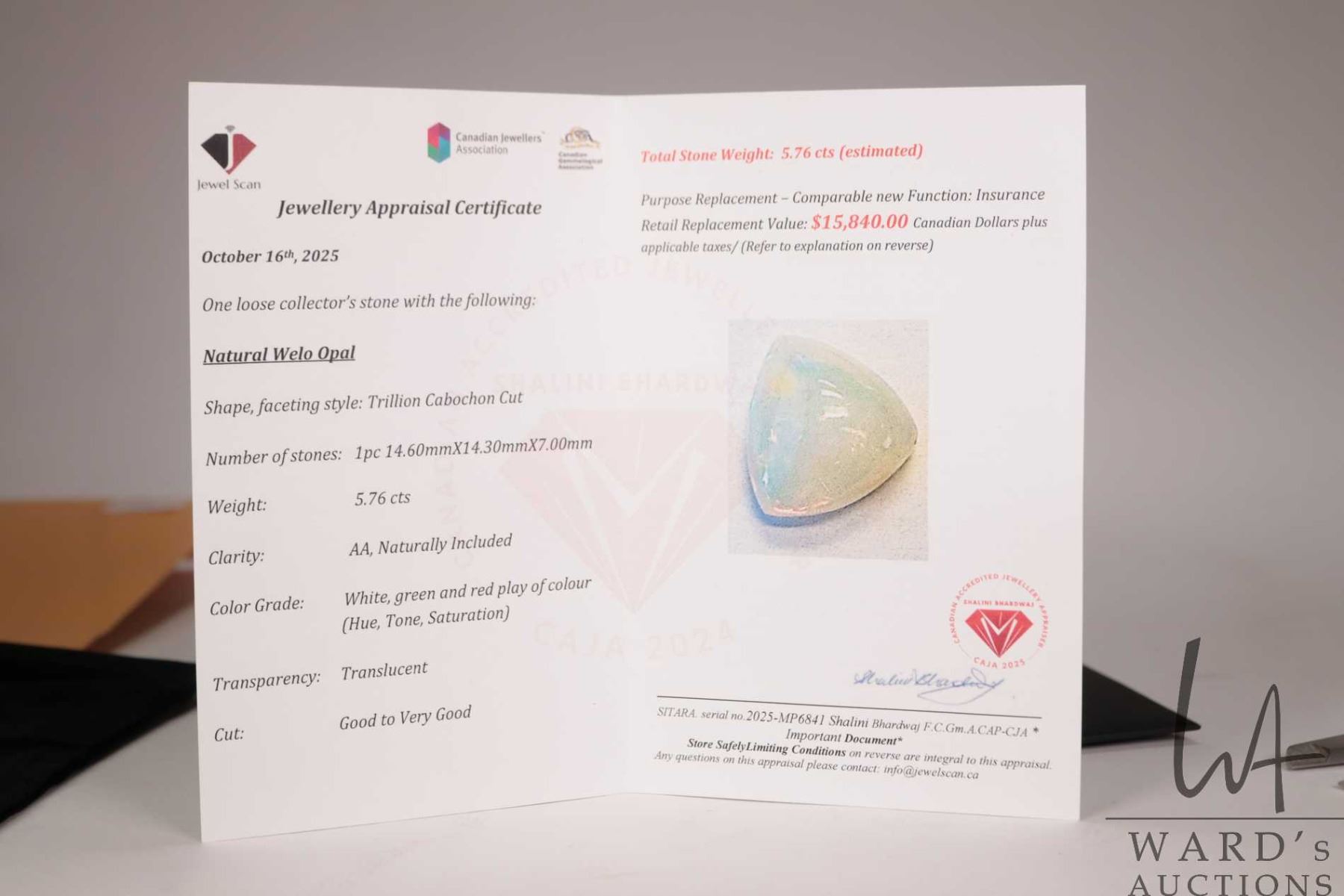 Lot 546 5.76 ct. natural Welo opal trillion cabochon cut gemstone with certificate provided by consignor