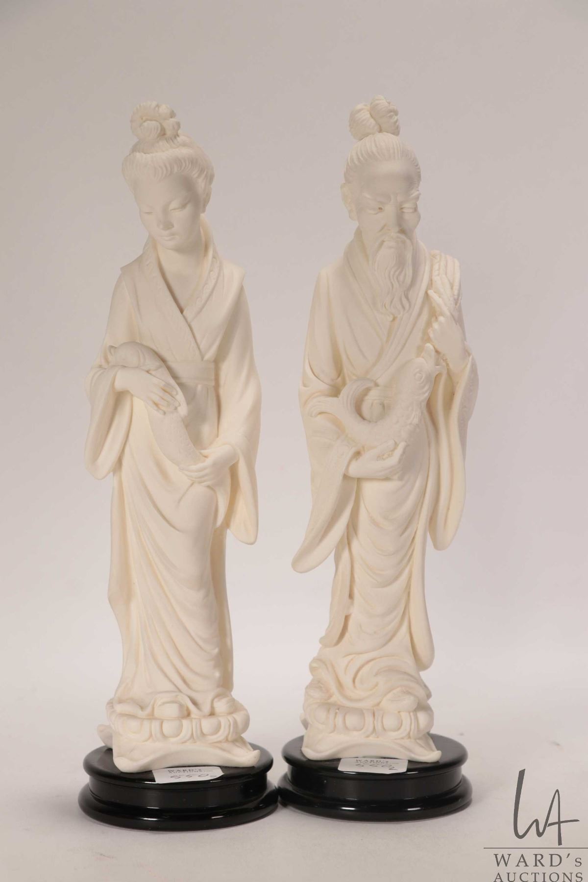 Vintage Golden Crown E&R Italy composition figures including geisha and wiseman, each approximately 10 1/2" in height