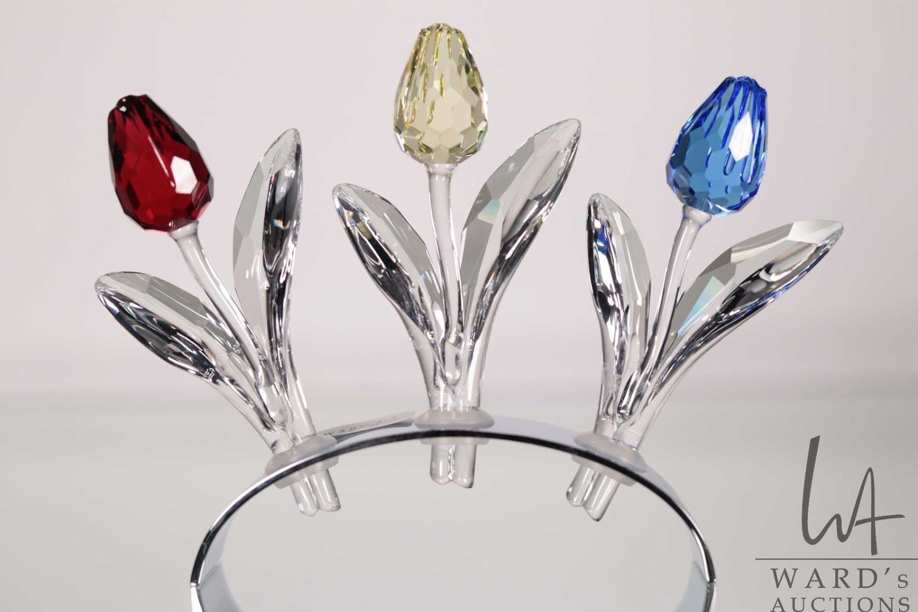 Lot 559 Swarovski crystal set of three coloured tulips on reflective oval stand. Includes original boxes