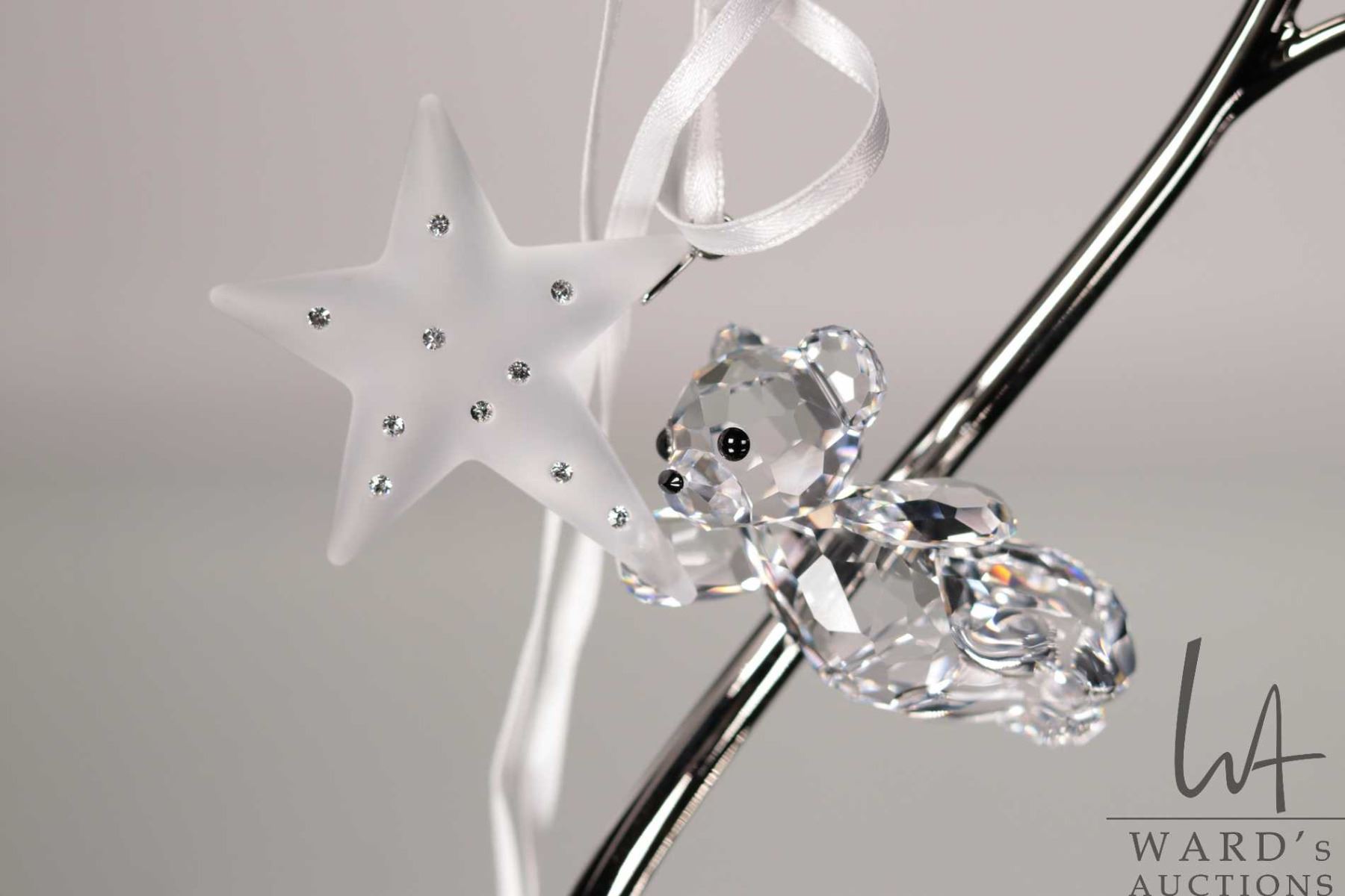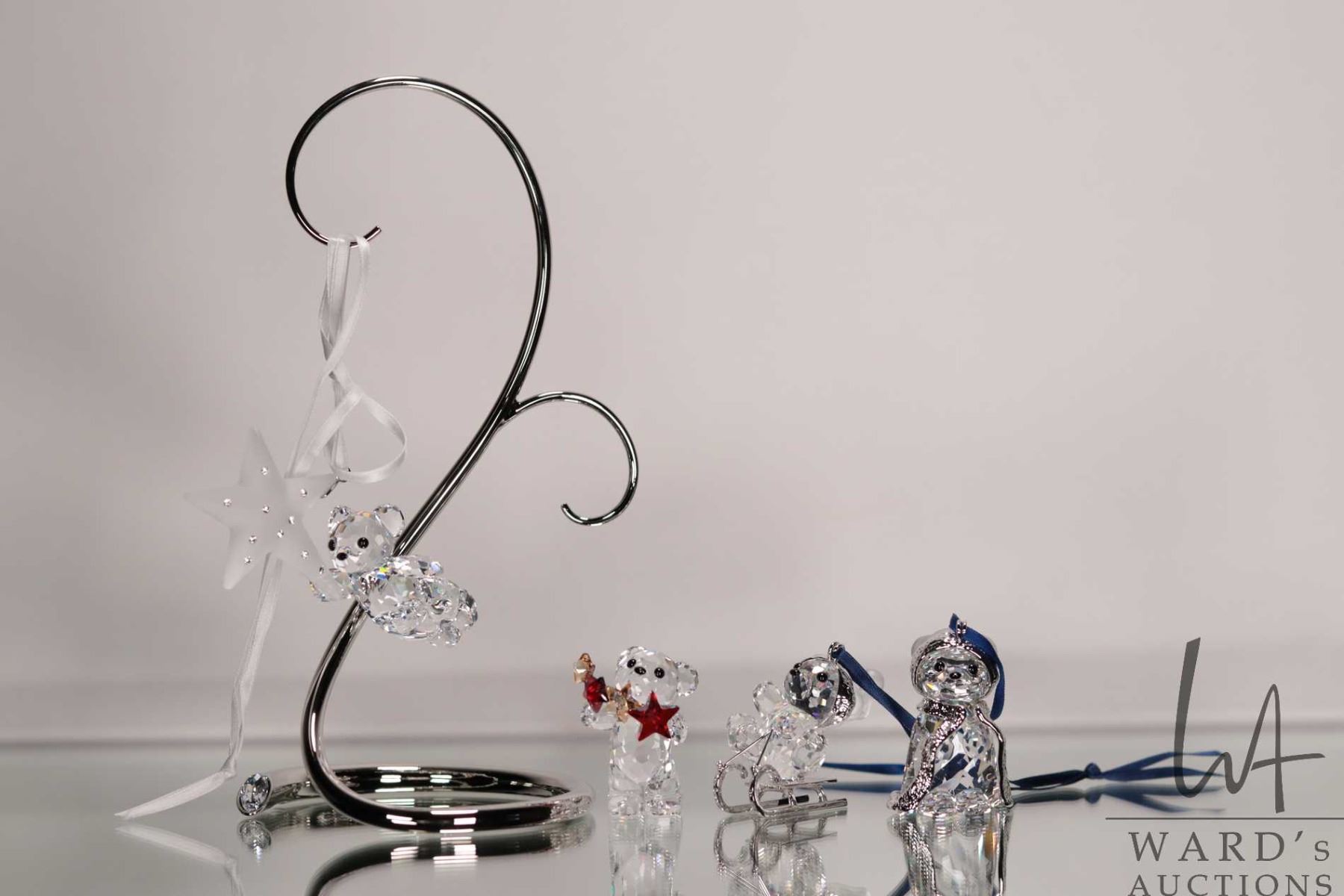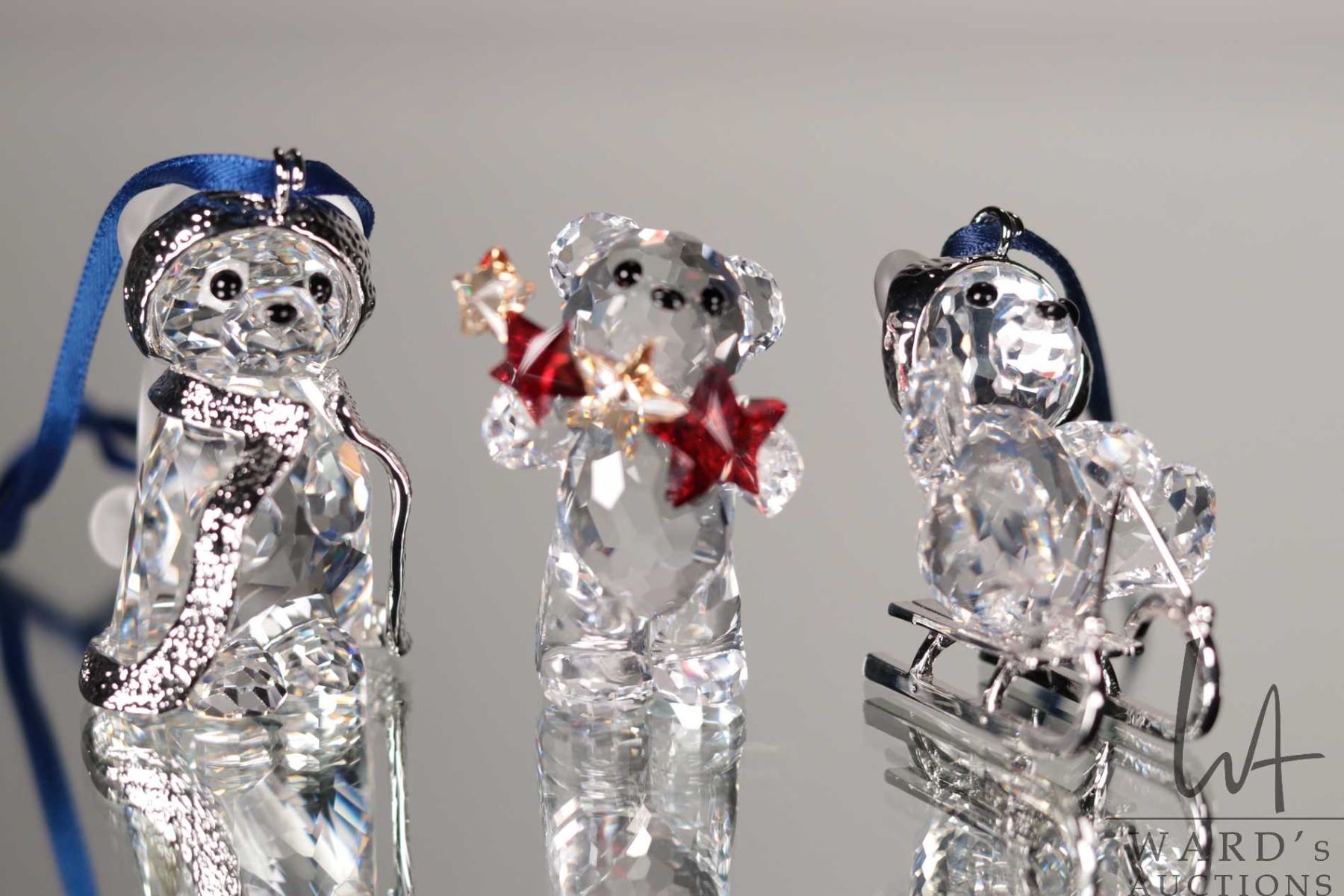 Lot 565 Four Swarovski crystal teddy bear hanging ornaments and an ornament hanger. Incudes original boxes