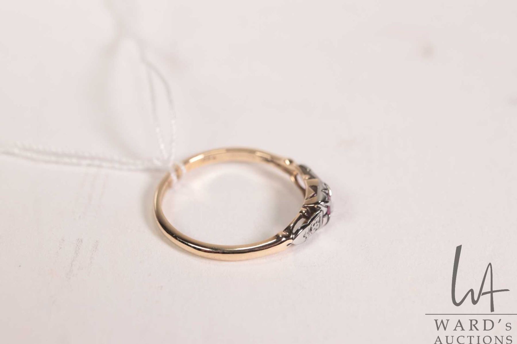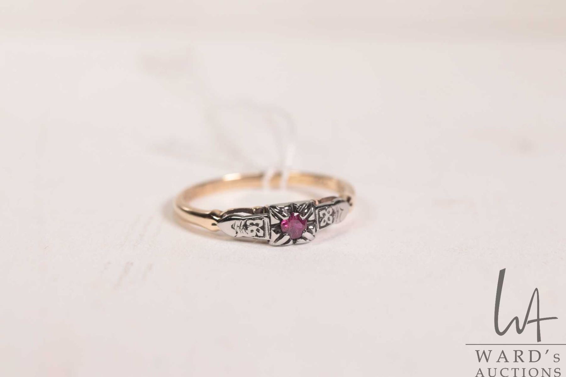 Lot 570 14kt yellow and white gold ring set with synthetic ruby gemstone, 1.6 grams, size 6.25