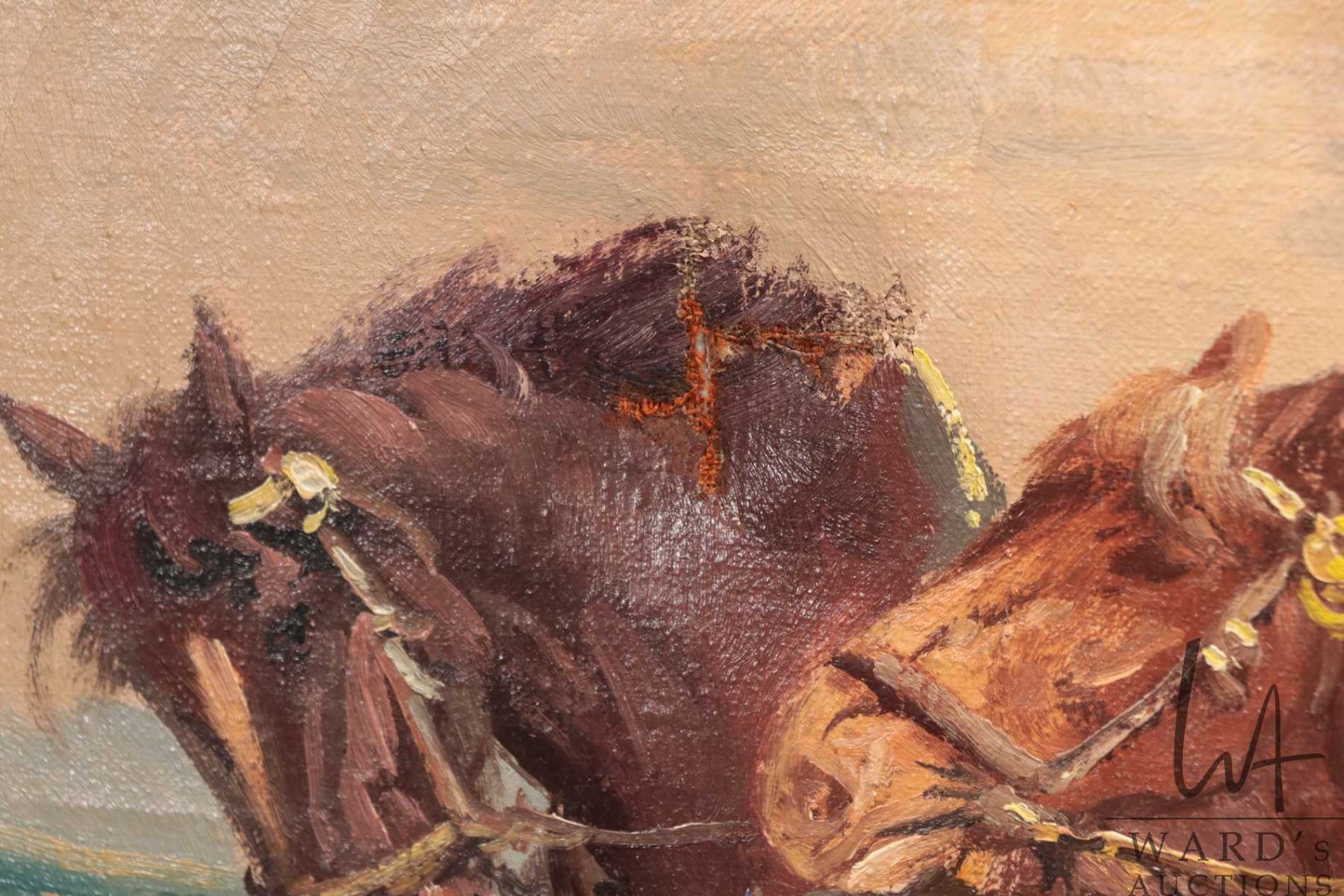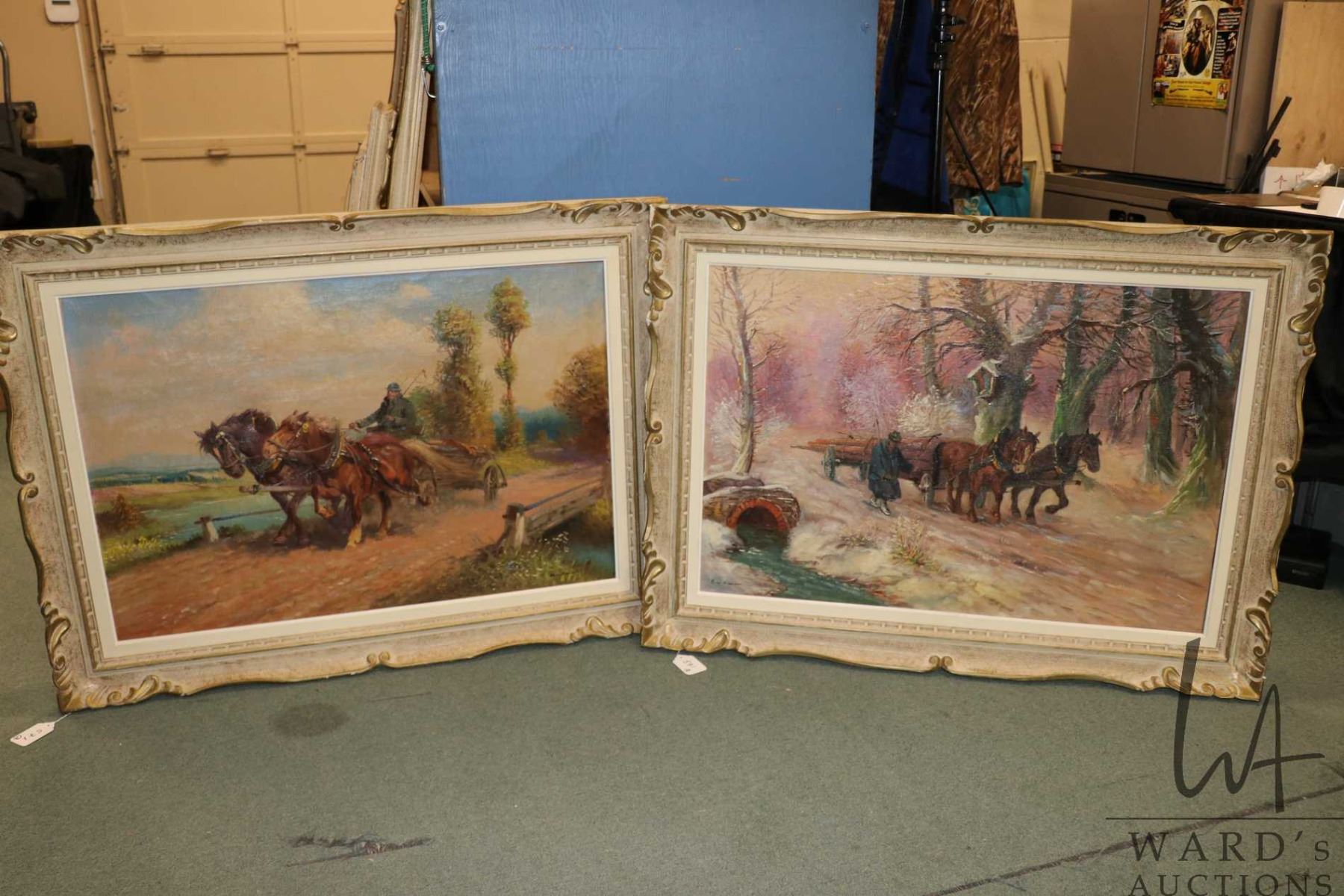 Lot 571 Two large framed oil on canvas paintings including one depicting horse logging, 25-1/2" X 36" and a