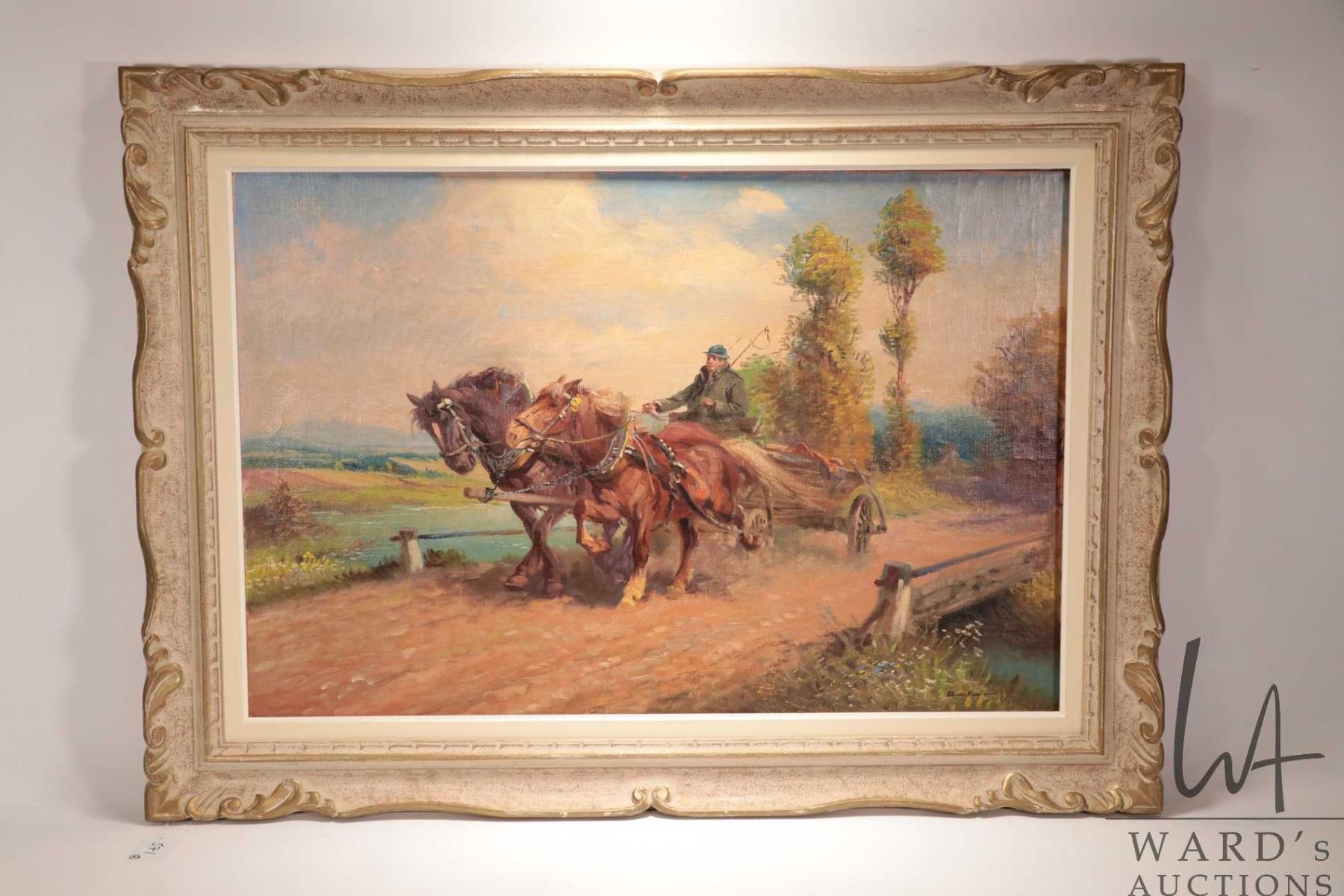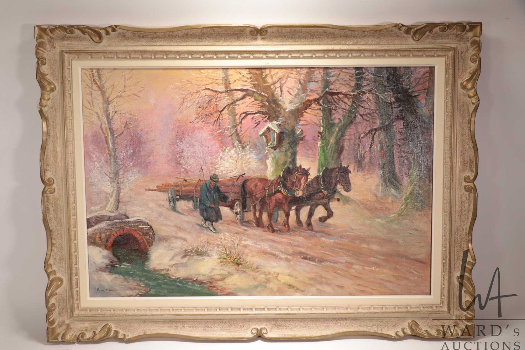 Two large framed oil on canvas paintings including one depicting horse logging, 25-1/2" X 36" and a horse drawn hay wagon, 25-3/4" X 35 1/2", note: tear in one horses neck, both art initialed by artist B--K-- --(?)
