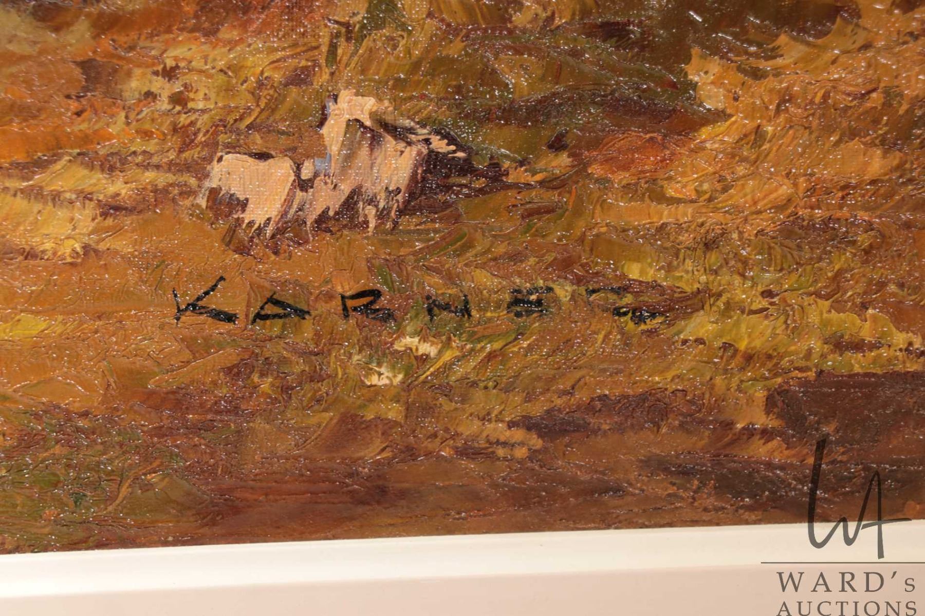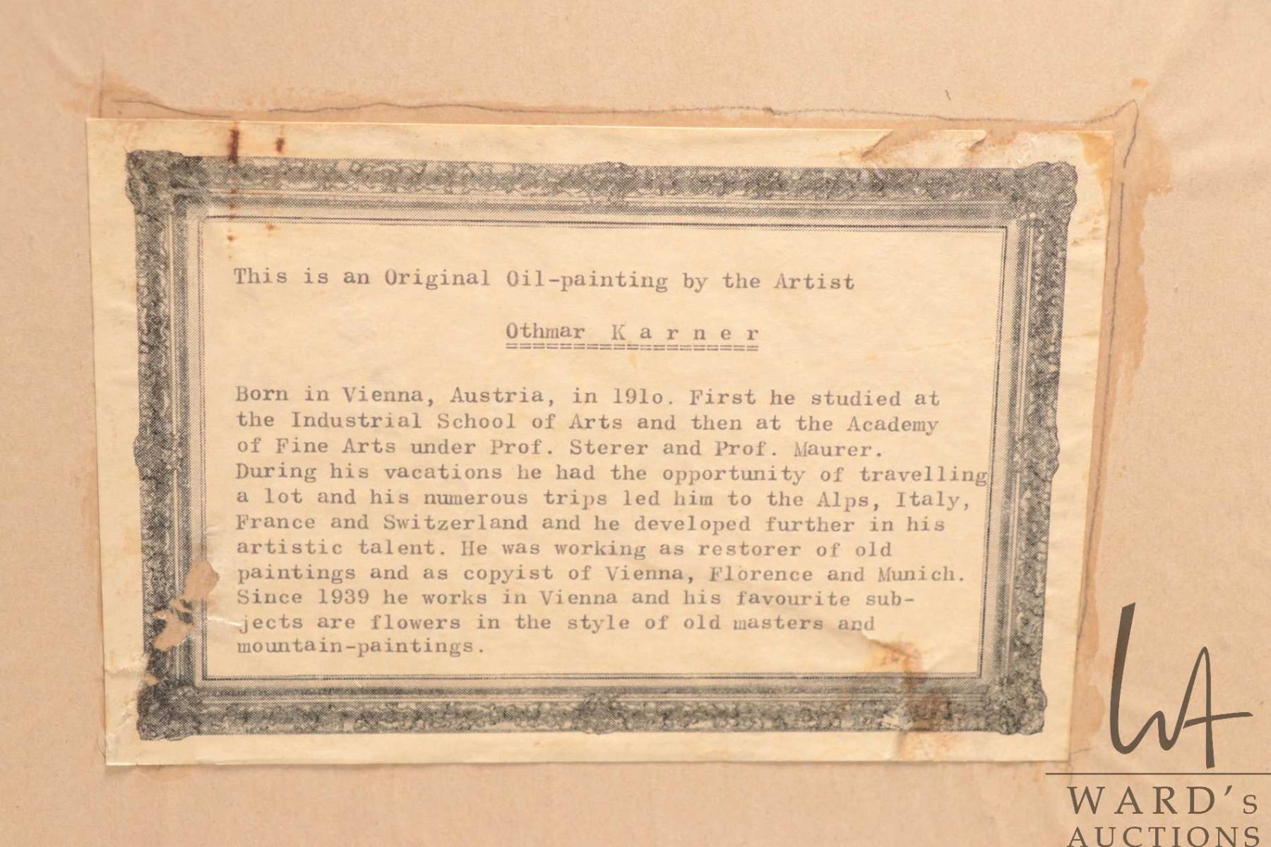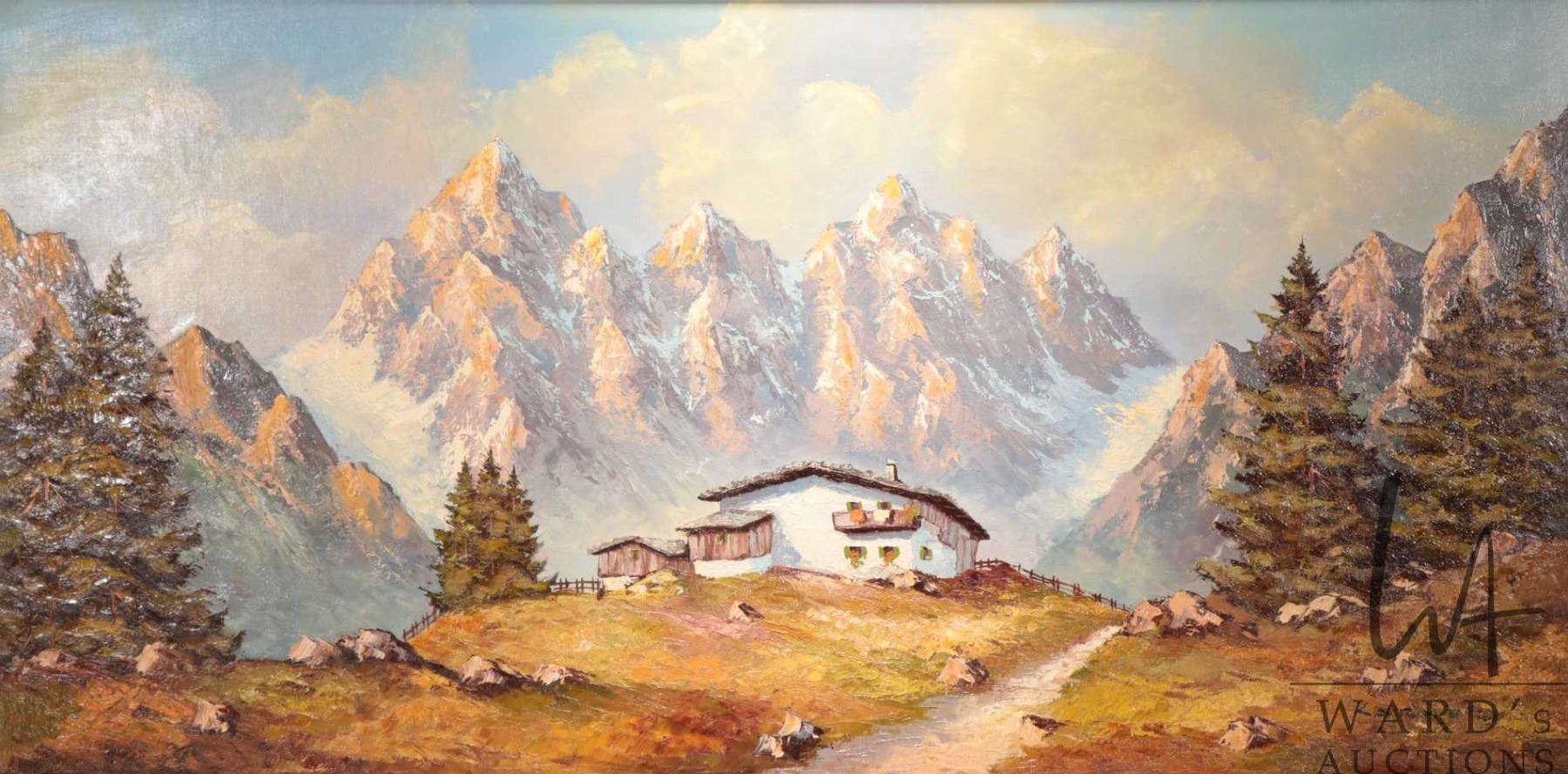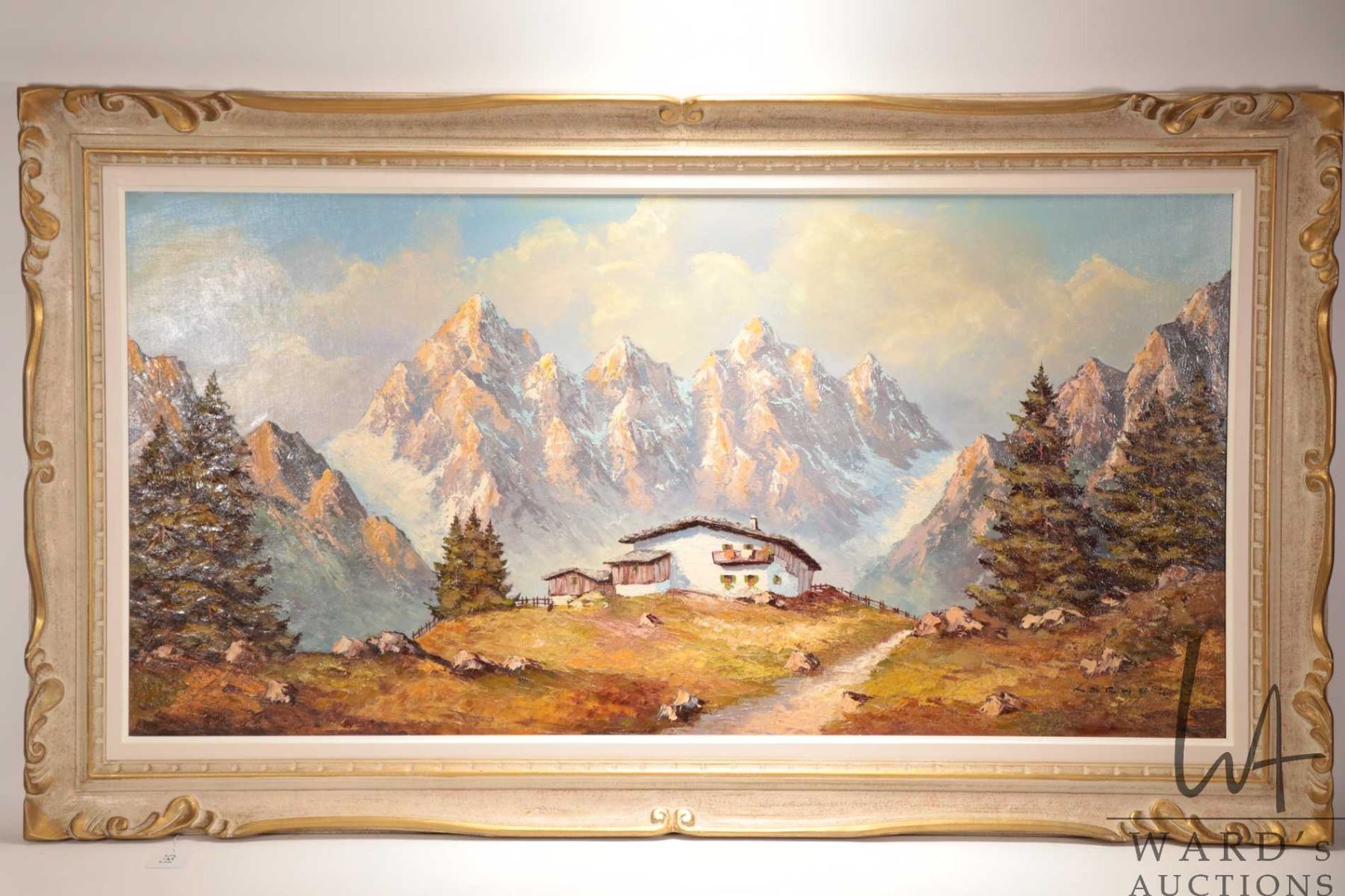 Lot 573 Othmar Karner, framed original oil on board painting of a swiss chalet in the alps 23-1/2" x 47-1/2"