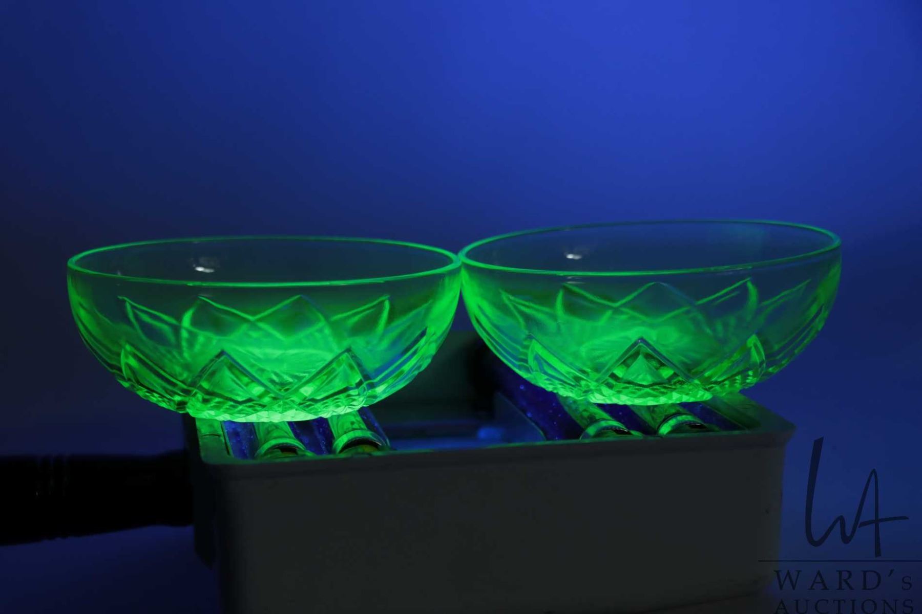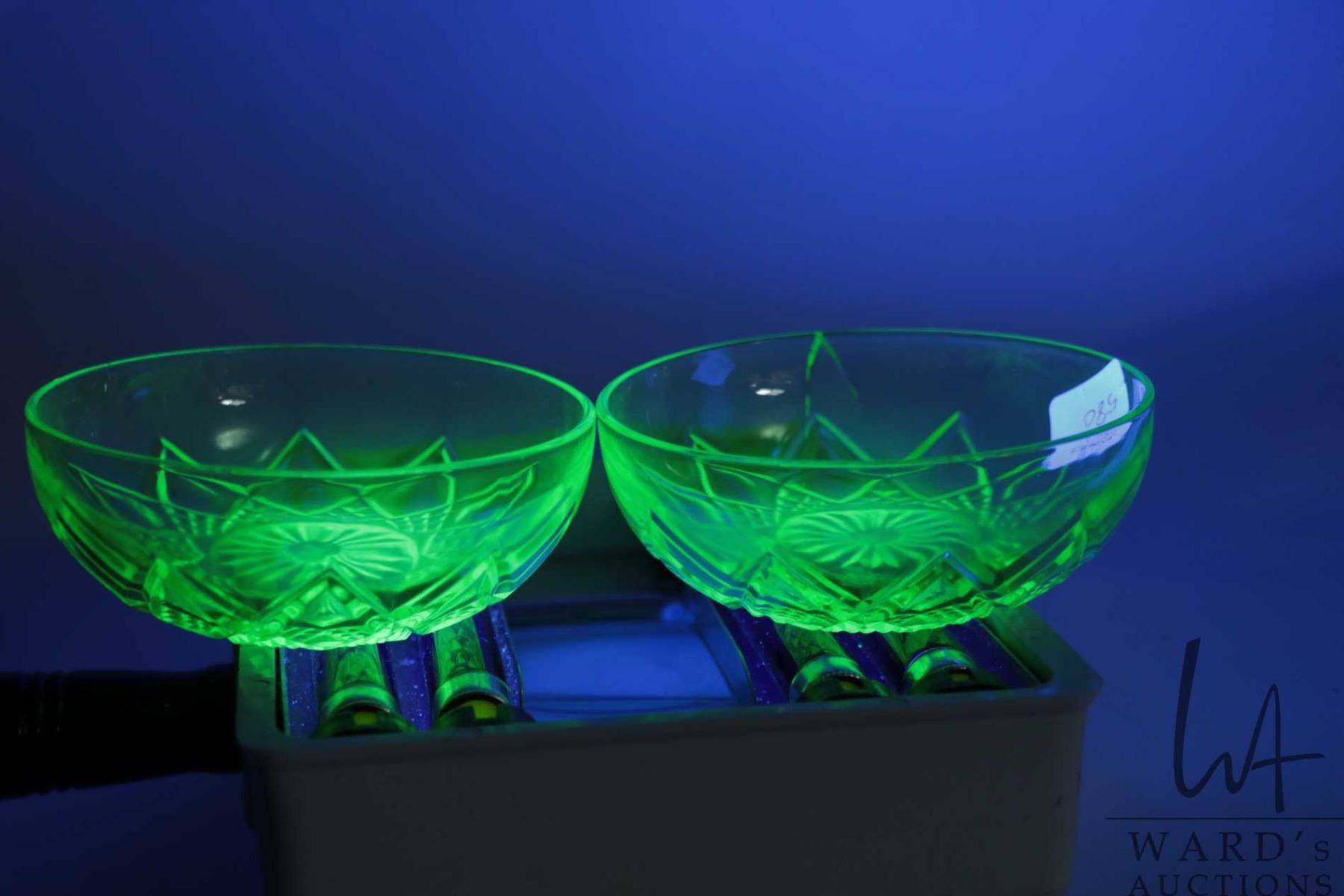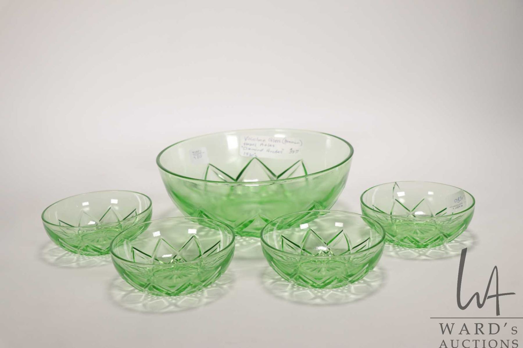 Lot 580 Vintage Uranium glass dessert set including serving bowl and four nappies, note: one nappy is cracke