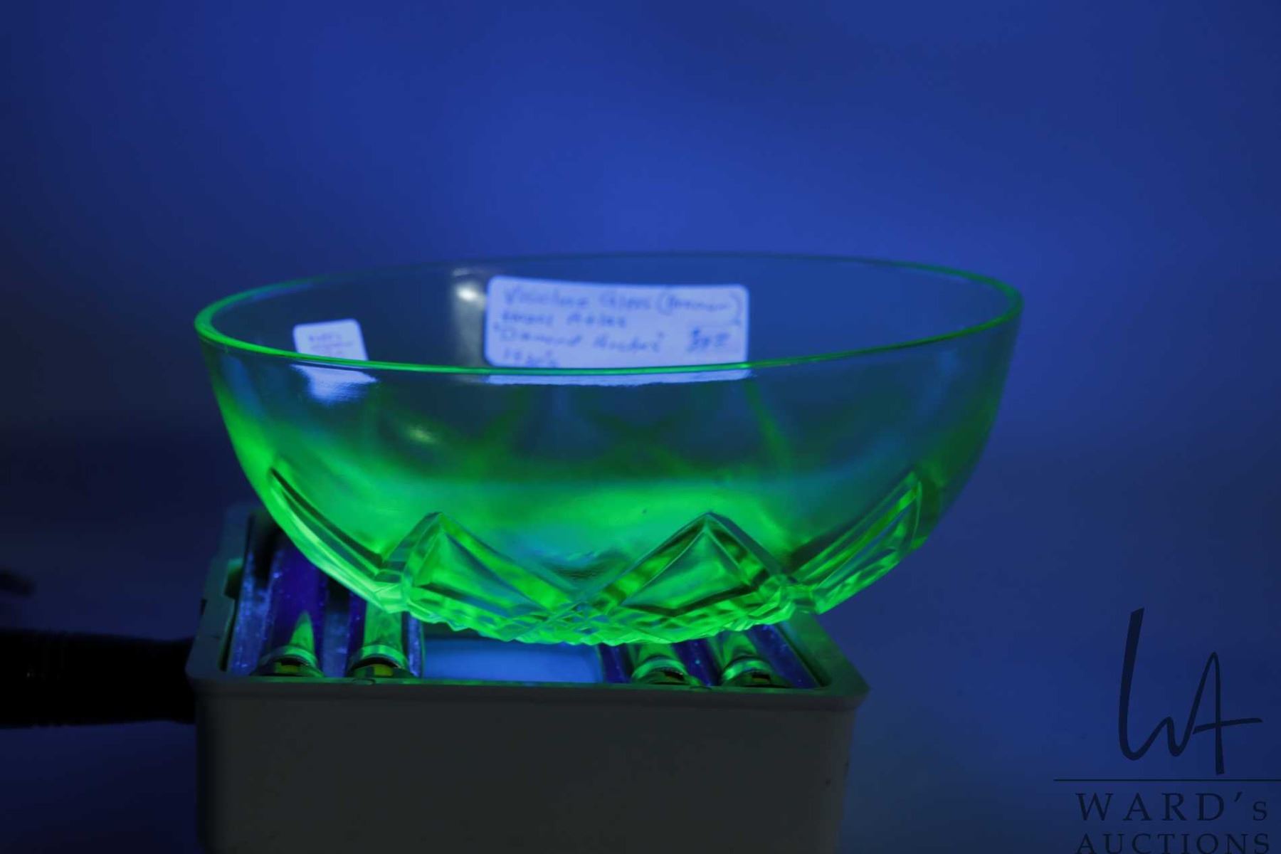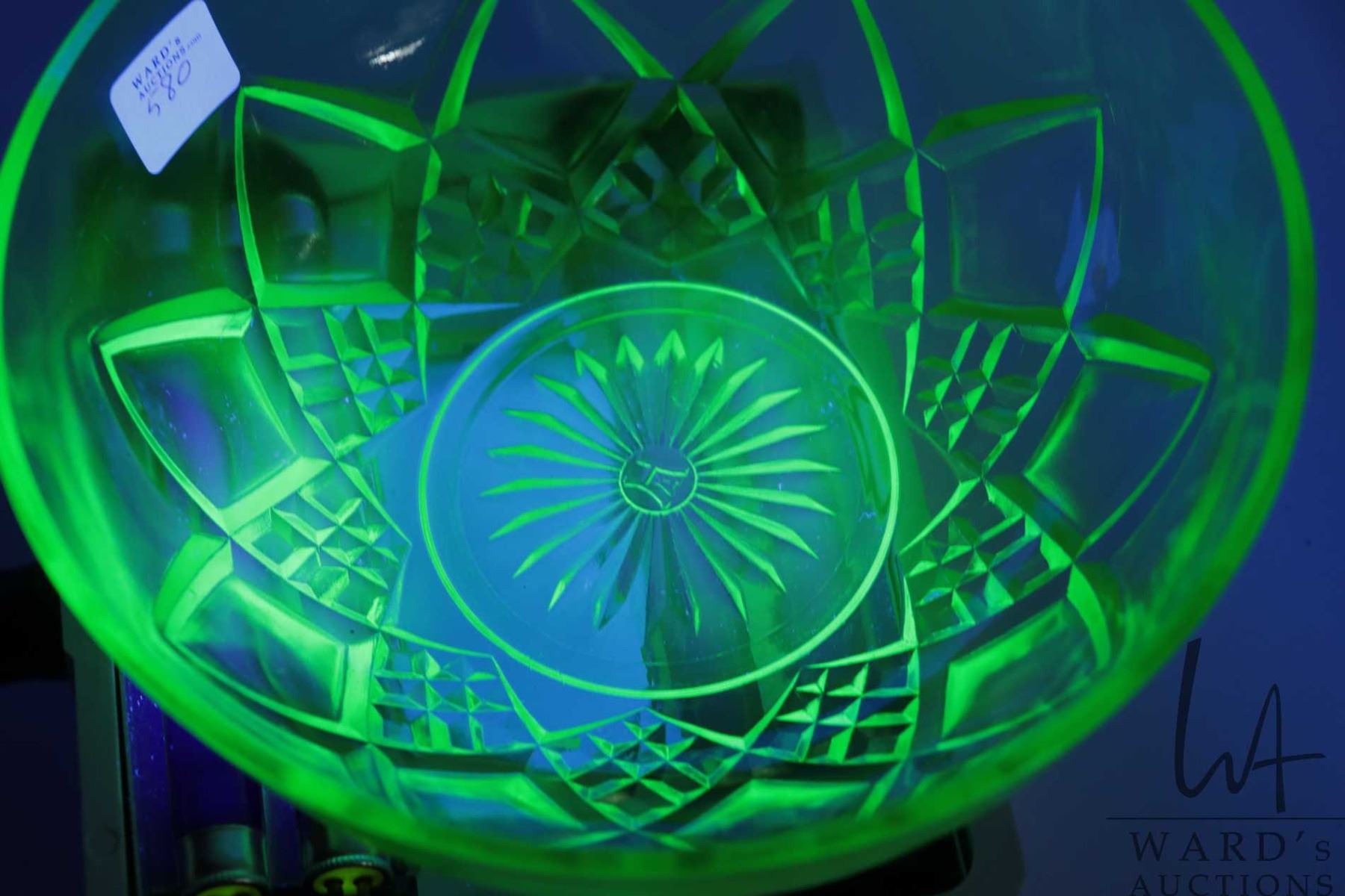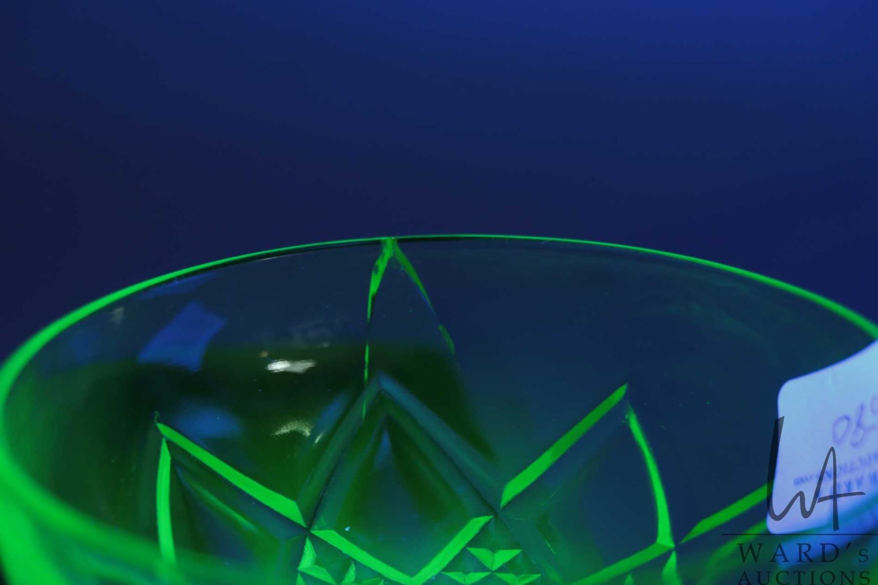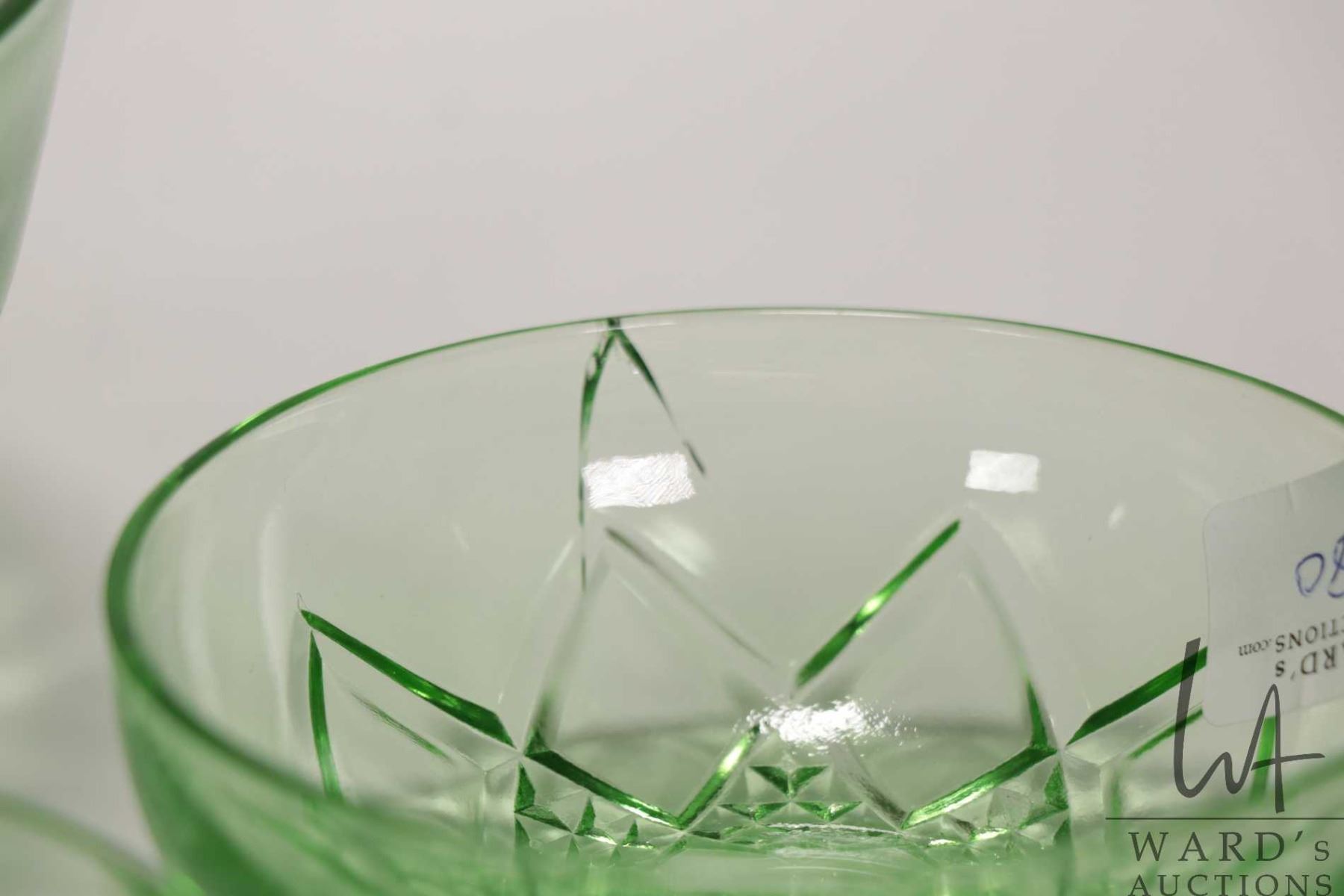 Lot 580 Vintage Uranium glass dessert set including serving bowl and four nappies, note: one nappy is cracke