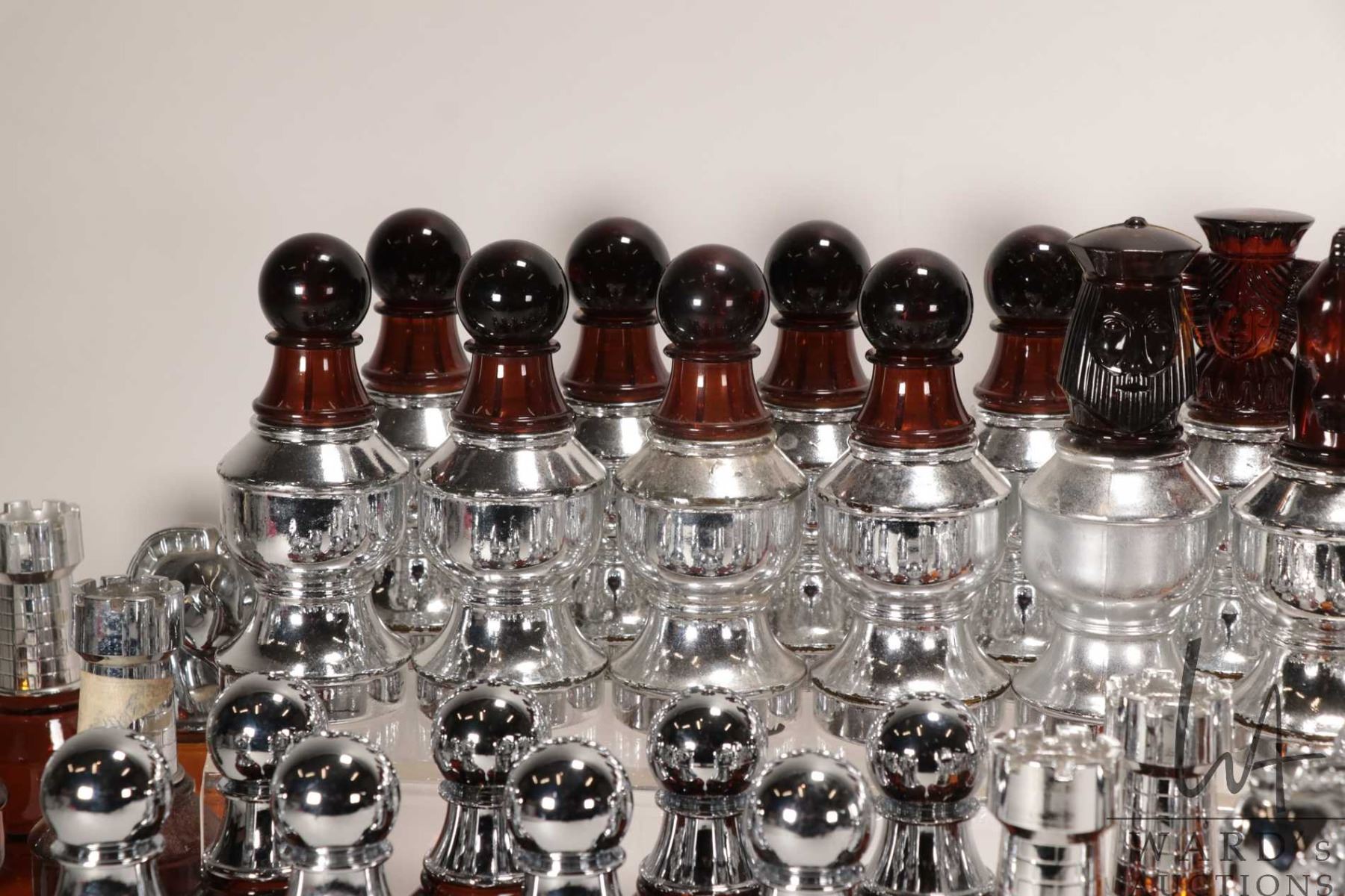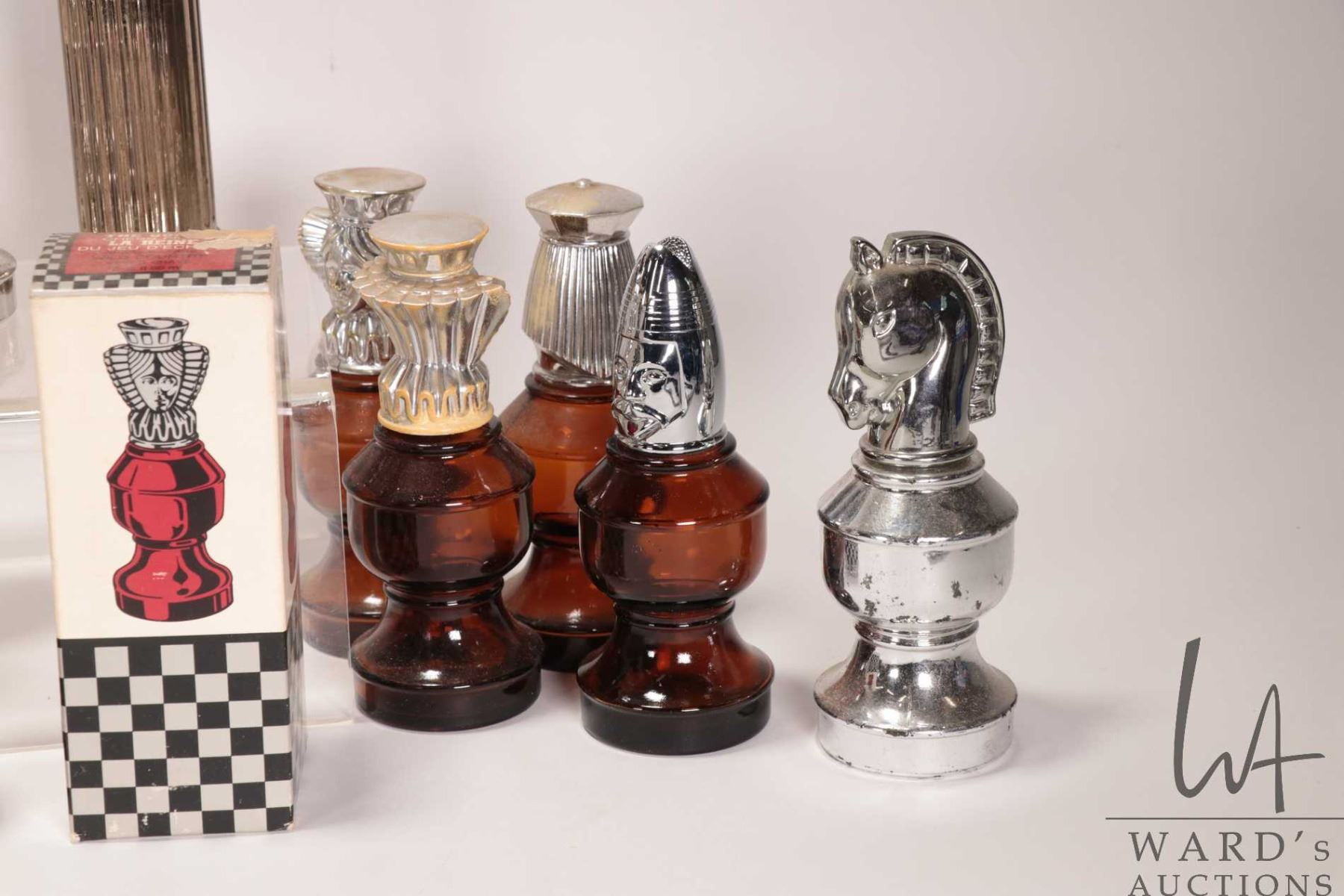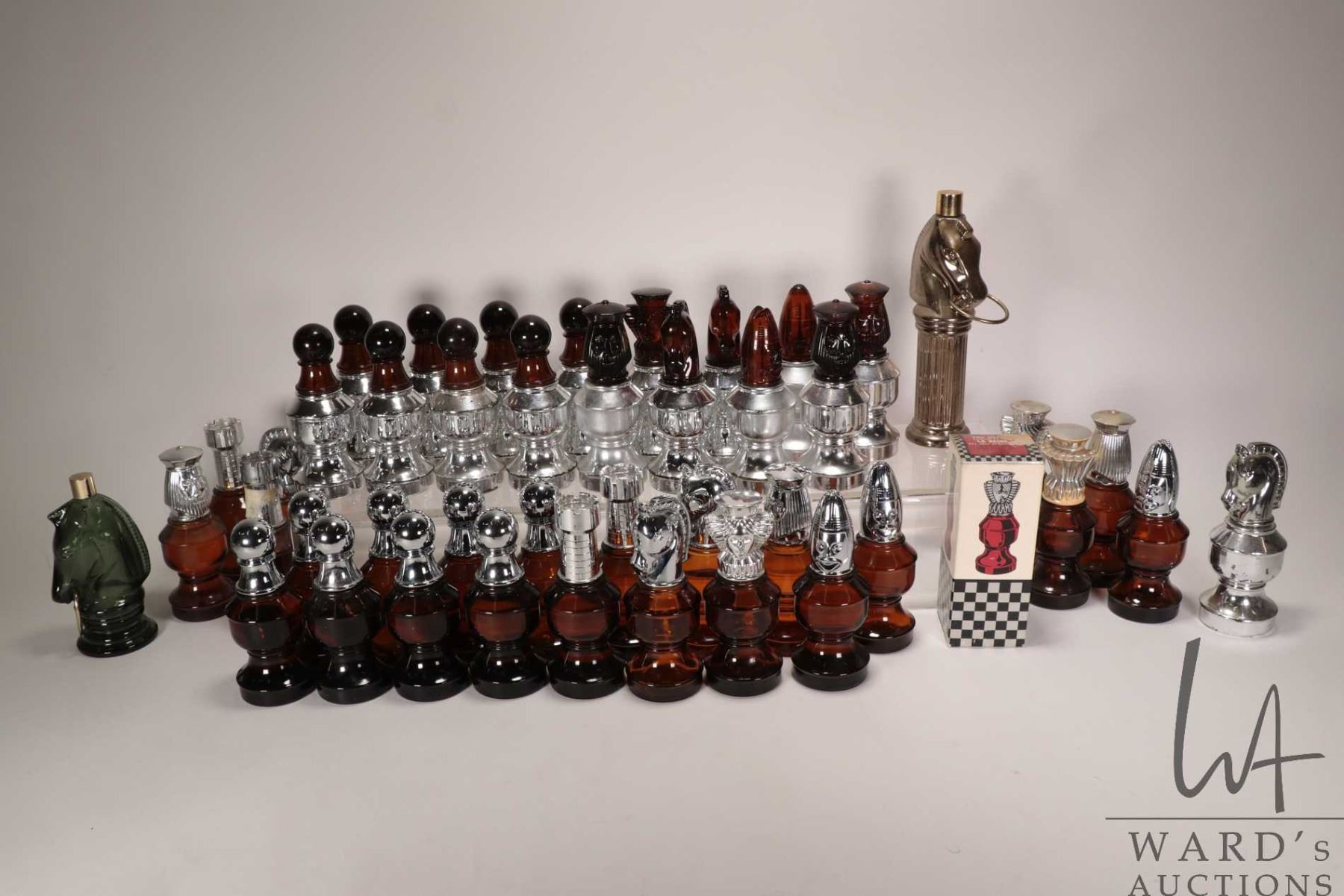 Lot 582 Forty four vintage Avon chess pieces half containing an amount of Avon gent's fragrance, some full.
