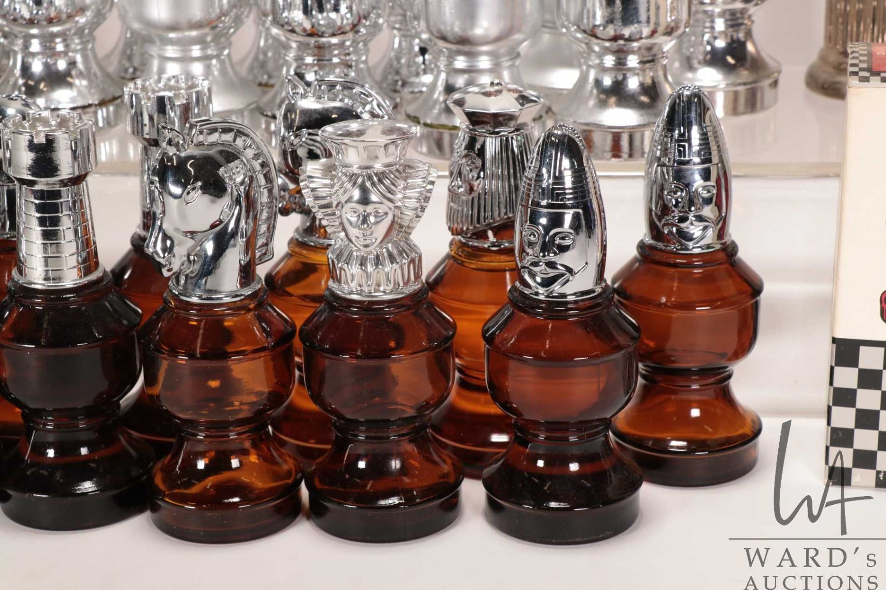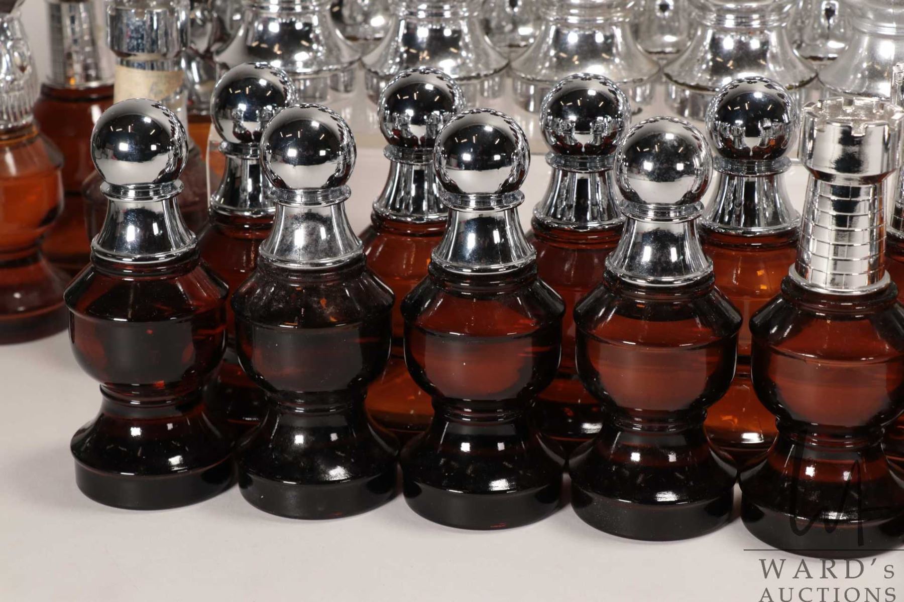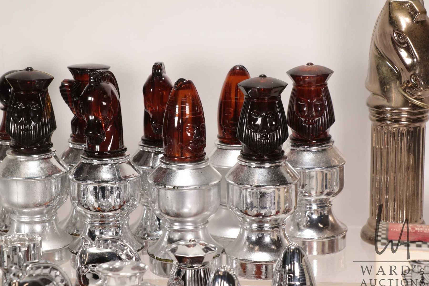 Lot 582 Forty four vintage Avon chess pieces half containing an amount of Avon gent's fragrance, some full.