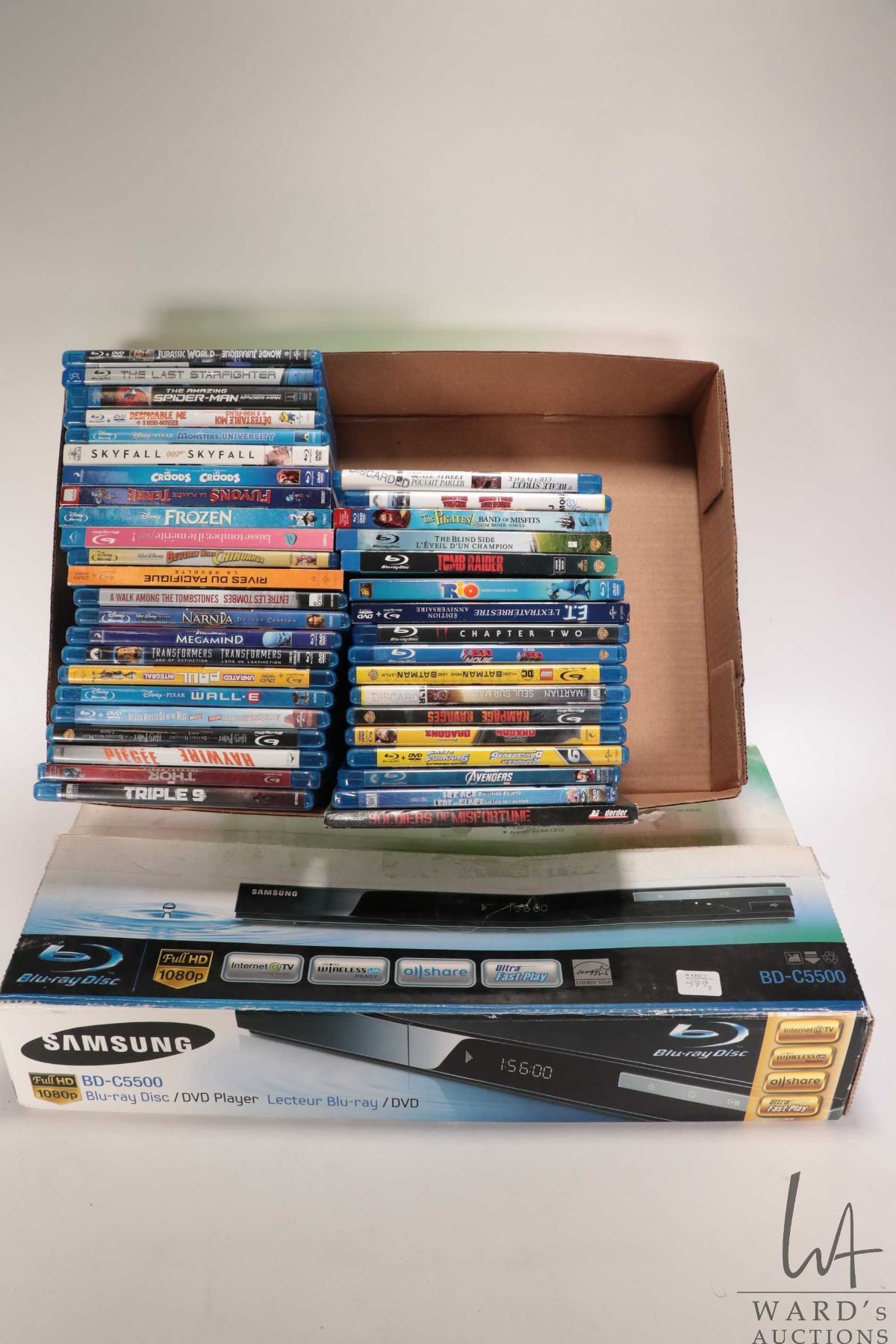 Samsung Blu-ray Disc/DVD player with remote, appears to work, not confirmed. Includes forty blu-ray discs, assorted movies etc.