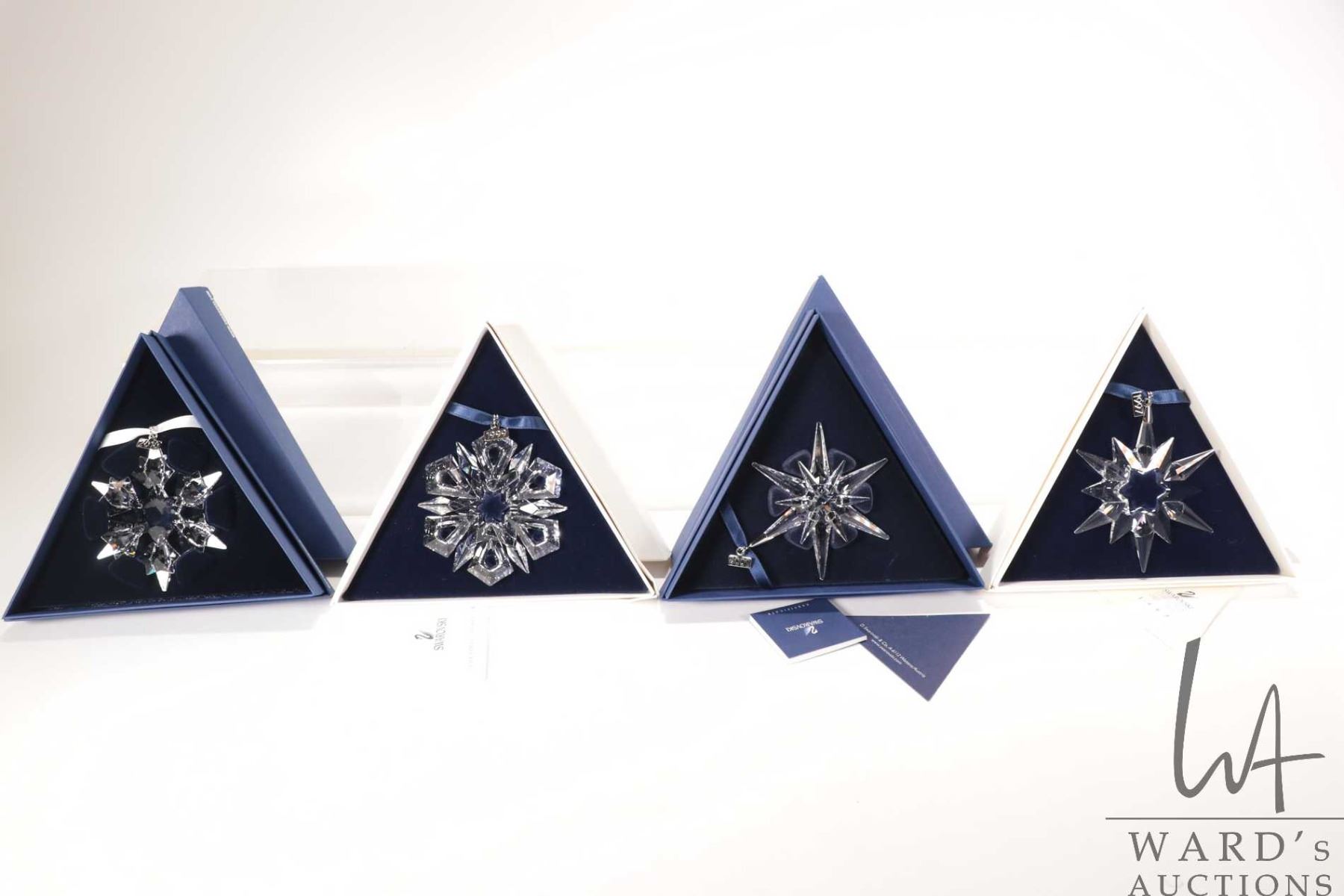Four Swarovski crystal Christmas ornaments including 1197, 1999, 2005 and 2010