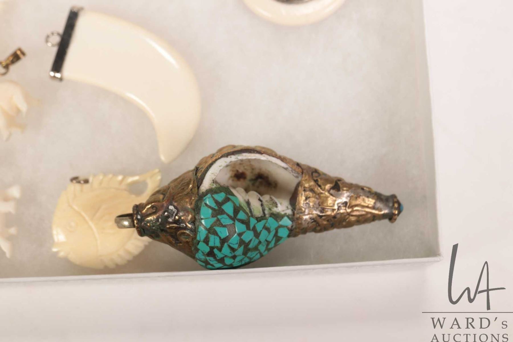 Lot 626 Selection of hand carved miniature elephant pendants, decorative seashell pendant with applied stone