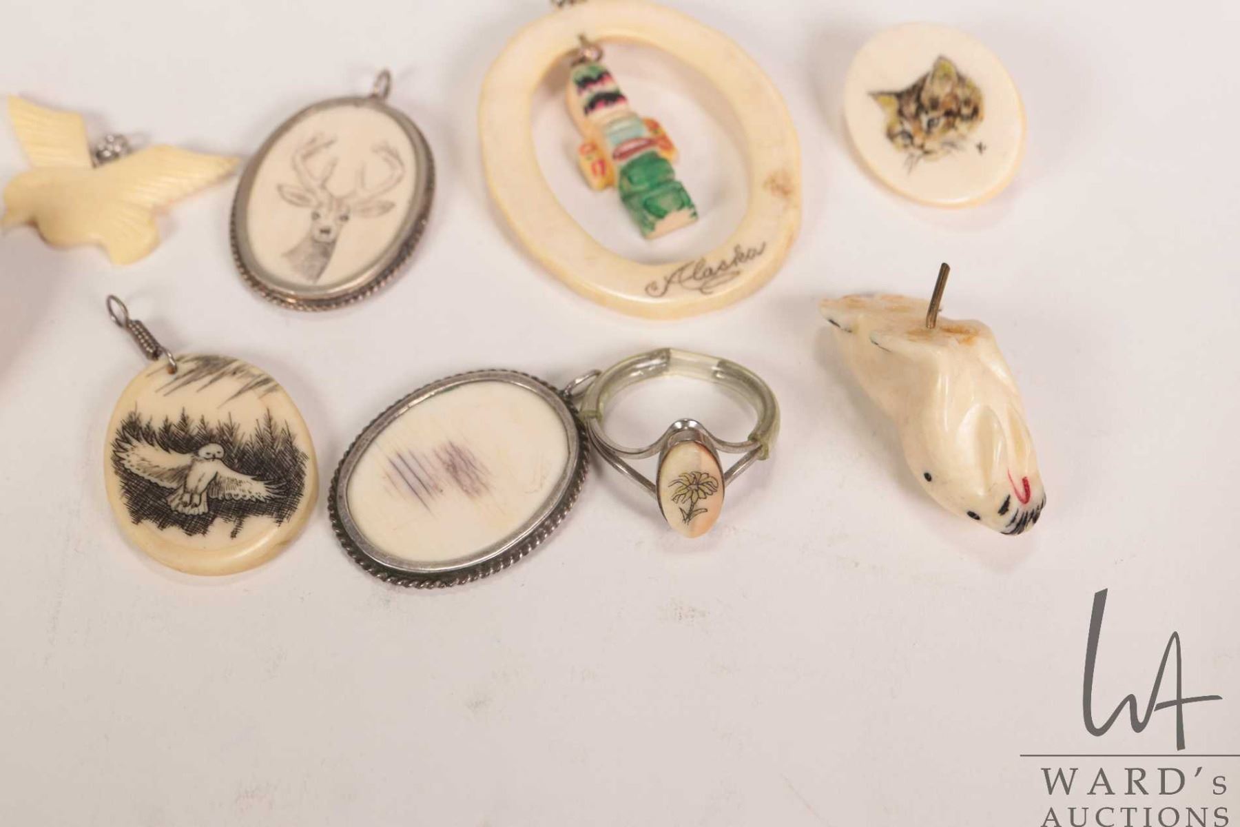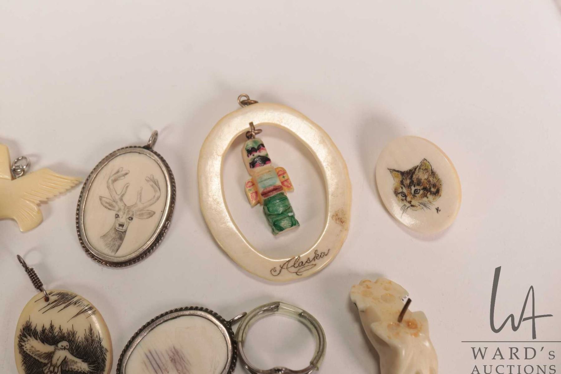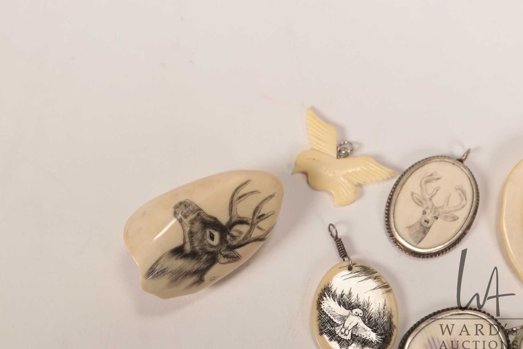 Selection of ivory and bone carvings including scrimshaw elk tooth, pendants etc. Can not be shipped outside of Canada. Canadian buyers only.