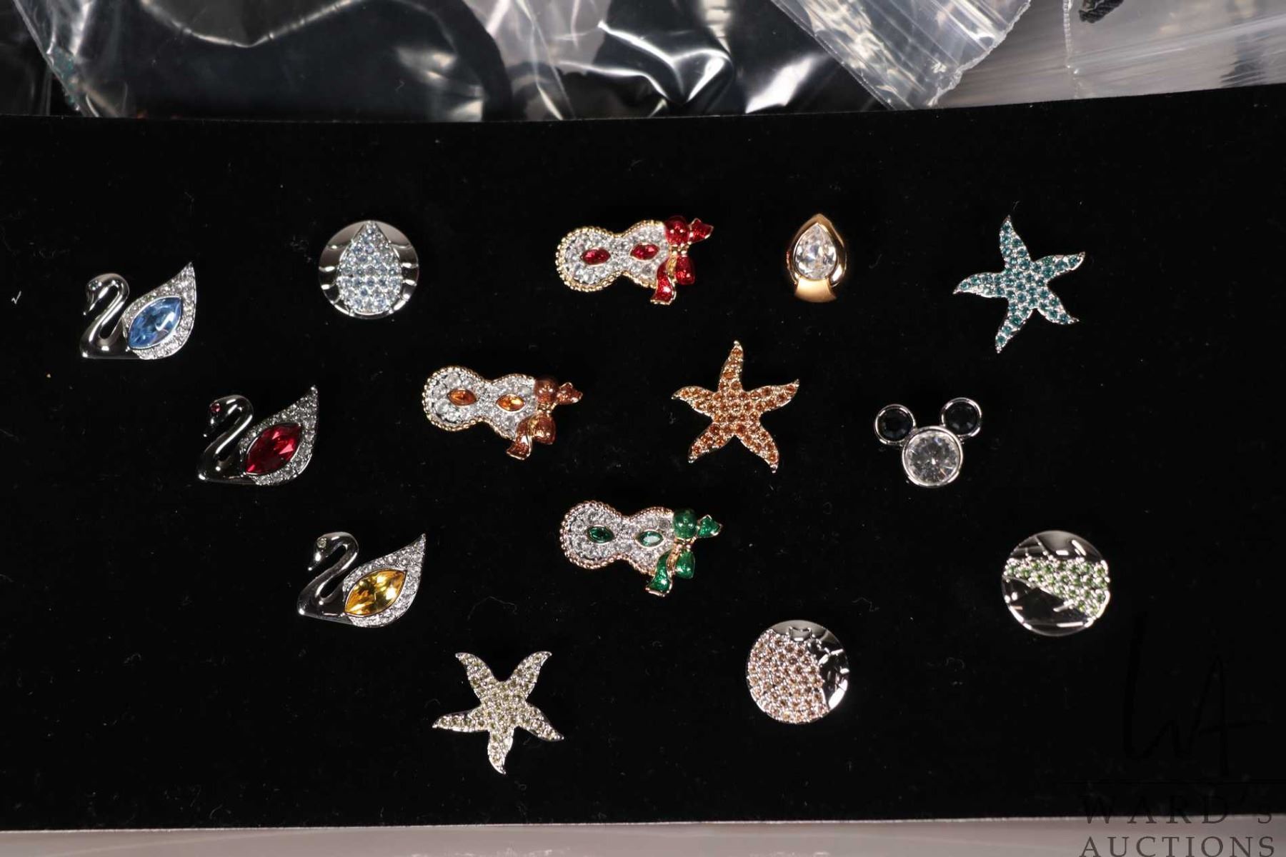 Tray lot containing 44 count of lapel pins each with individual black velvet bags