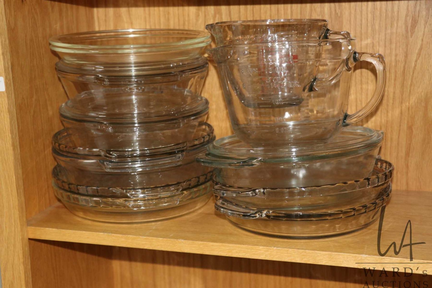 Selection of Anchor Hocking glass cookware including three lidded casserole dishes, six pie plates, two graduated measuring cups etc.