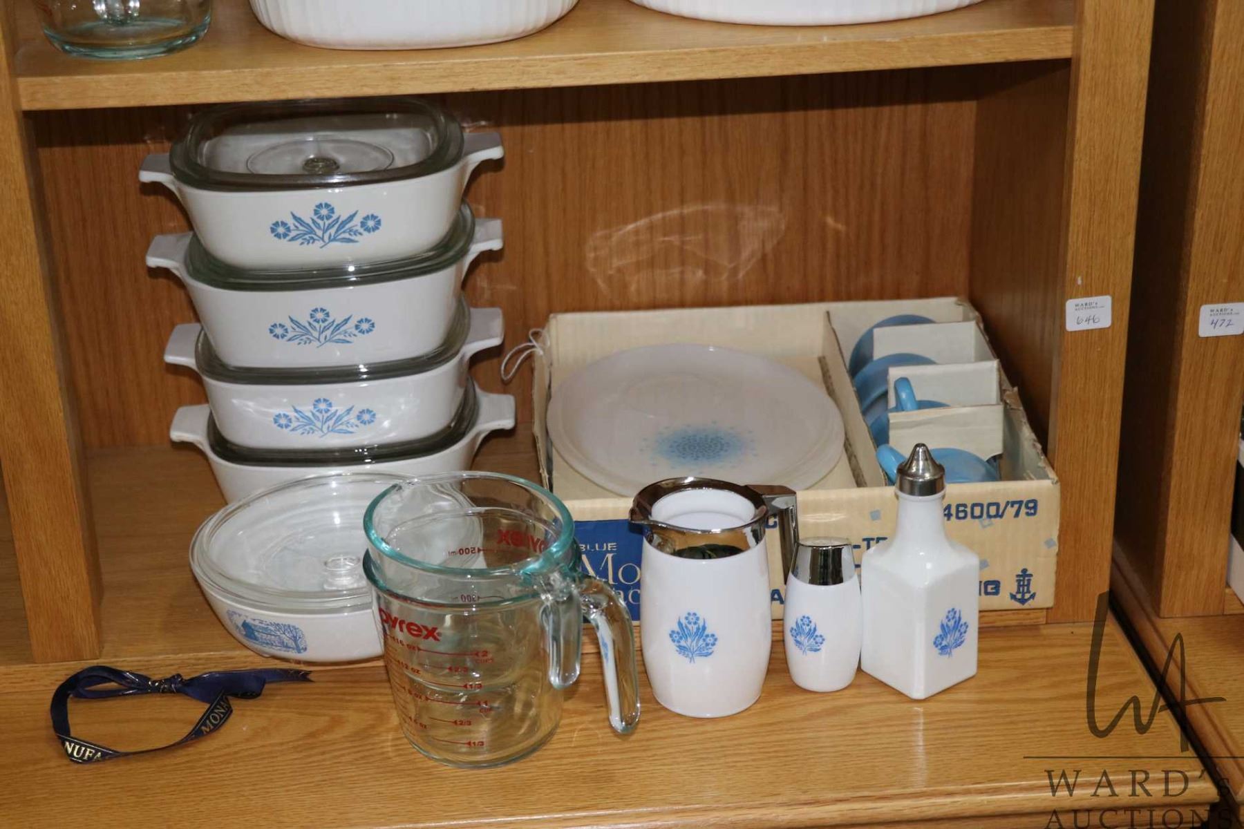 Lot 646 Selection of vintage cookware including Anchor Hocking Blue Mosiac snack set, four lidded casserole