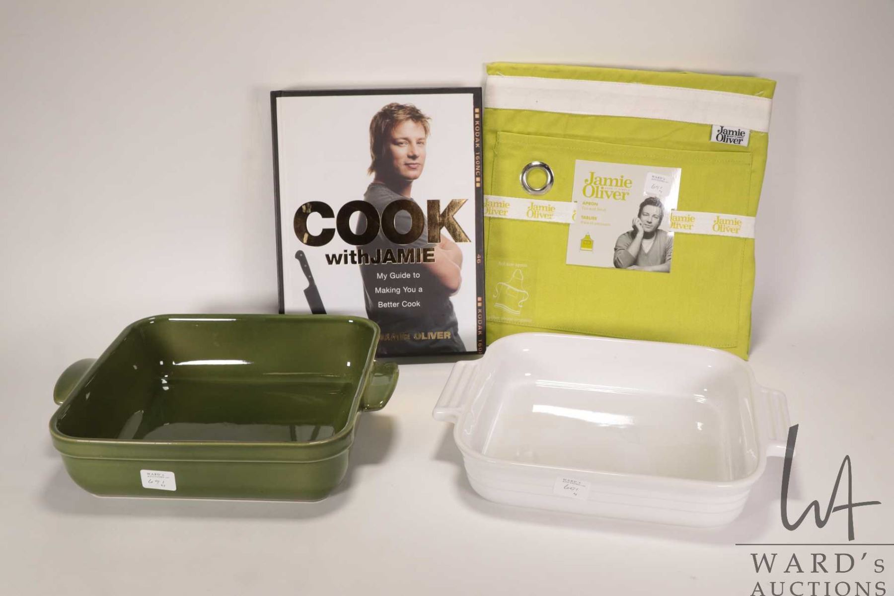 Cook with Jamie Jamie Oliver hardcover cookbook, Jamie Oliver cooking apron plus two ceramic baking dishes including Le Creuset and Emile Henry France