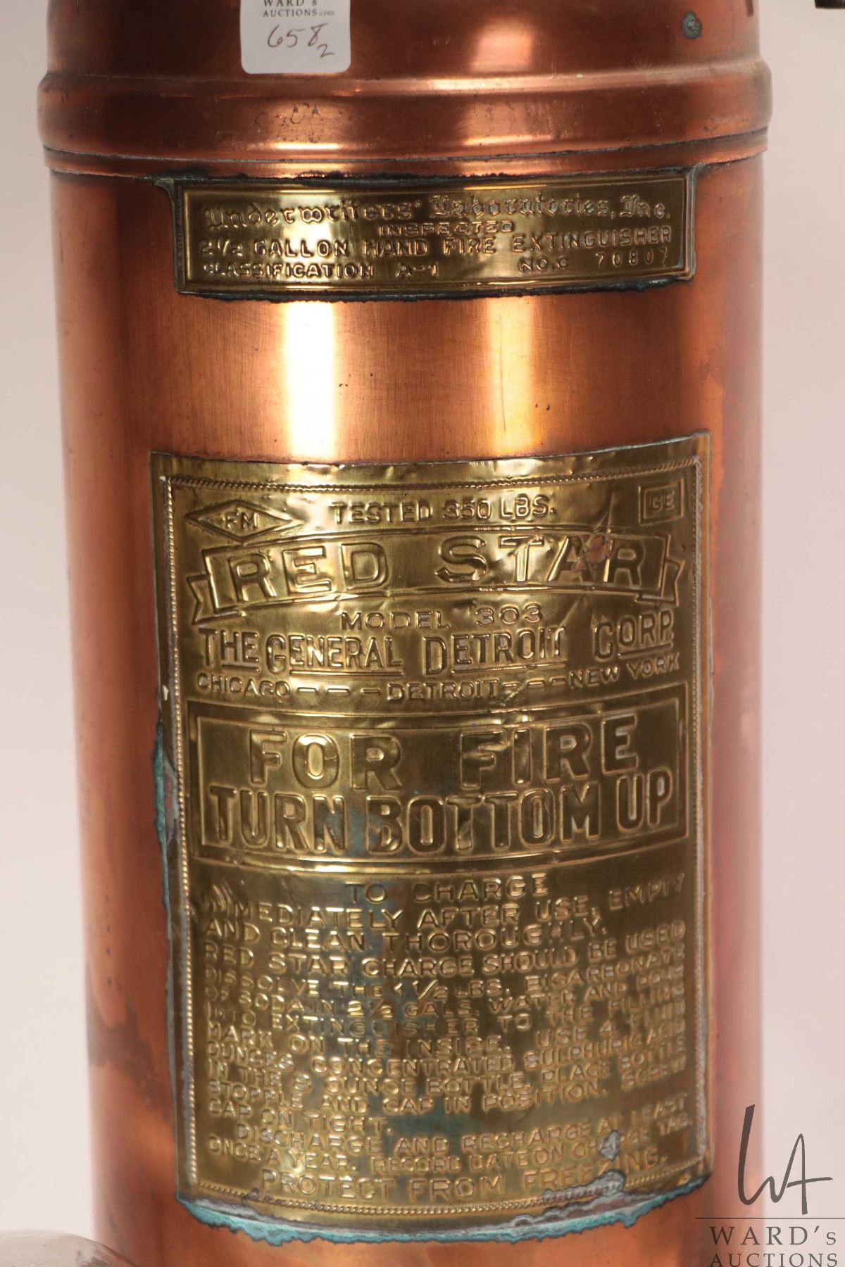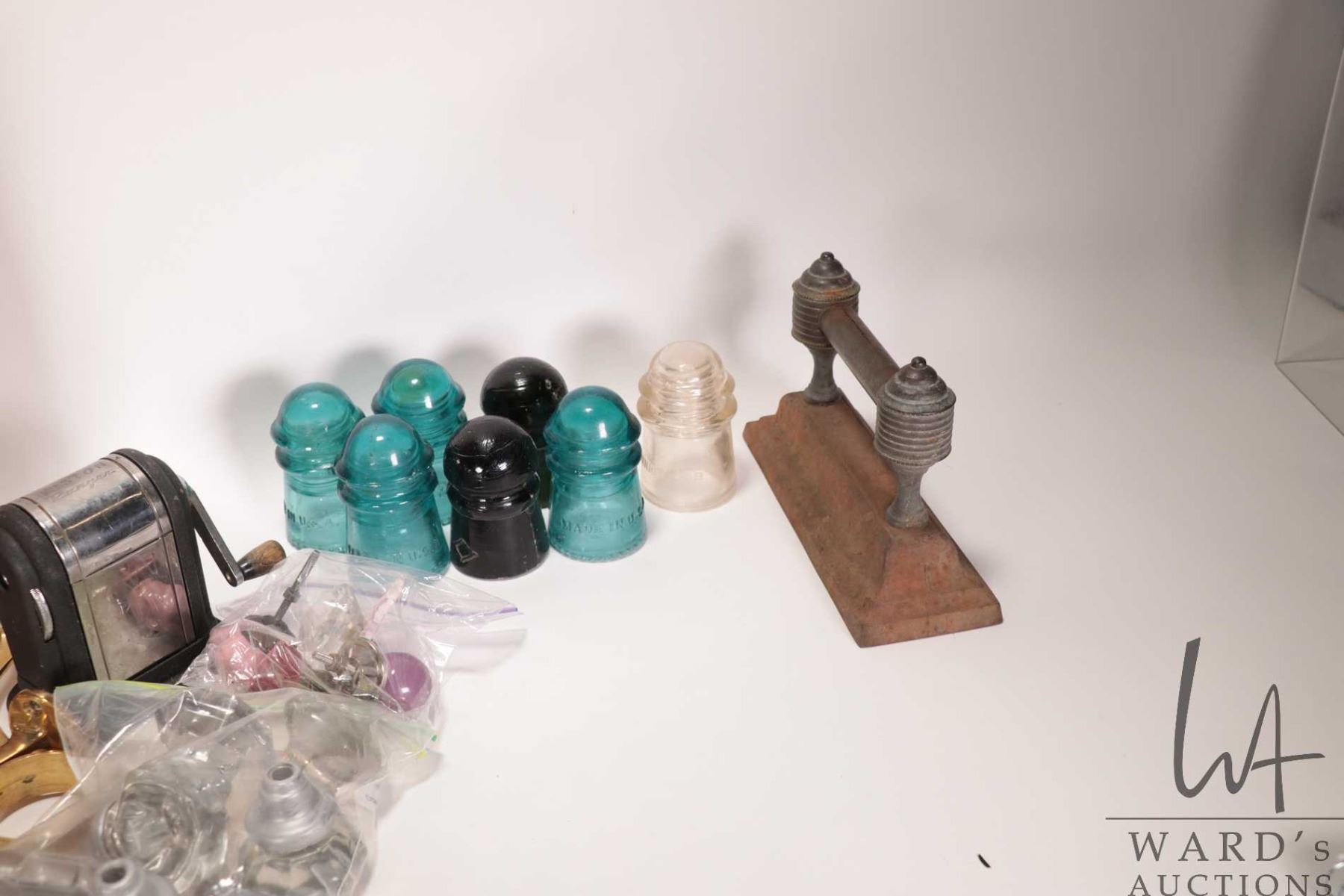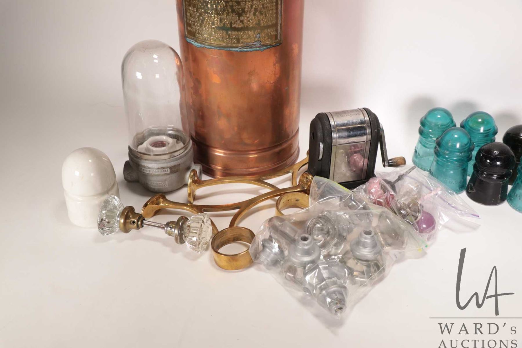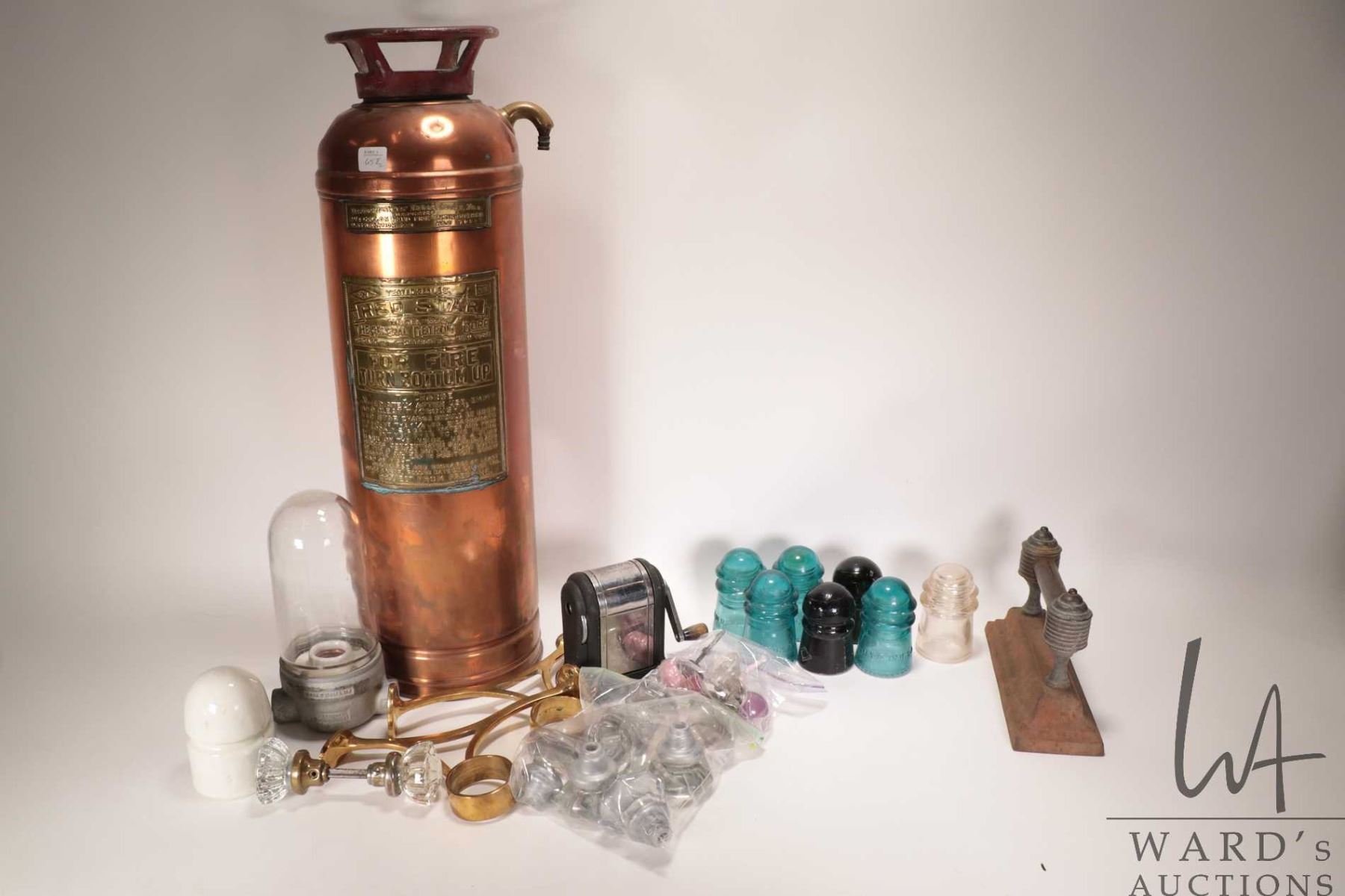 Selection of vintage collectibles including Crouse-Hinds "Condulet" explosion-proff light fixture, 24" copper and brass fire extinguisher, eight glass insulators, a single firedog, six single and one pair set of glass door handles, brass foot supports for bar