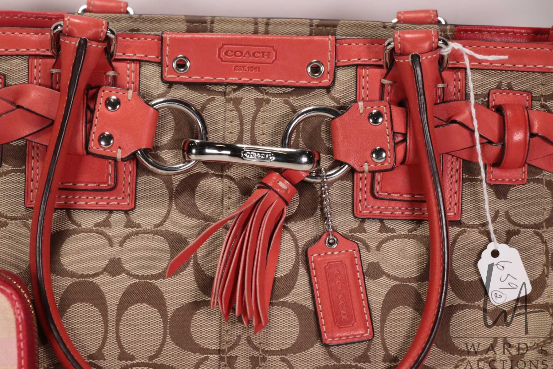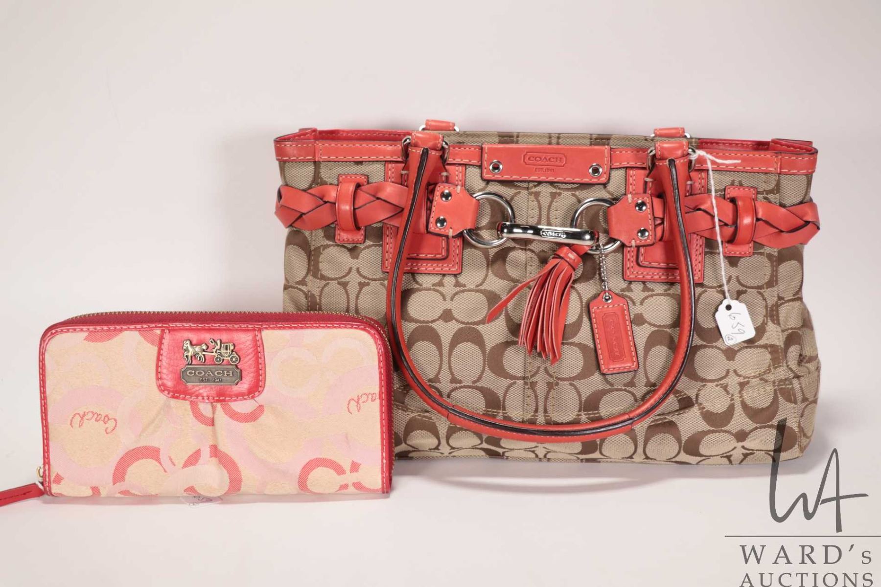 Lot 659 Selection of Coach purses and wallets including Hampton Signature beige canvas, serial no. F15665 an
