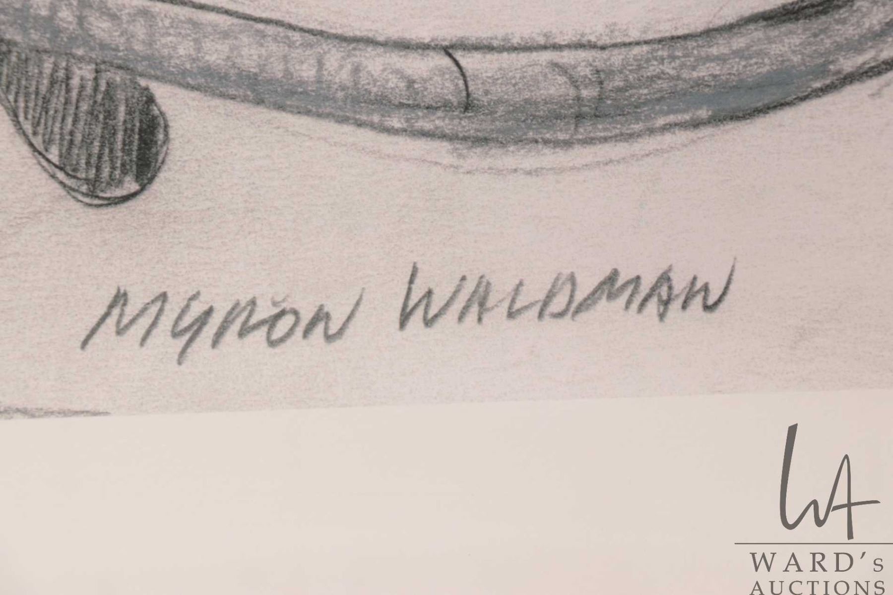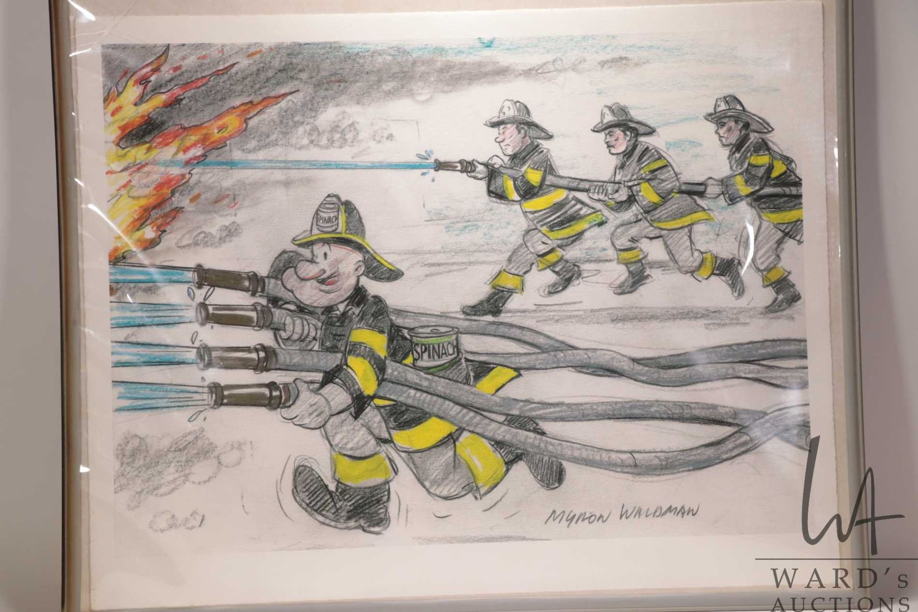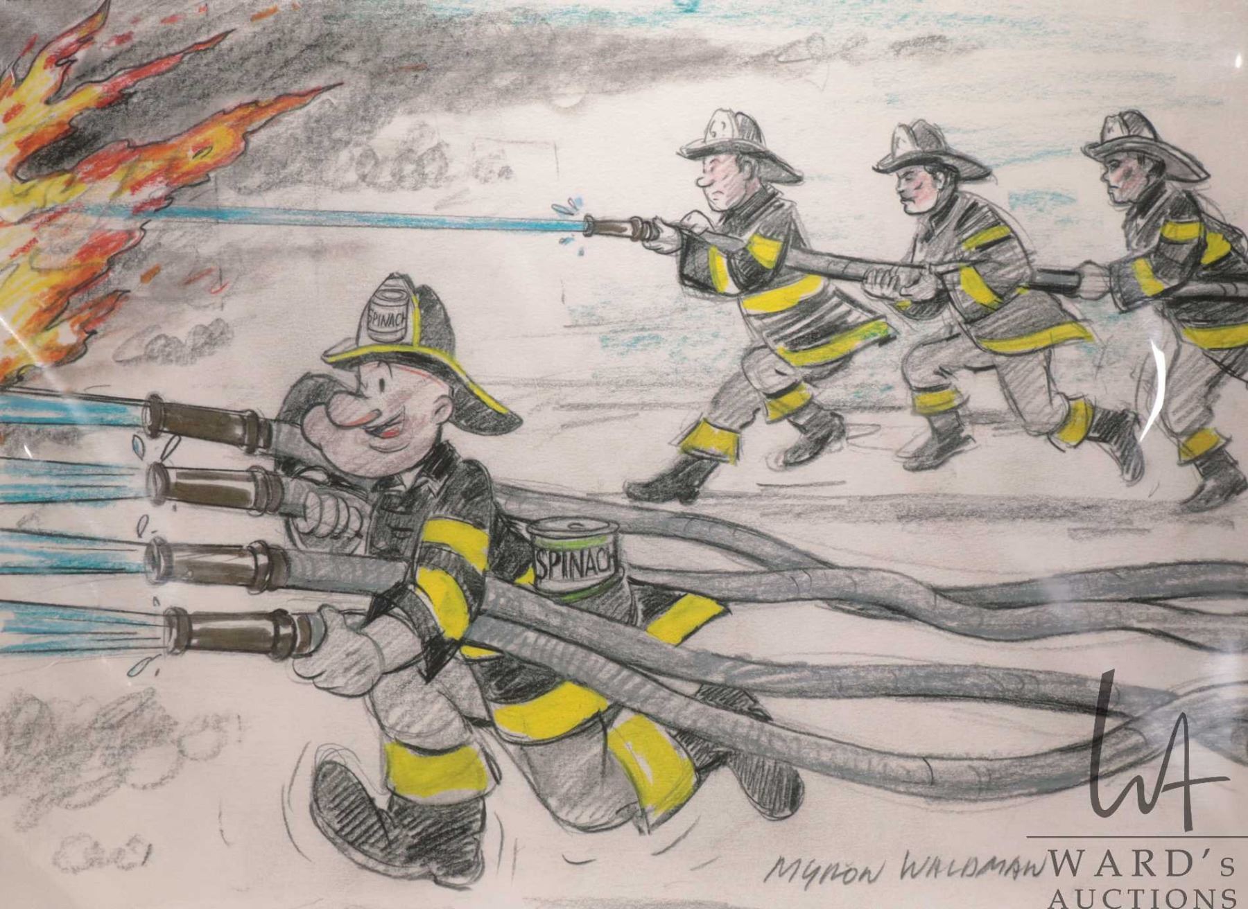Lot 672 Myron Waldman, unframed coloured pencil on paper drawing of Popeye as a fire fighter, 22" X 28"