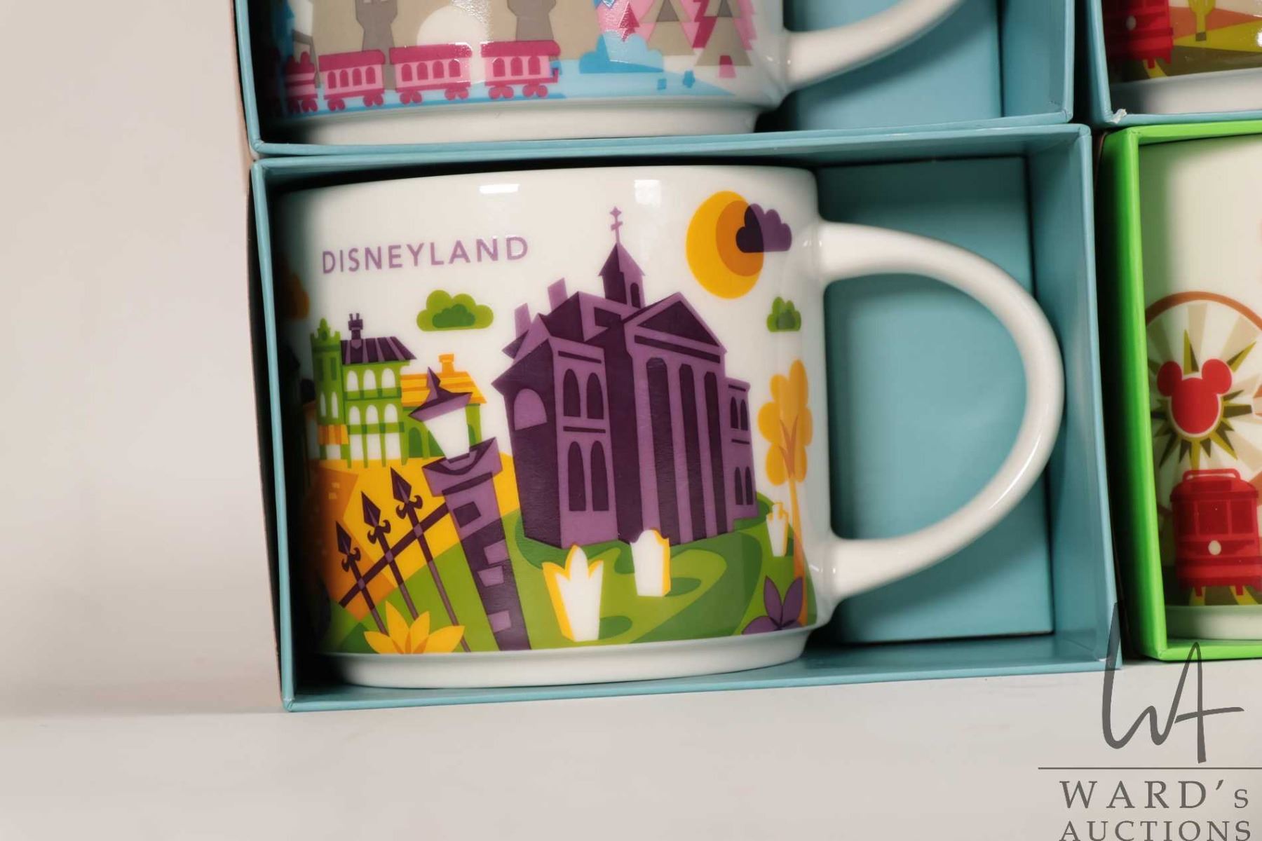 Seven Starbucks coffee mugs Disney Parks "You Are Here" collection featuring Orlean Square with purple haunted mansion plus Epcot, California Disney Adventure etc.