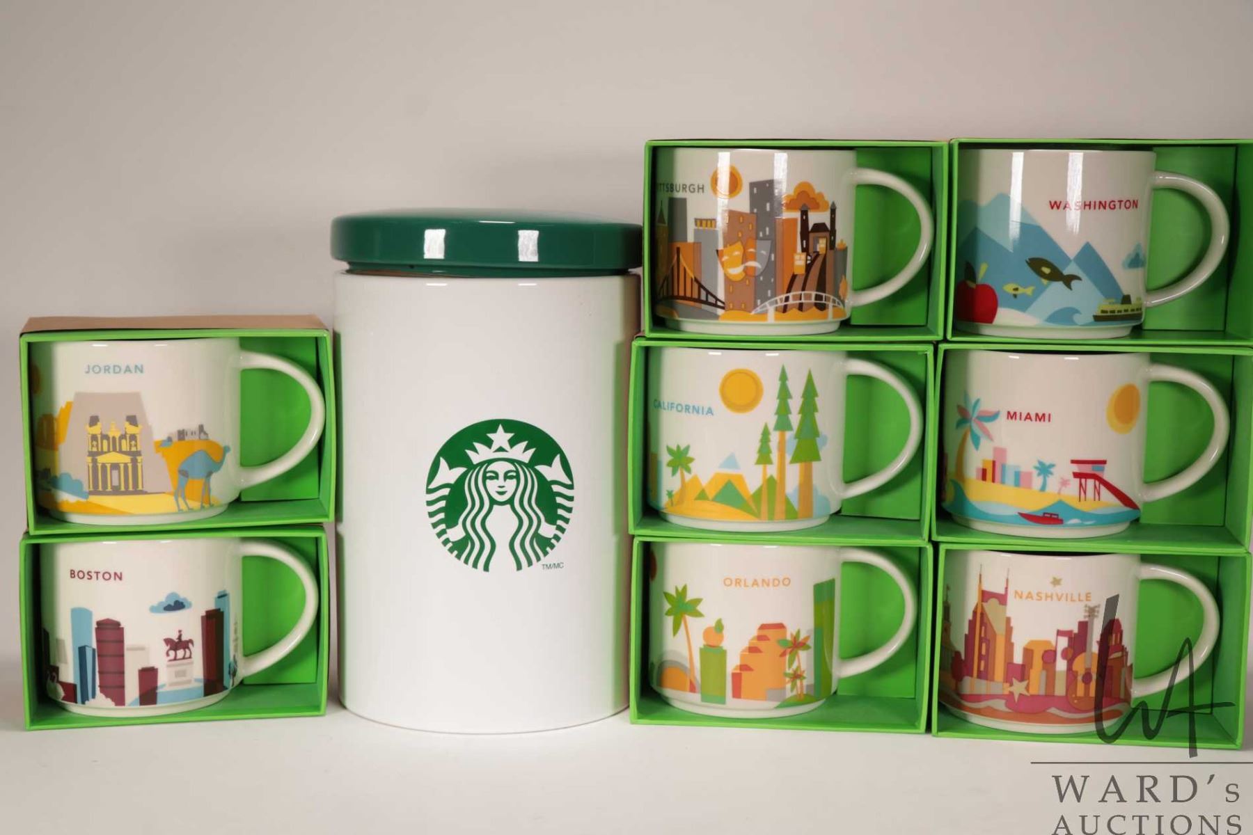 Eight Starbucks coffee mugs from the "You Are Here" collection including Boston, Nashville, Orlando etc. plus a Starbucks canister