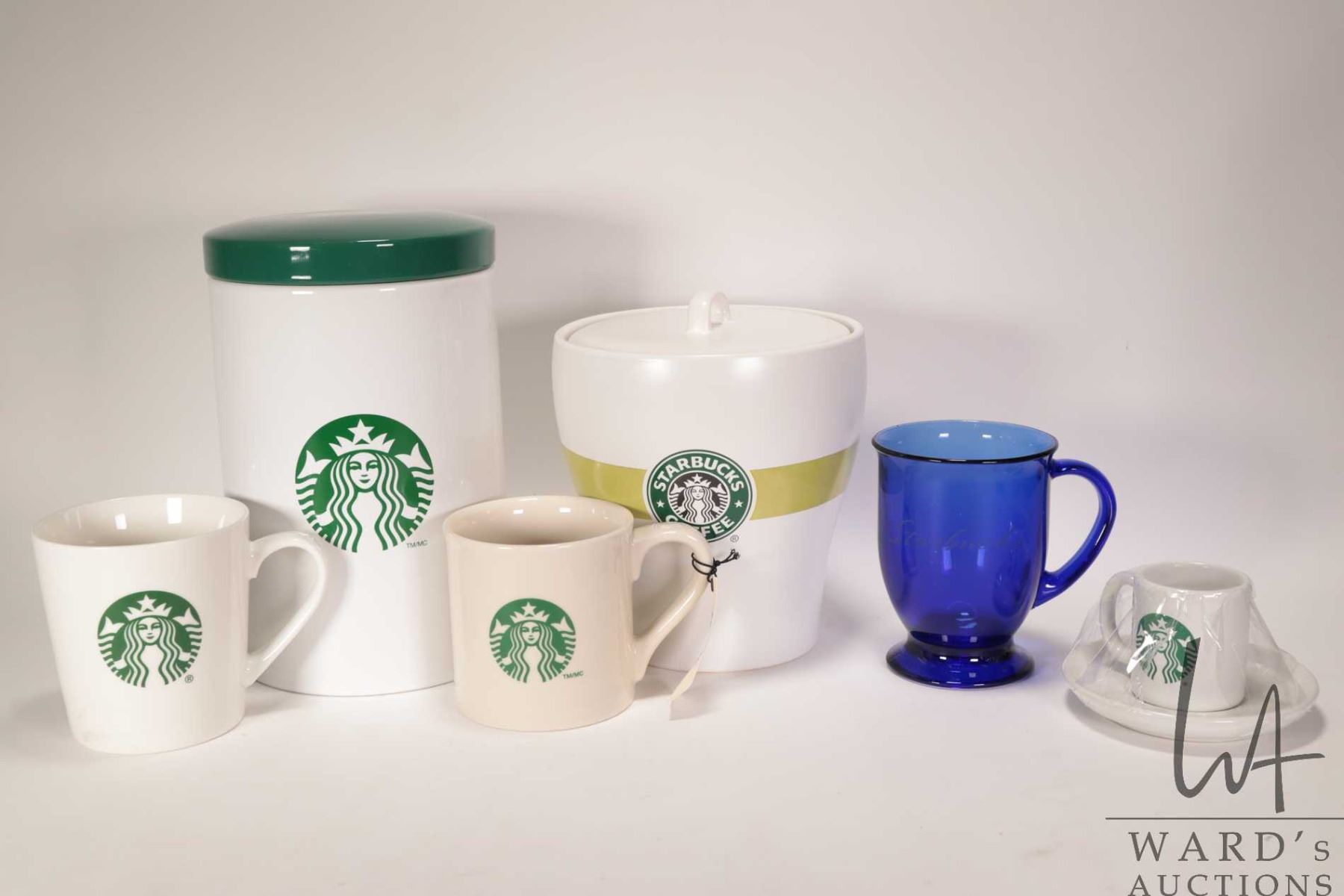 Selection of six Starbucks collectibles including mugs, espresso cup with saucer and two lidded canisters