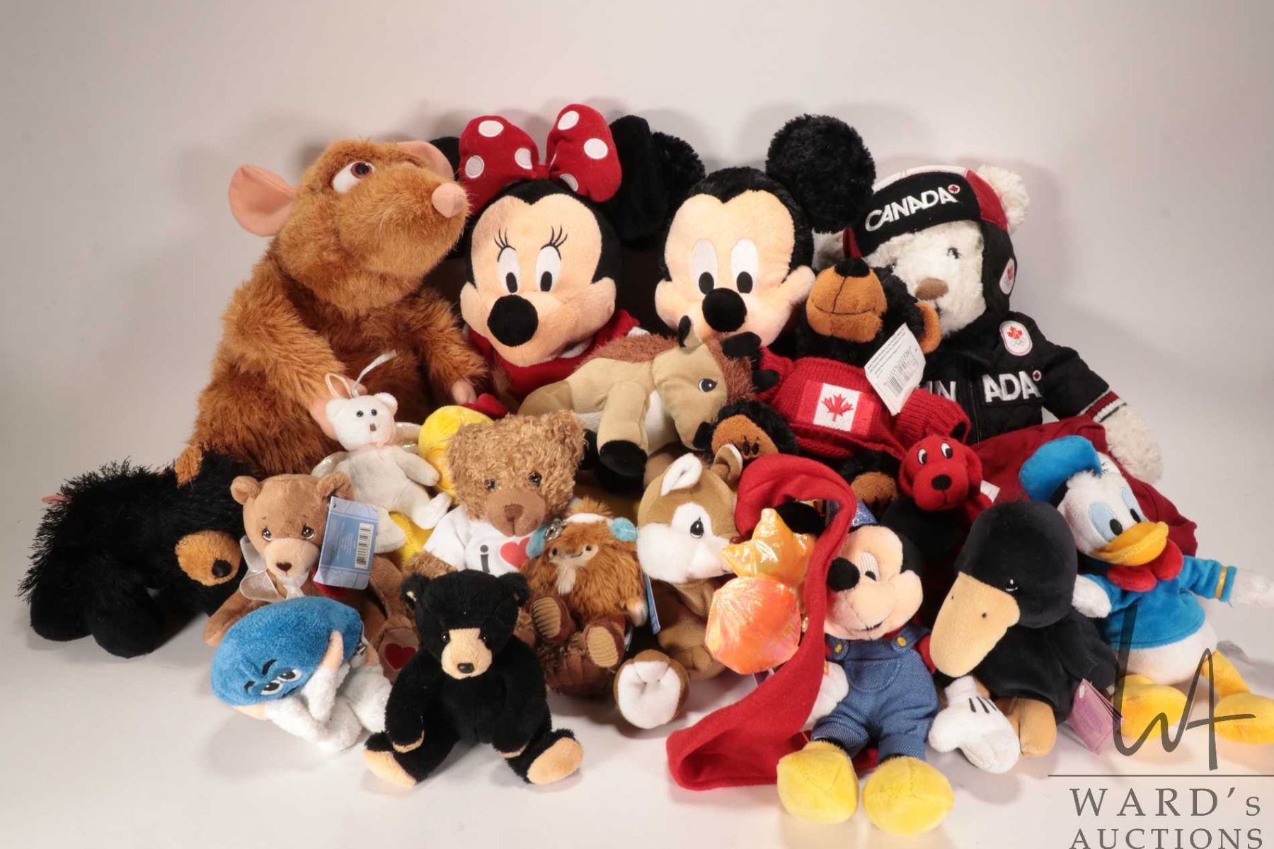 Selection of bears and stuffed toys including Hudson's Bay Olympics, Disney Mickey, Minnie X 2 plus Donald Duck, Disney Pixar Ratioulle plus a child's medium Canada t-shirt