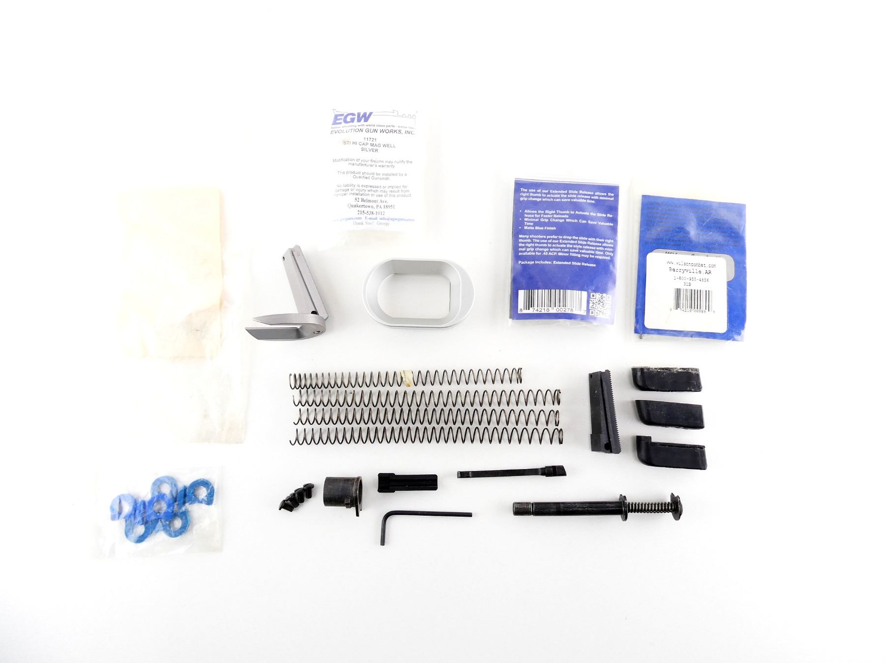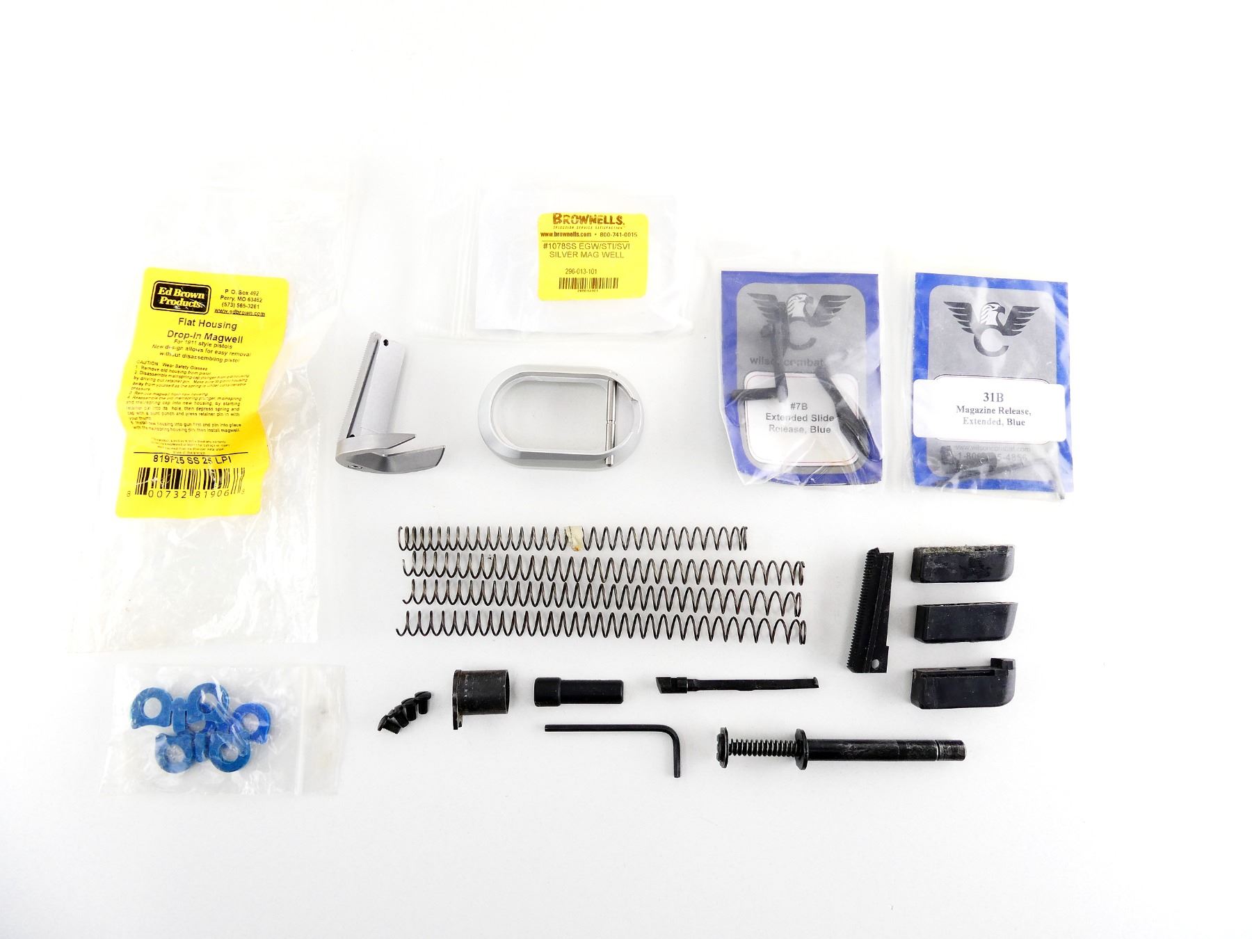 LOT INCLUDES; EXTENDED SLIDE RELEASES, RETURN SPRINGS, BUFFERS, EXTRACTOR, BARREL BUSHING, FLARED MAG WELLS, BACK STRAP, GRIP SCREWS, RECOIL BUFFERS, ETC. MAY REQUIRE FITTING. SEE PHOTOS.