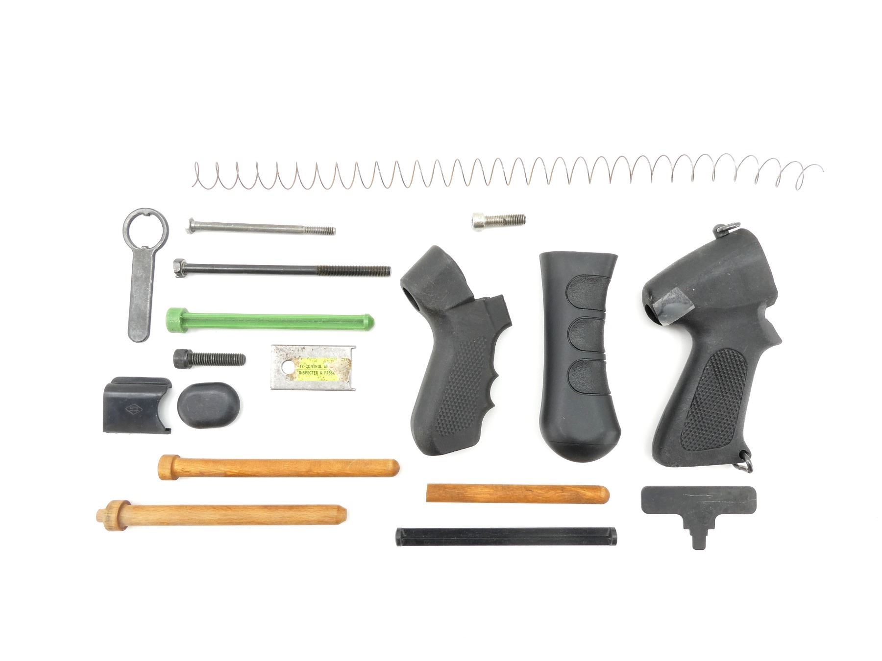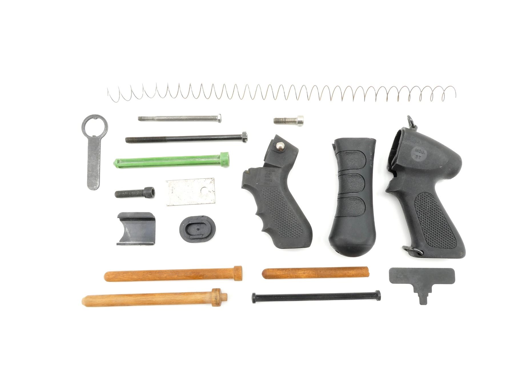 LOT INCLUDES; (1) ITHACA MODEL 37 PISTOL GRIP - NO SCREW, (1) MOSSBERG 500 PISTOL GRIP WITH SCREW, (1) UNKNOWN PISTOL GRIP WITH SCREW, VARIOUS MAG TUBE PLUGS, STOCK BOLTS, ETC. MAY REQUIRE FITTING. SEE PHOTOS.