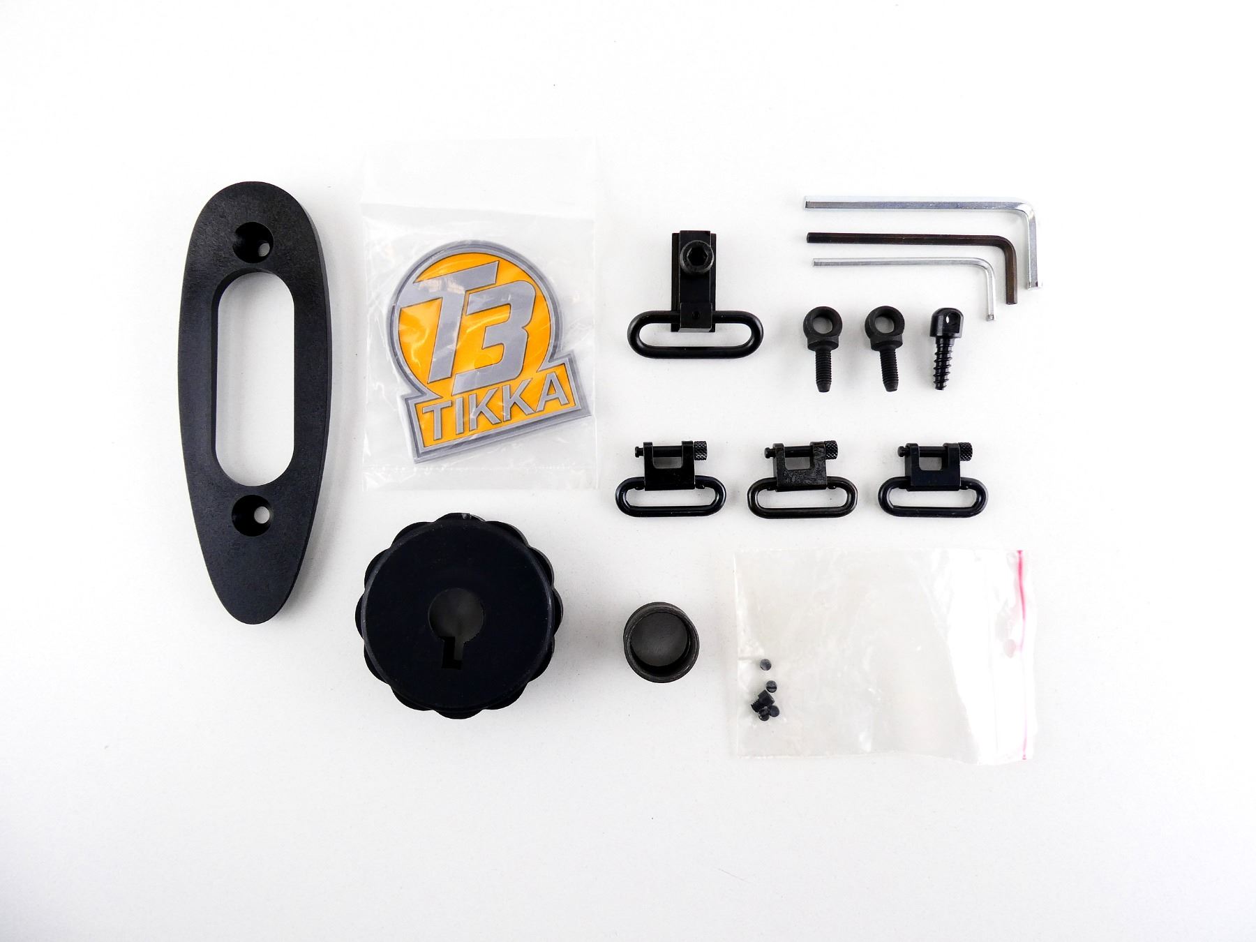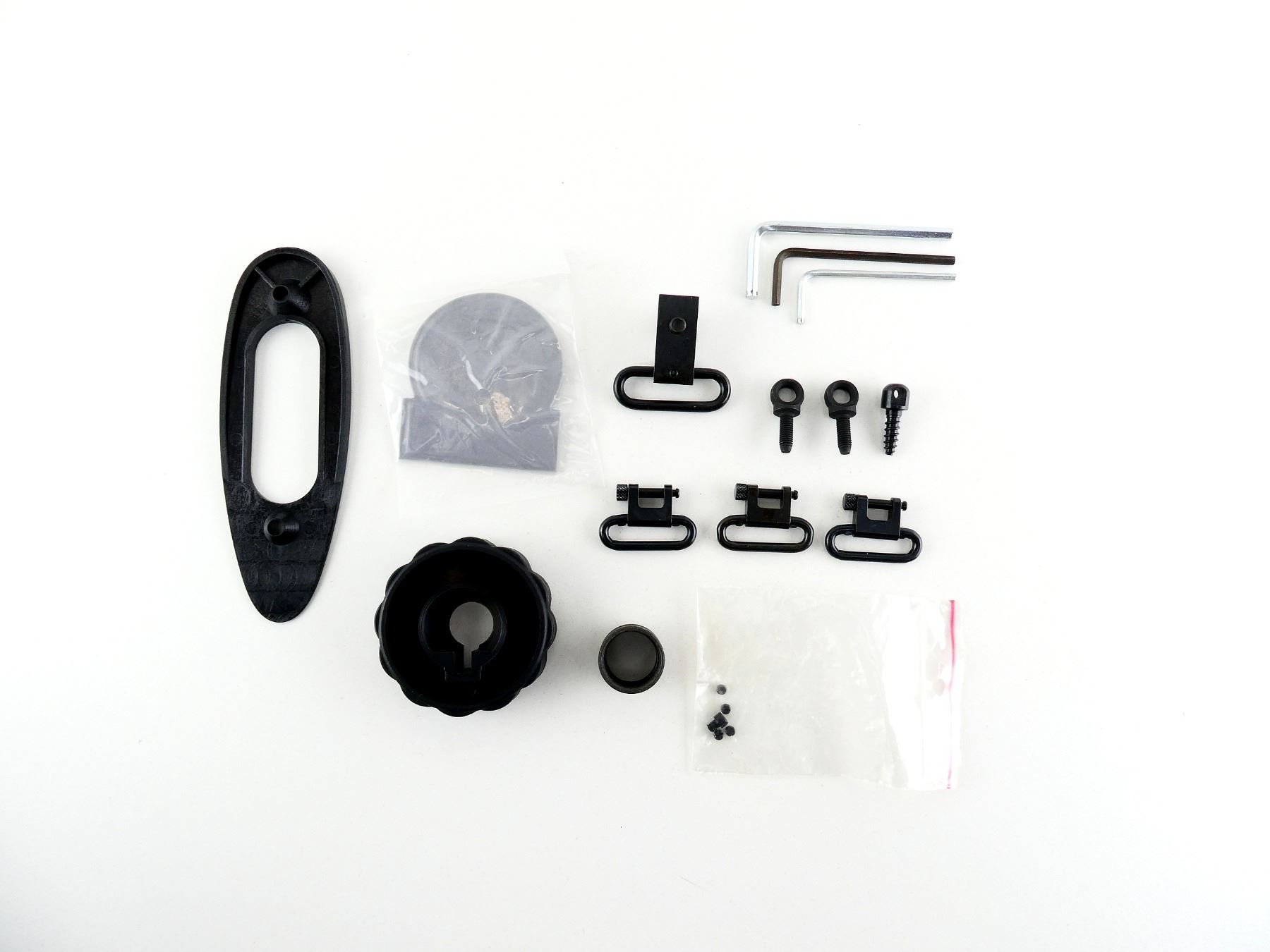 LOT INCLUDES; BOLT DISASSEMBLY TOOL, ALLEN KEYS, MUZZLE CAP, SWIVELS, PLUG SCREWS, STOCK SPACER, PATCH, ETC. MAY REQUIRE FITTING. SEE PHOTOS.