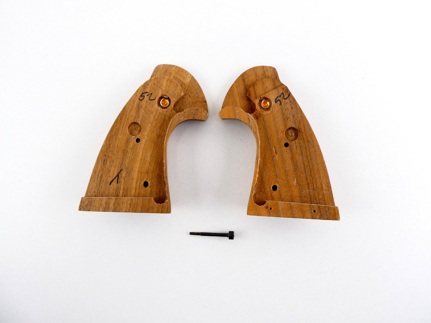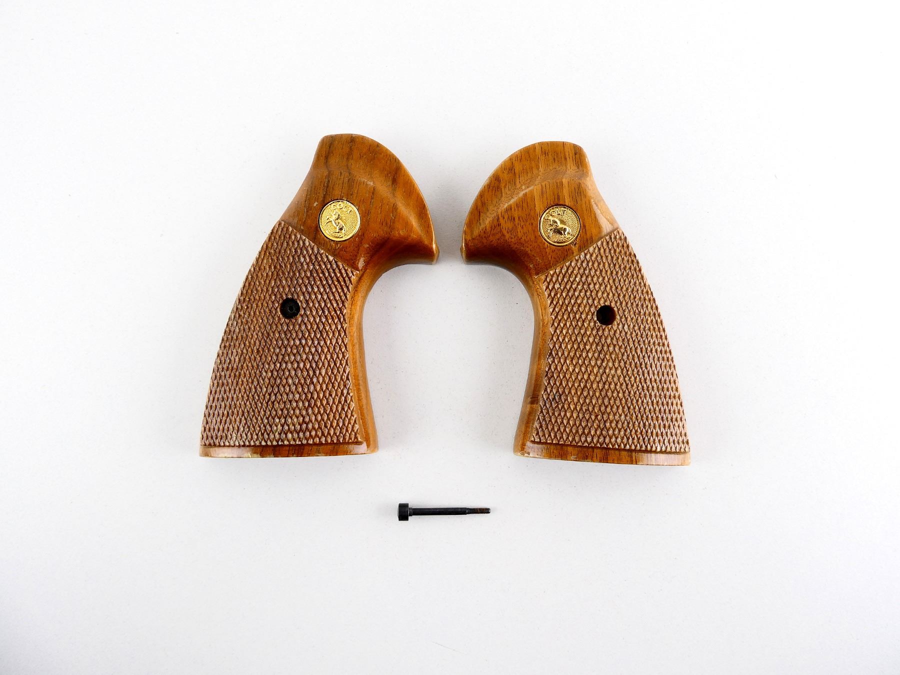 (1) SET OF CHECKERED WOOD GRIPS, WITH SCREW, FITS COLT PYTHON REVOLVERS, WITH COLT MEDALLION. MAY REQUIRE FITTING. SEE PHOTOS.