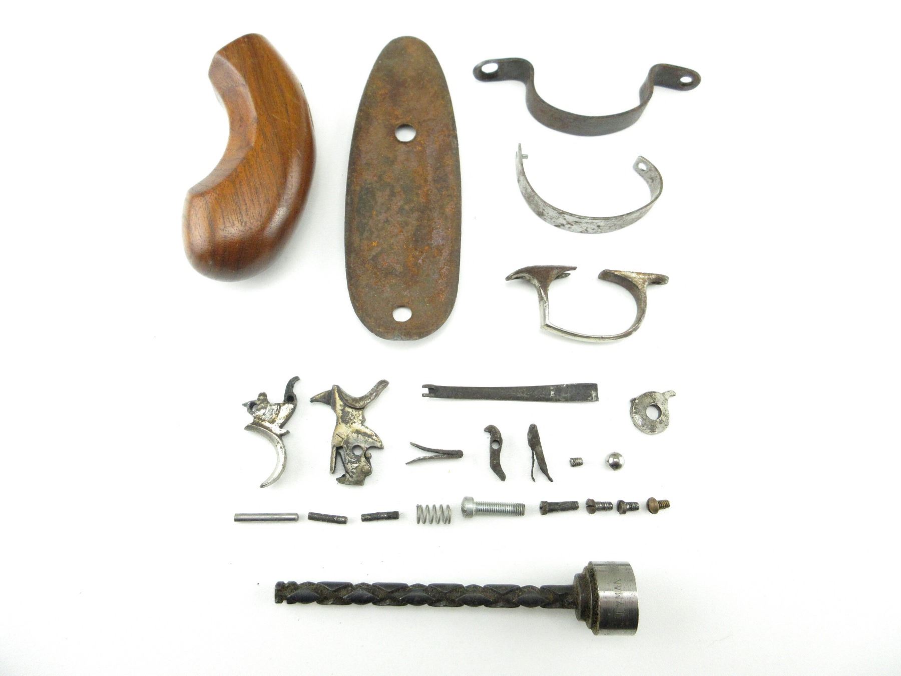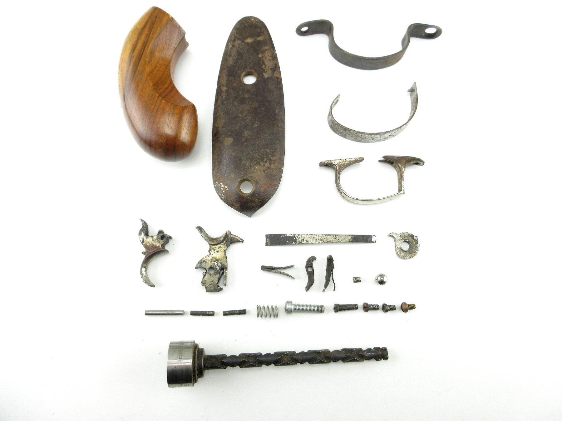 LOT INCLUDES; STEEL BUTT PLATE, STEEL TRIGGER GUARD, WOOD GRIPS, LYMAN 16 GAUGE CRIMP, UNKNOWN REVOLVER PARTS: HAMMER, TRIGGER & GUARD, MAIN SPRING, ETC. MAY REQUIRE FITTING. SEE PHOTOS.