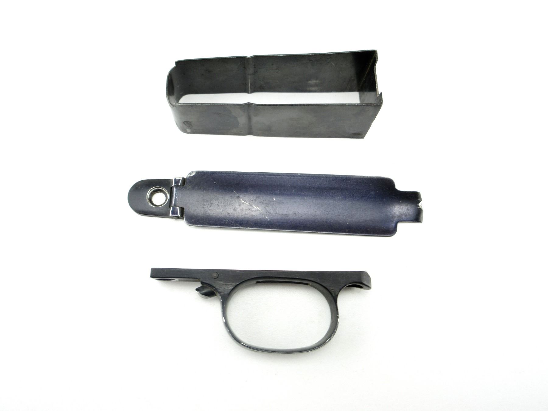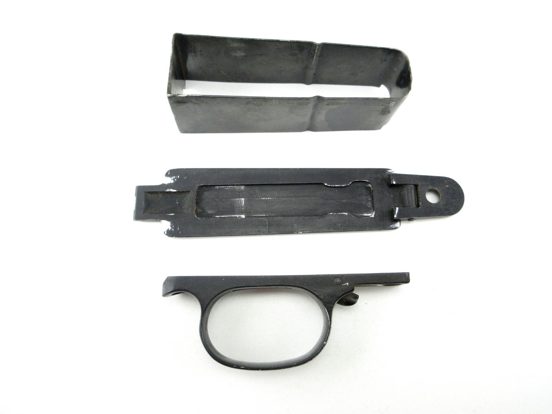 LOT INCLUDES; (1) TRIGGER GUARD, BLACK ALLOY CONSTRUCTION, UNMARKED & (1) FLOOR PLATE, BLACK ALLOY CONSTRUCTION, UNMARKED, TOTAL OVERALL LENGTH APPROX. 8.5". MAY REQUIRE FITTING. SEE PHOTOS.