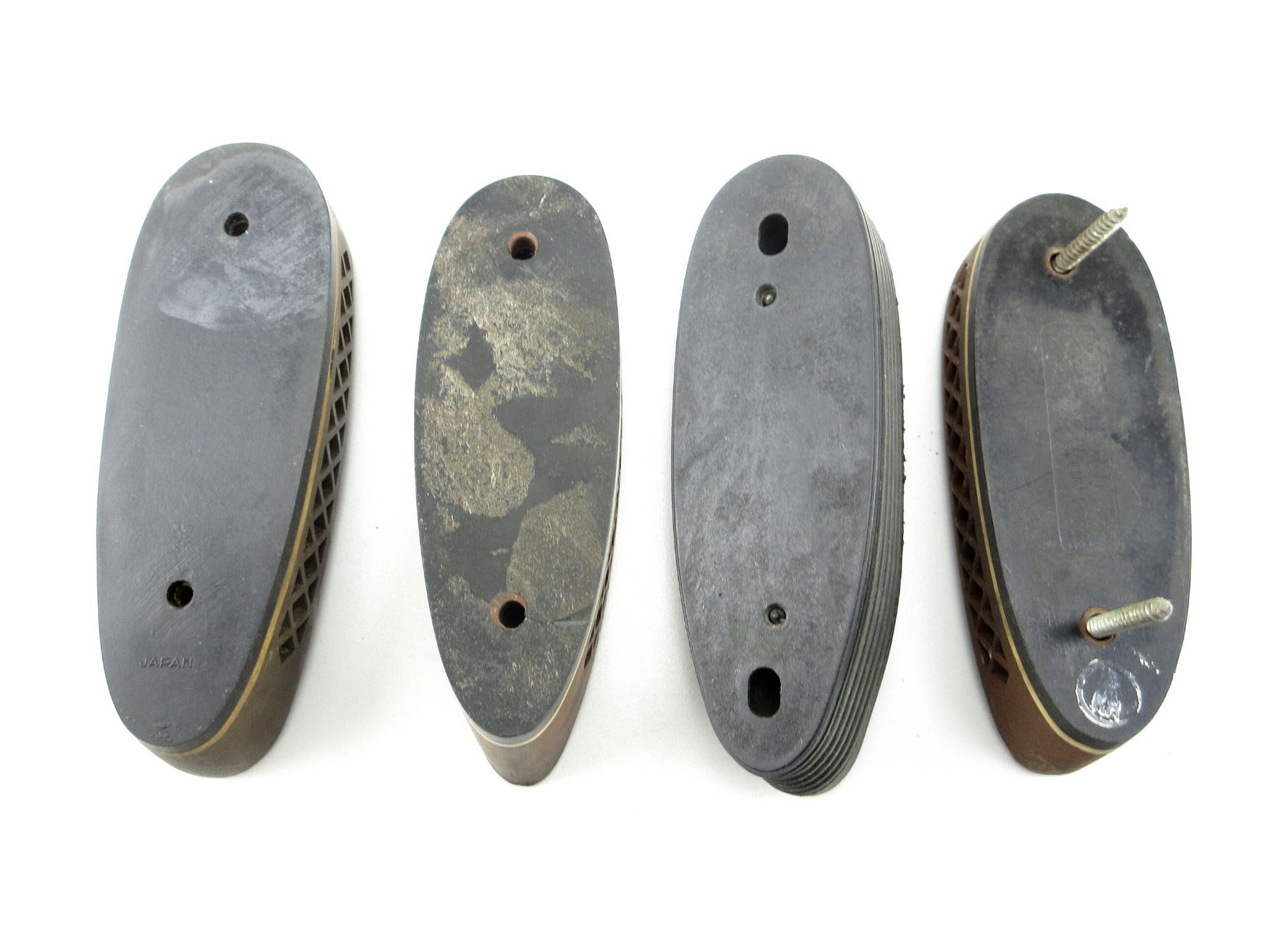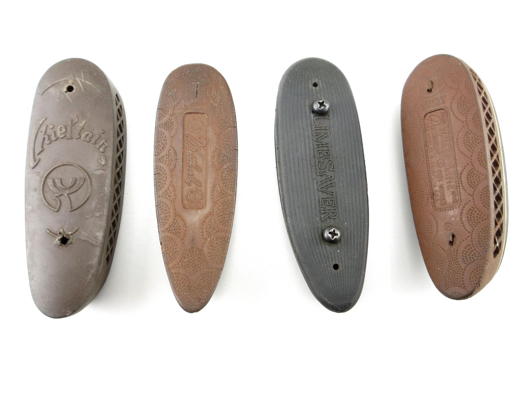 LOT INCLUDES; (1) LIMBSAVER BLACK RUBBER RECOIL PAD, (1) WEATHERBY BROWN RUBBER RECOIL PAD, (1) PACHMAYR BROWN RUBBER RECOIL PAD & (1) CHIEFTAIN BROWN RUBBER RECOIL PAD. MAY REQUIRE FITTING. SEE PHOTOS.