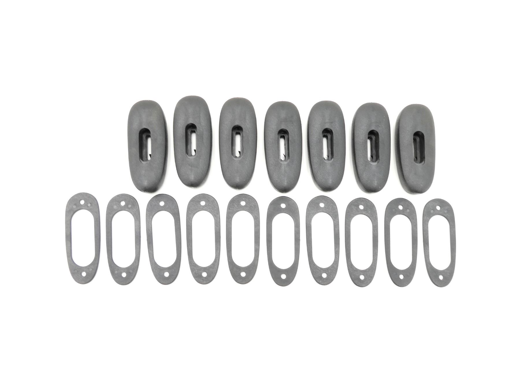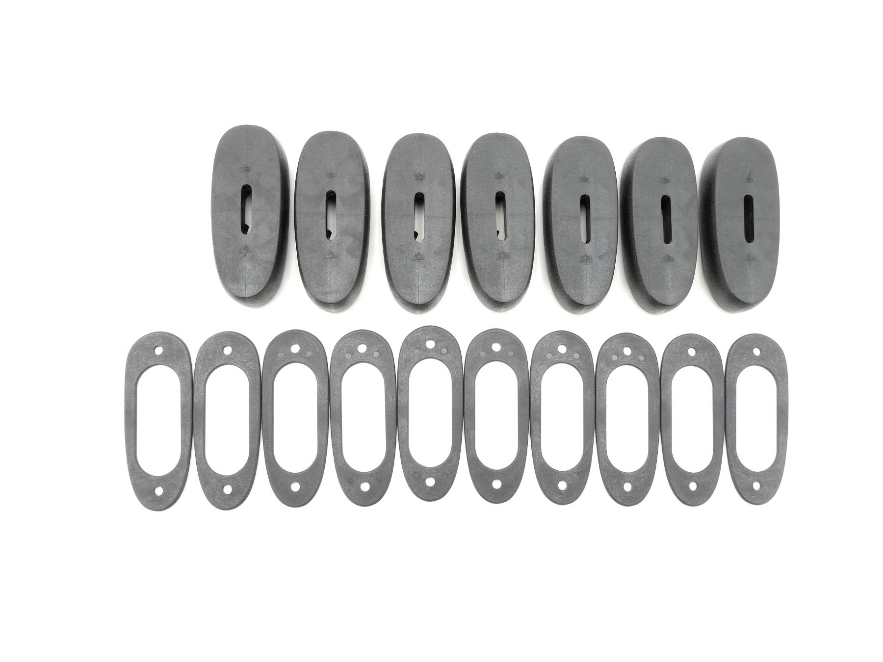 LOT INCLUDES; (7) UNKNOWN BLACK POLYMER BUTT PLATES, UNMARKED & (10) BLACK POLYMER SPACERS. MAY REQUIRE FITTING. SEE PHOTOS.