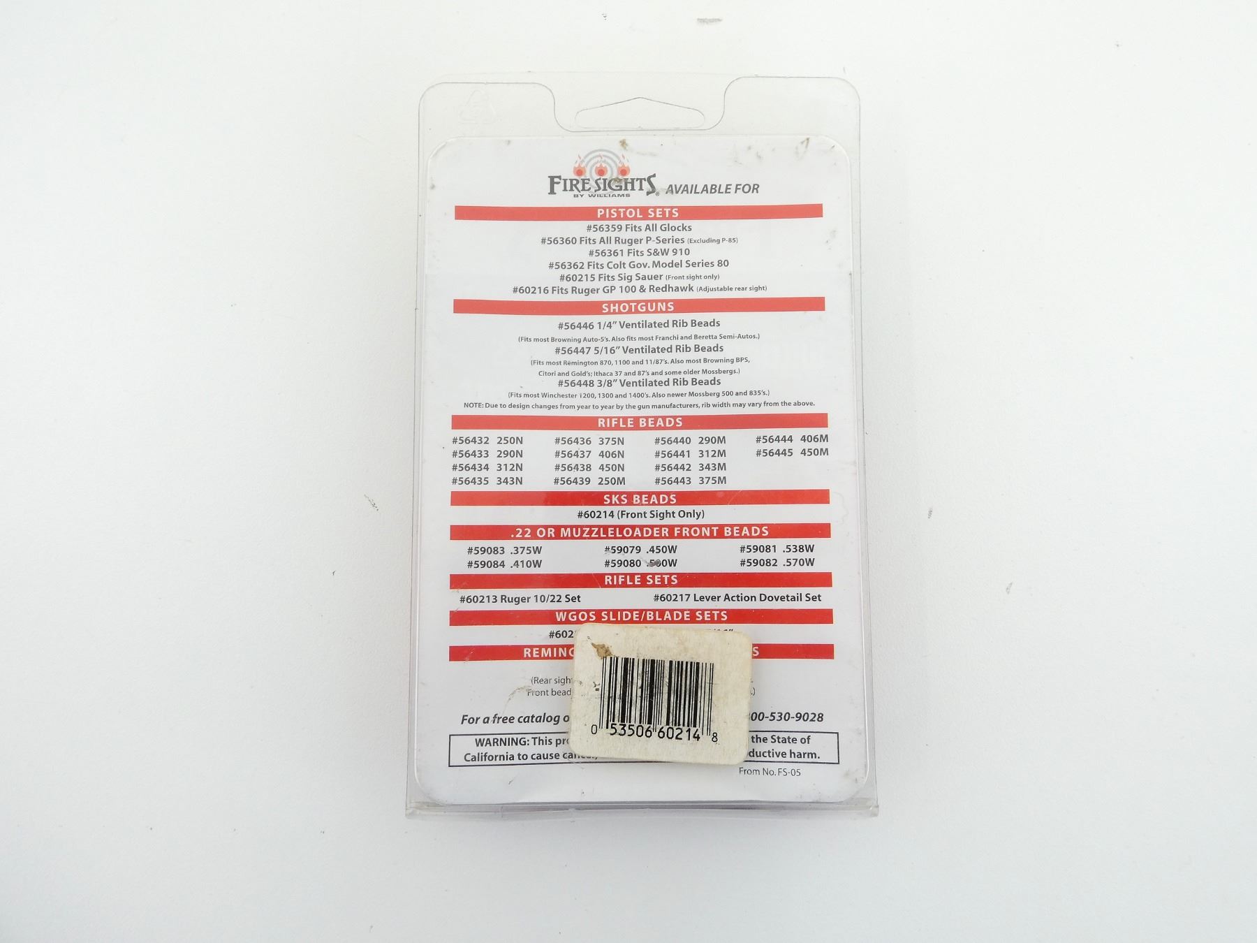 (1) FRONT SIGHT, BLACK ALUMINIUM, PART #: 60214, APPEARS NEW OLD STOCK IN ORIGINAL PACKAGING, MAY NOT BE COMPLETE. MAY REQUIRE FITTING. SEE PHOTOS.