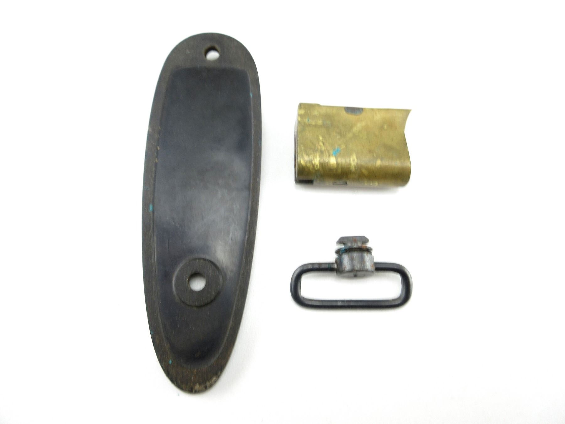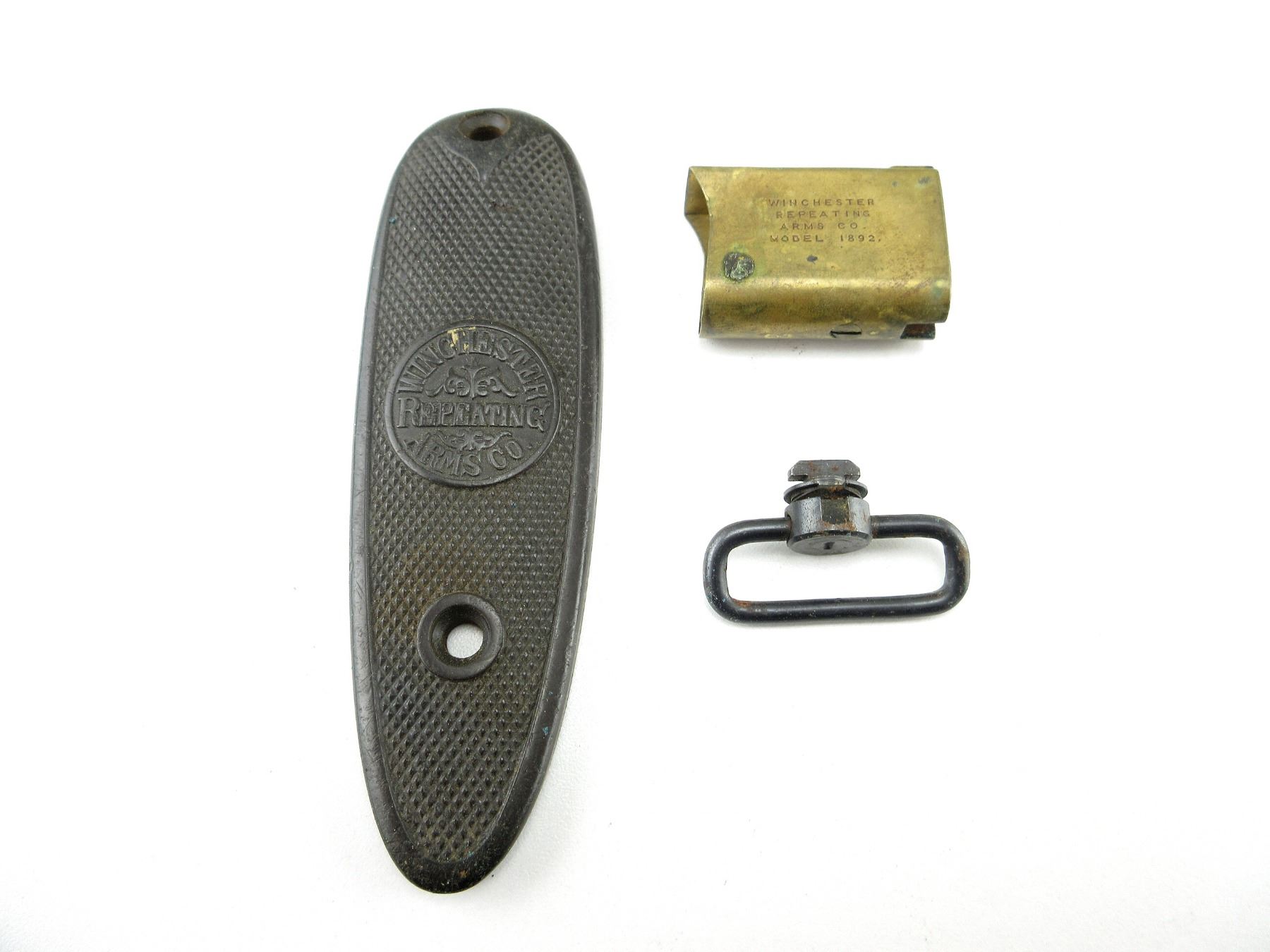 LOT INCLUDES; (1) WINCHESTER 1892 BORE MIRROR, BRASS CONSTRUCTION, MIRROR INTACT, MARKED: "WINCHESTER REPEATING ARMS CO., MODEL 1892", (1) UNKNOWN WINCHESTER CHECKERED BLACK POLYMER BUTT PLATE, NO SCREWS & (1) MOSSBERG SLING SWIVEL. MAY REQUIRE FITTING. SEE PHOTOS.