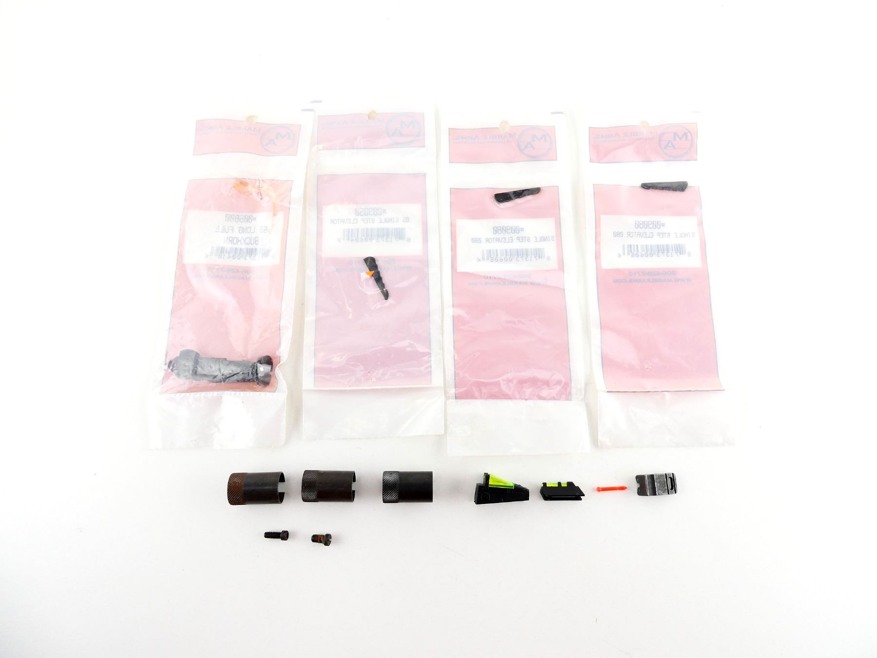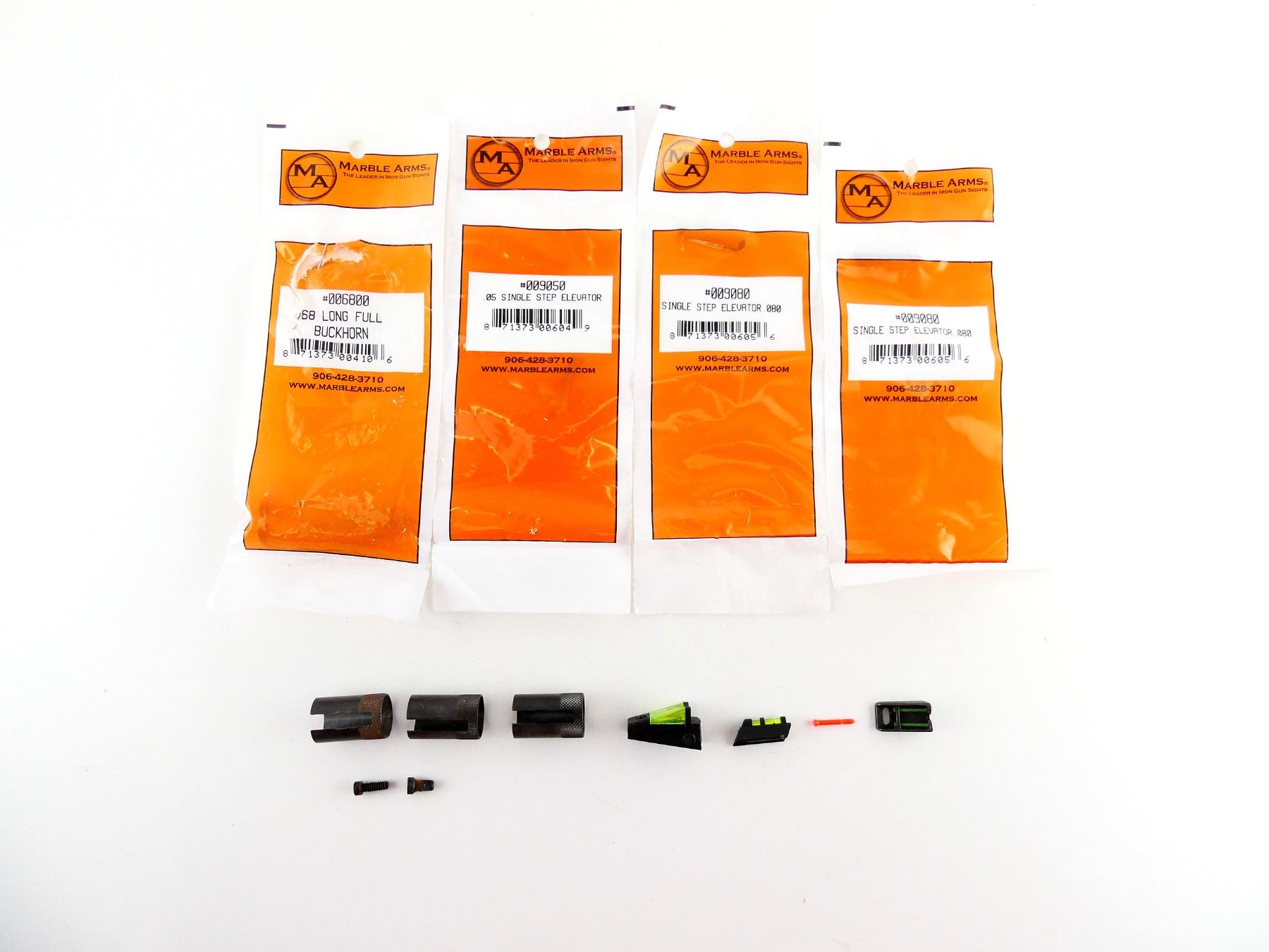 LOT INCLUDES; (1) MARBLE ARMS LONG FULL BUCKHORN REAR SIGHT, PART # 006800, (1) MARBLE ARMS 0.050 SINGLE STEP ELEVATOR, PART #: 009050, (2)MARBLE ARMS 0.080 SINGLE STEP ELEVATORS, PART #: 009080, (1) HIVIZ SIGHT MODEL F301704, (3) FRONT HOODS, ETC. MAY REQUIRE FITTING. SEE PHOTOS.