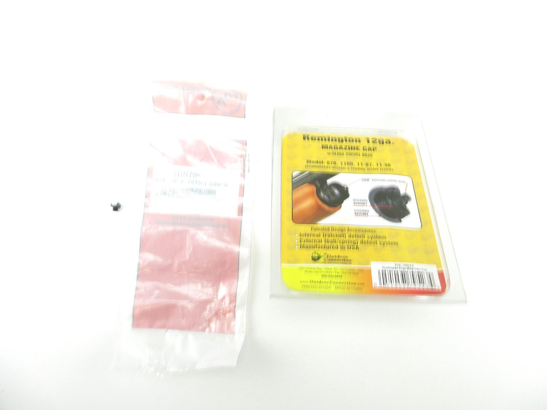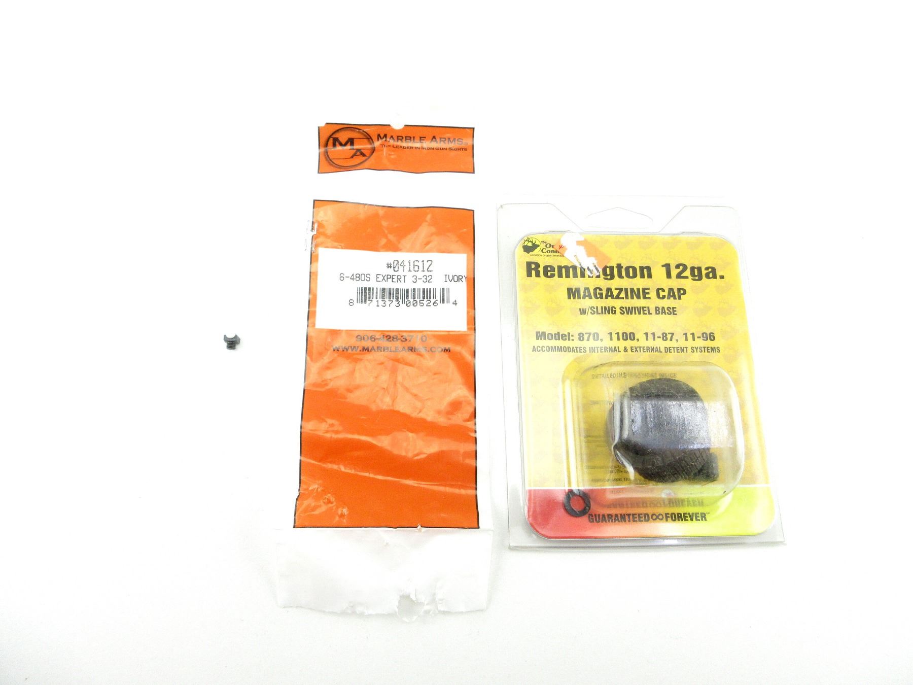 LOT INCLUDES; (1) OUTDOOR CONNECTION REMINGTON 12 GAUGE MAGAZINE CAP WITH SLING SWIVEL BASE, FITS MODELS 870 / 1100 / 11-87 / 11-96 / ETC., APPEARS NEW OLD STOCK IN ORIGINAL PACKAGING & (1) MARBLE ARMS BEAD SIGHT,6-480S EXPERT 3/32 IVORY BEAD, PART #: 041612. MAY REQUIRE FITTING. SEE PHOTOS.