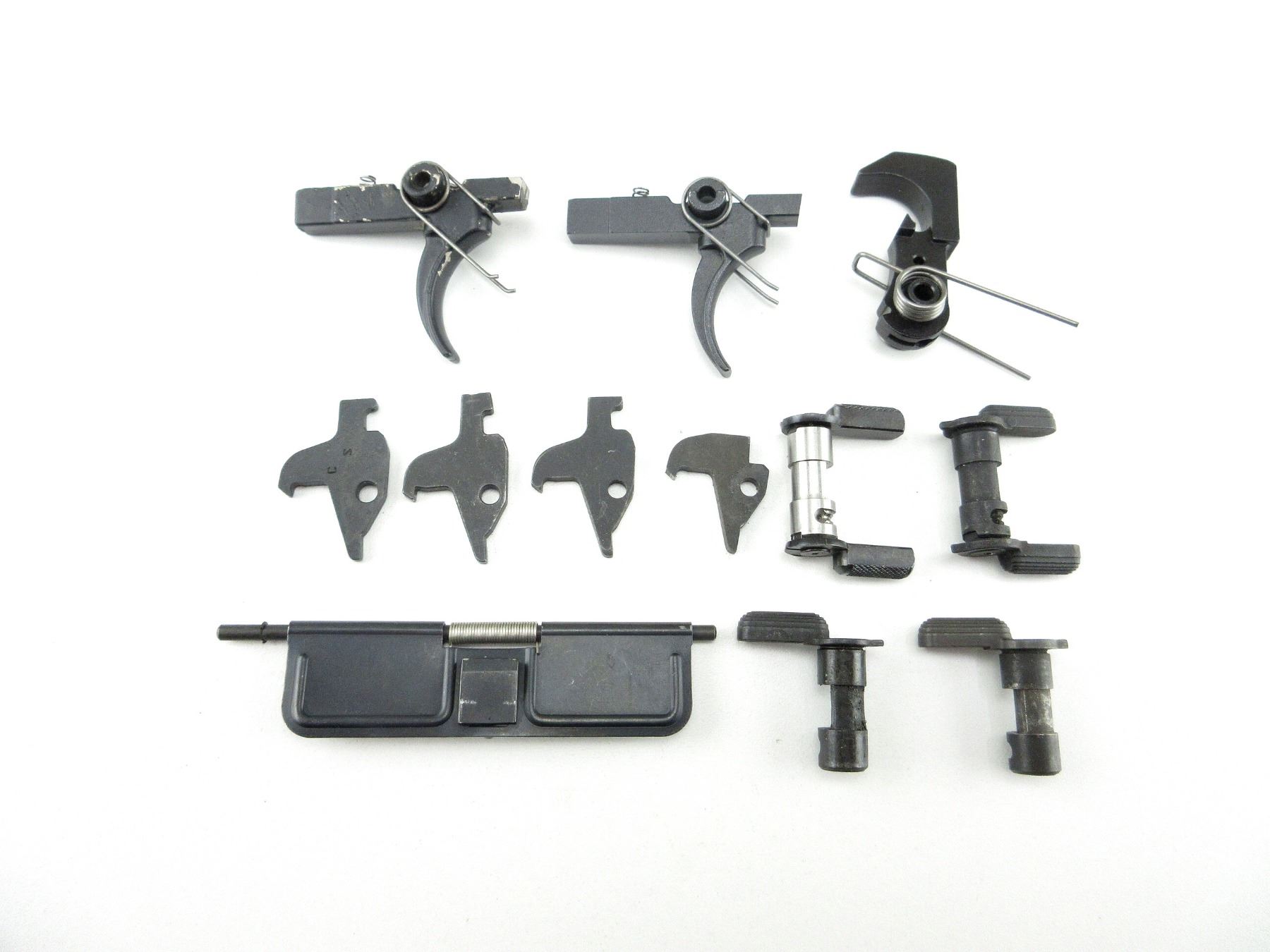 LOT INCLUDES; TRIGGERS WITH SPRINGS, AMBIDEXTROUS SAFETIES, STANDARD SAFETIES, DISCONNECTORS, HAMMER WITH SPRING, EJECTION PORT COVER ASSEMBLY, ETC. MAY REQUIRE FITTING. SEE PHOTOS.