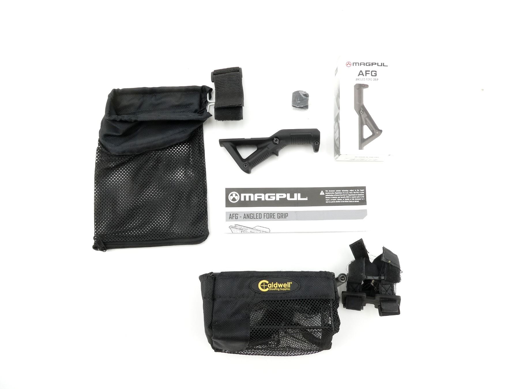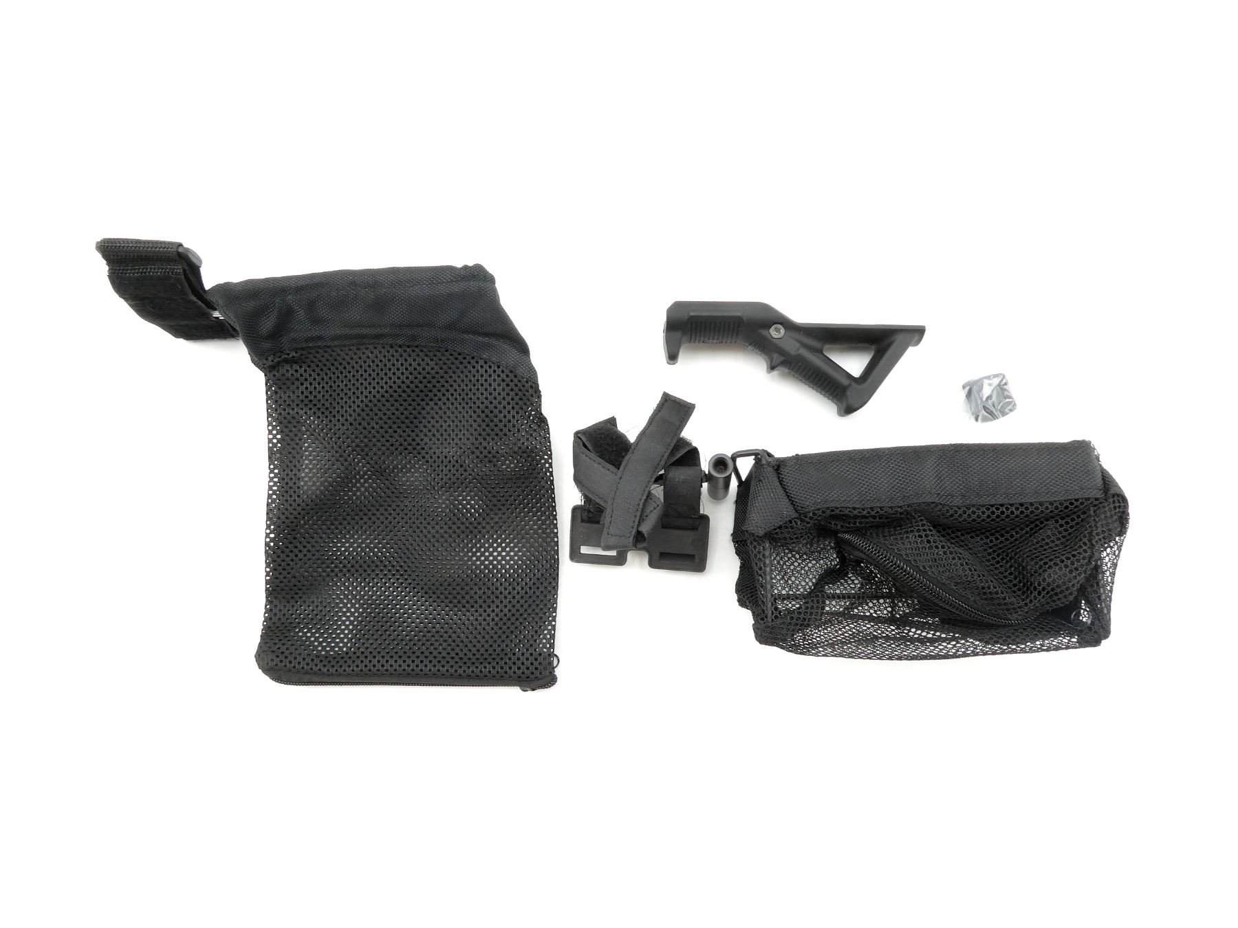 LOT INCLUDES; (1) MAGPUL ANGLED FORE GRIP, BLACK POLYMER CONSTRUCTION, IN ORIGINAL PACKAGING, (1) CALDWELL BLACK NYLON & METAL BRASS CATCHER BAG & (1) UNKNOWN BLACK NYLON BRASS CATCHER BAG. MAY REQUIRE FITTING. SEE PHOTOS.