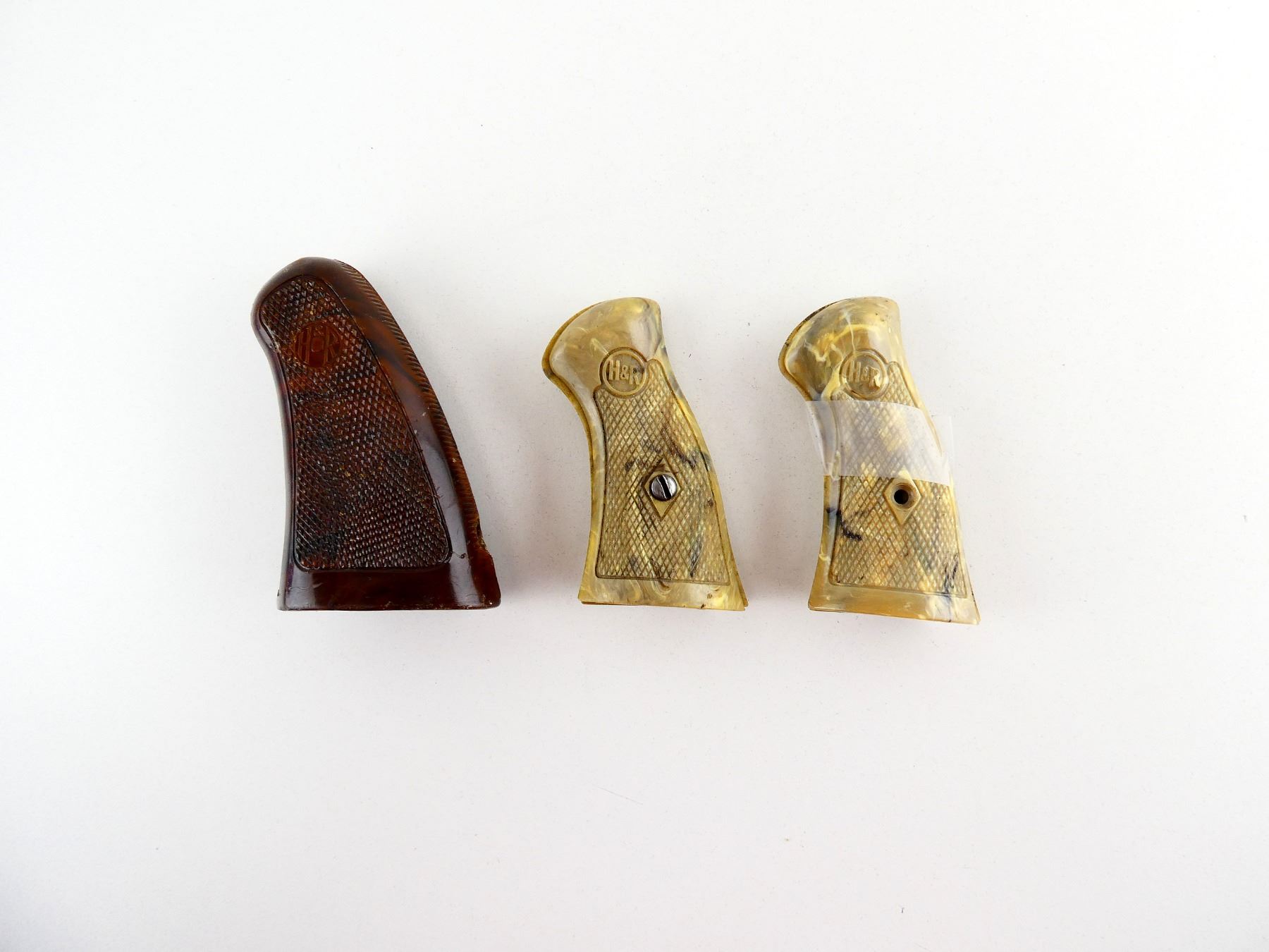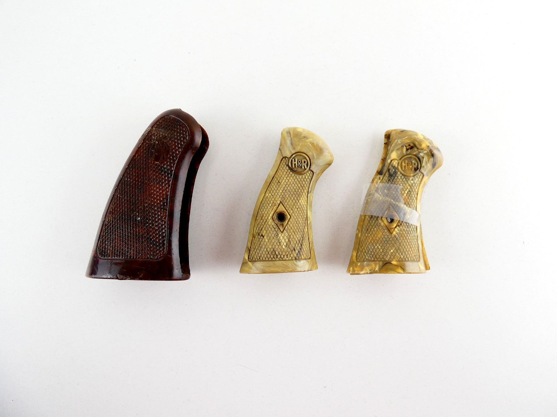 LOT INCLUDES; (1) H&R 922 CHECKERED BROWN RESIN MONO GRIP, NO SCREW & (2) SETS OF H&R UNKNOWN CHECKERED POLYMER GRIPS, ONE WITH SCREW. MAY REQUIRE FITTING. SEE PHOTOS.