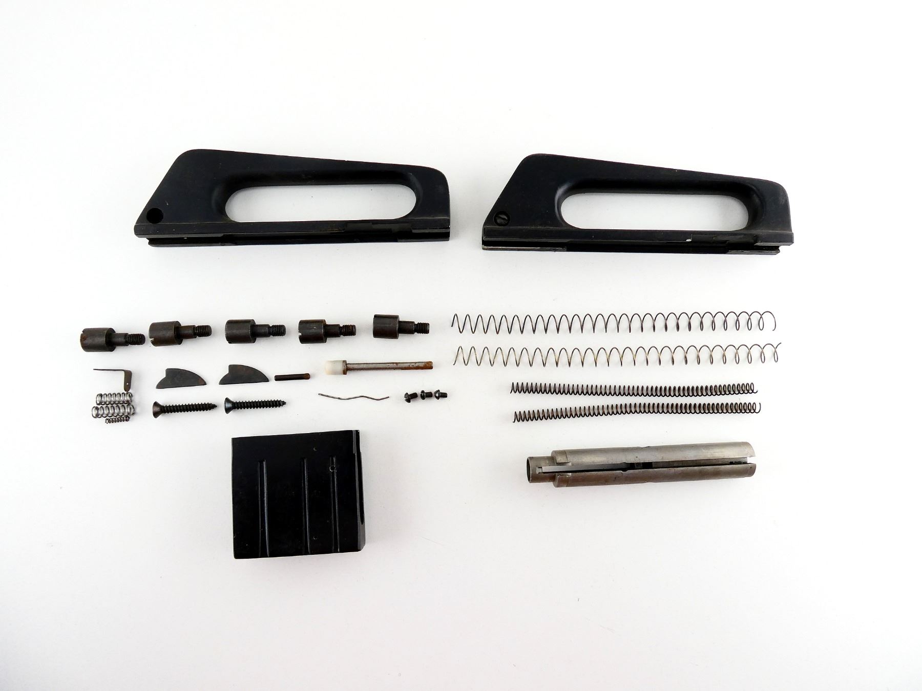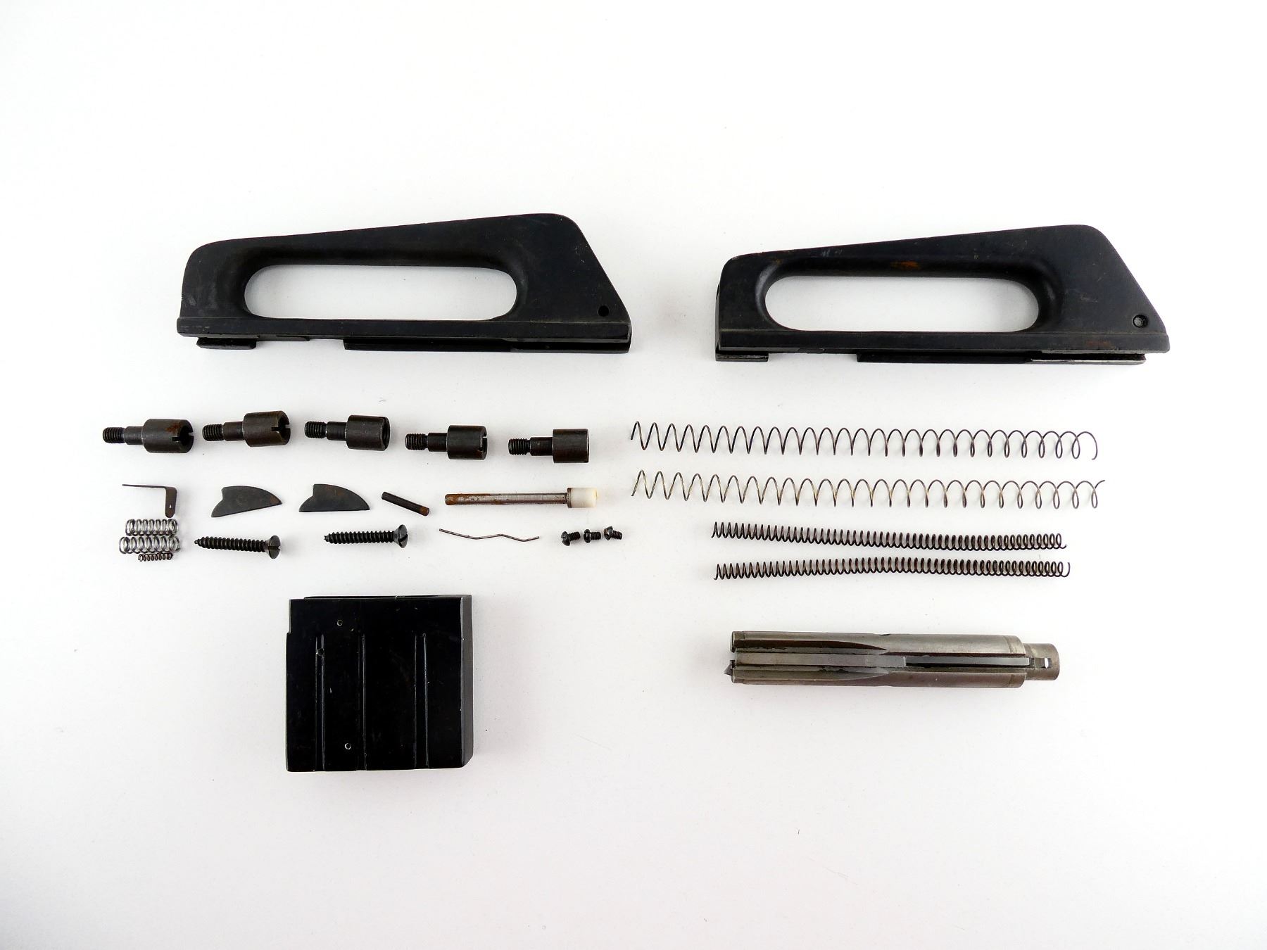 LOT INCLUDES; CARRYING HANDLES, STRIPPED BOLT, MAG BLOCK, FIRING PIN SPRINGS, RETURN SPRINGS, VARIOUS PINS / SCREWS / SPRINGS, ETC. MAY REQUIRE FITTING. SEE PHOTOS.
